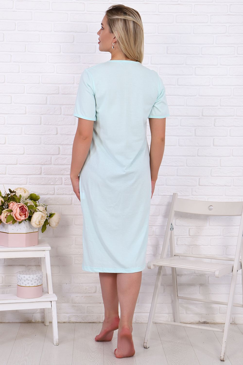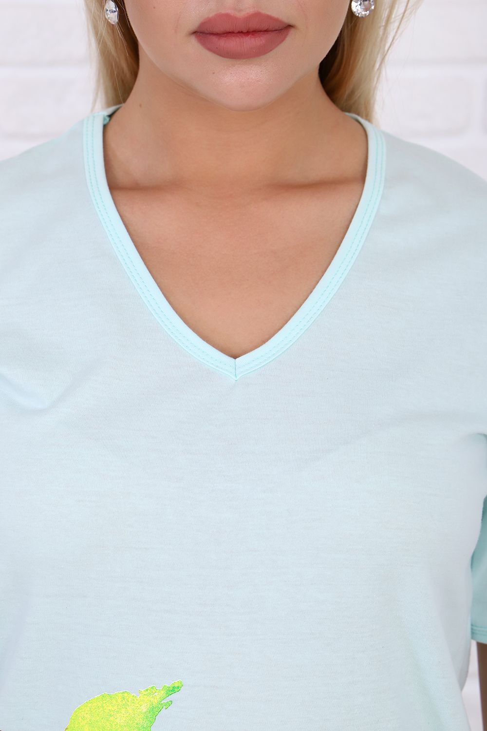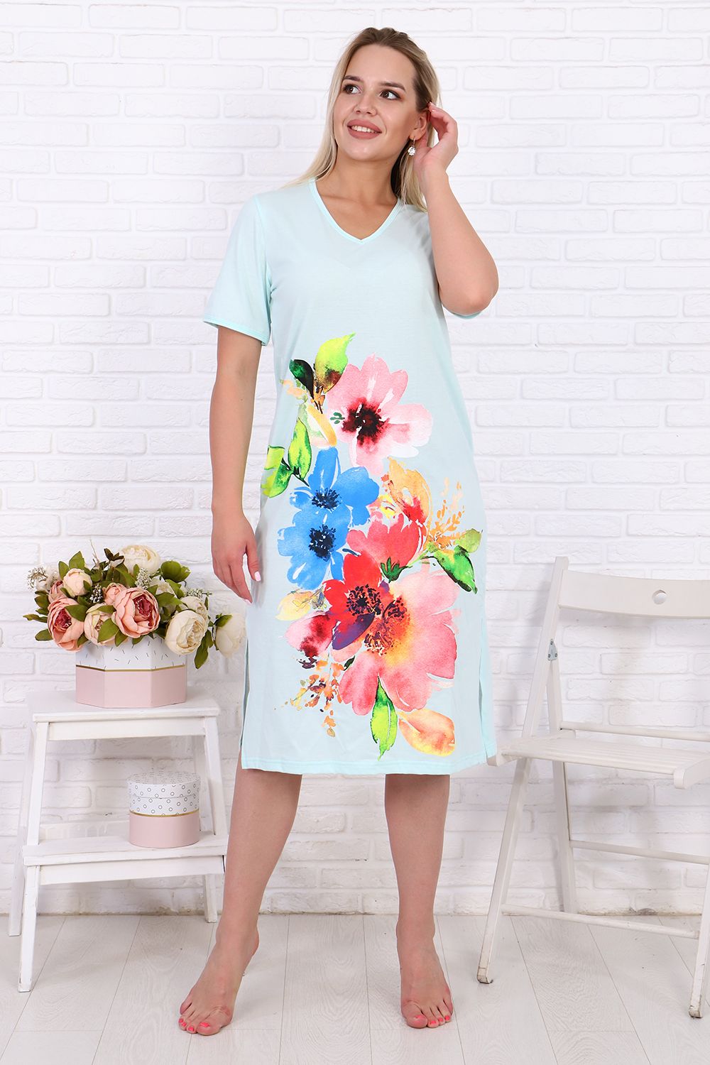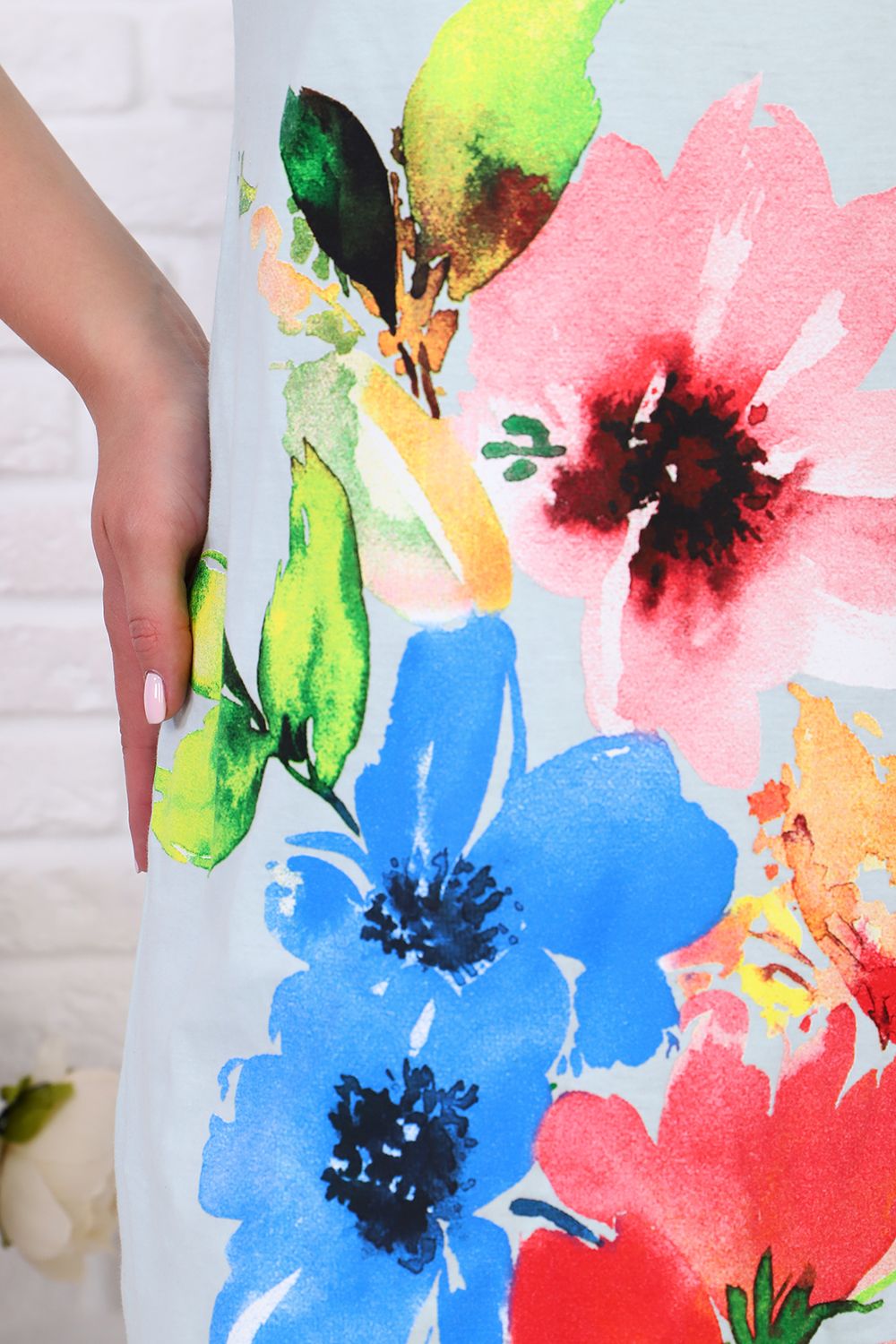 Длинная сорочка из кулирки, V-образная горловина обработана кантом. Разрезы по бокам, короткие рукава, на полочке большой яркий принт в виде цветов