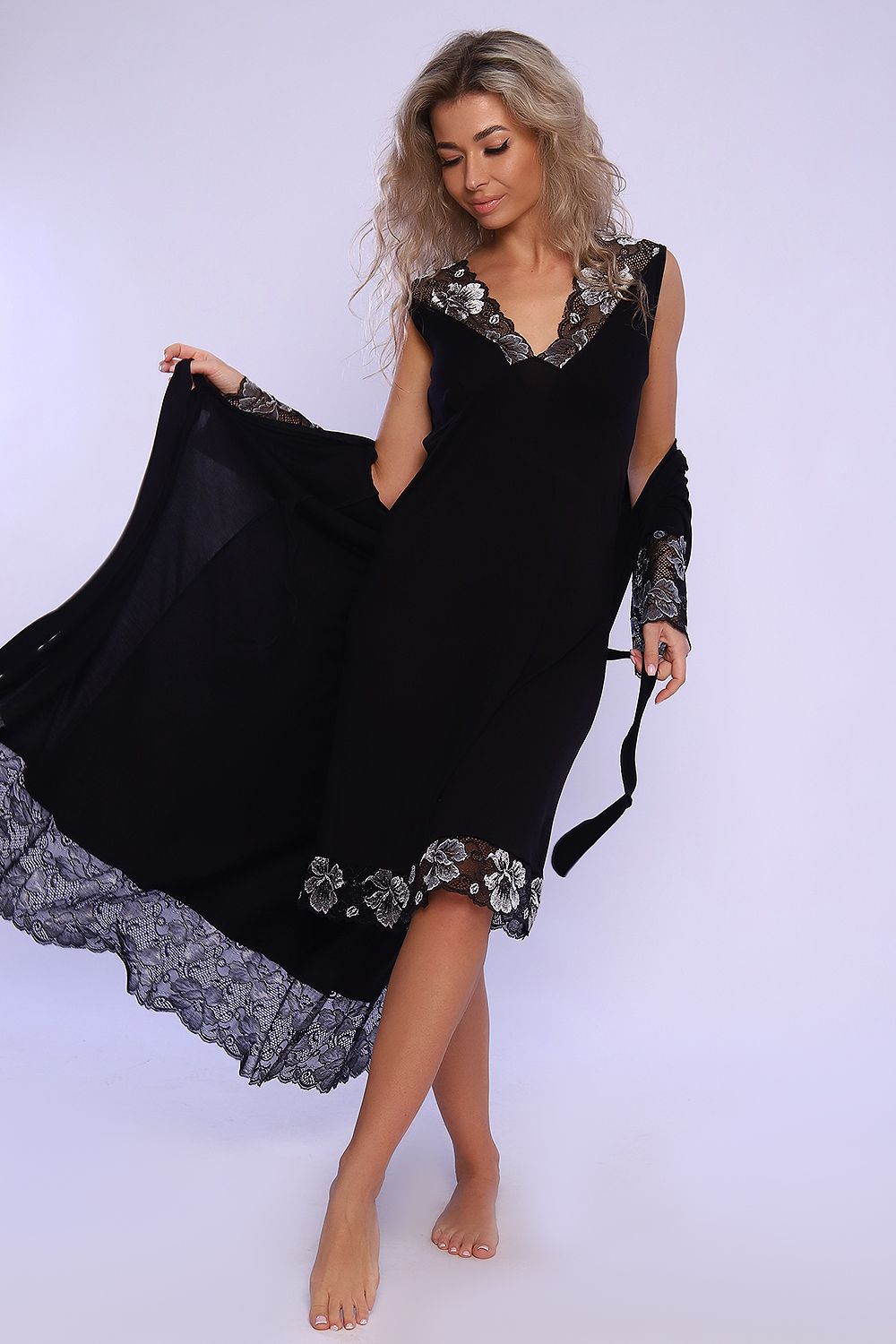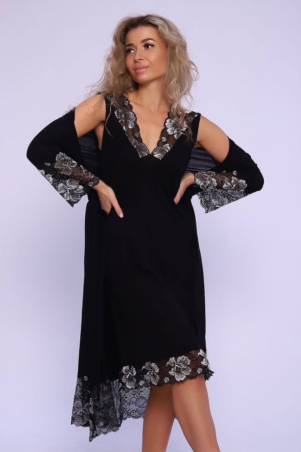 Ночная сорочка из вискозы, под грудью подрез со складкой, по груди кружево, длина ниже колена оформлена так же кружевом. Размеры сдвоенные. На модели 46 размер. Модель ночной идеально подойдет к модели 78537.