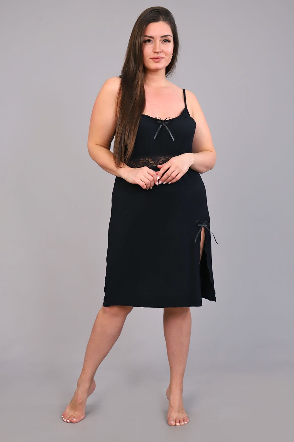 Сорочка ночная с эластичным кружевом из однотонной вискозы. Изящная модель на узких бретелях, с кружевом чуть ниже груди и разрезом на передней полочке. Декольте, разрез и низ сорочки обработаны волнистым краем. Сорочка уютная, комфортная для сна.