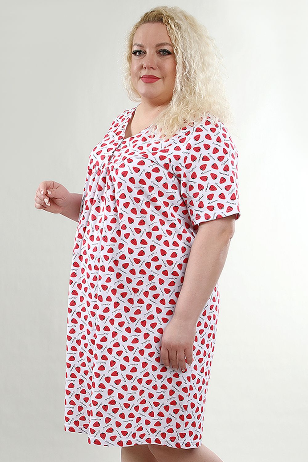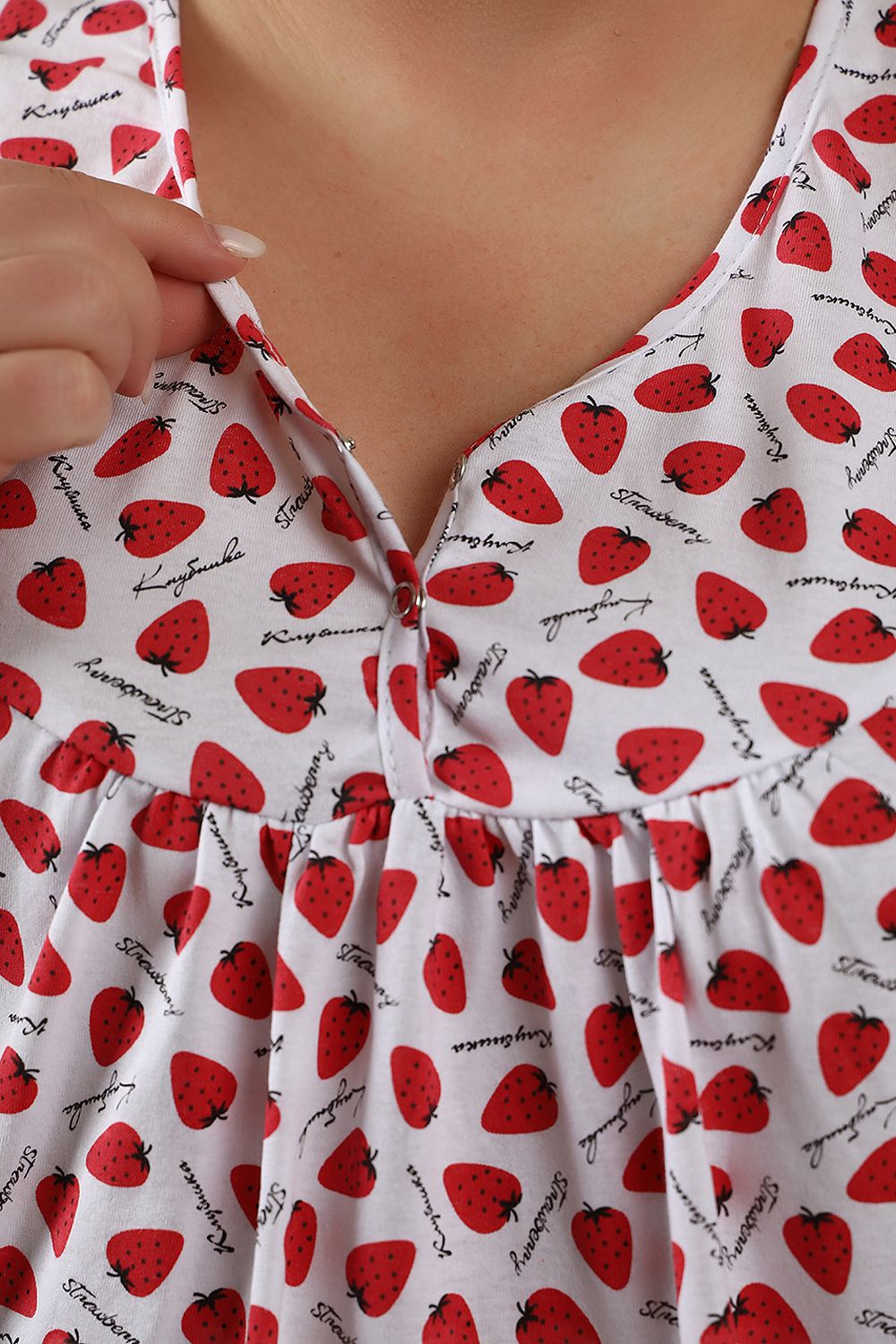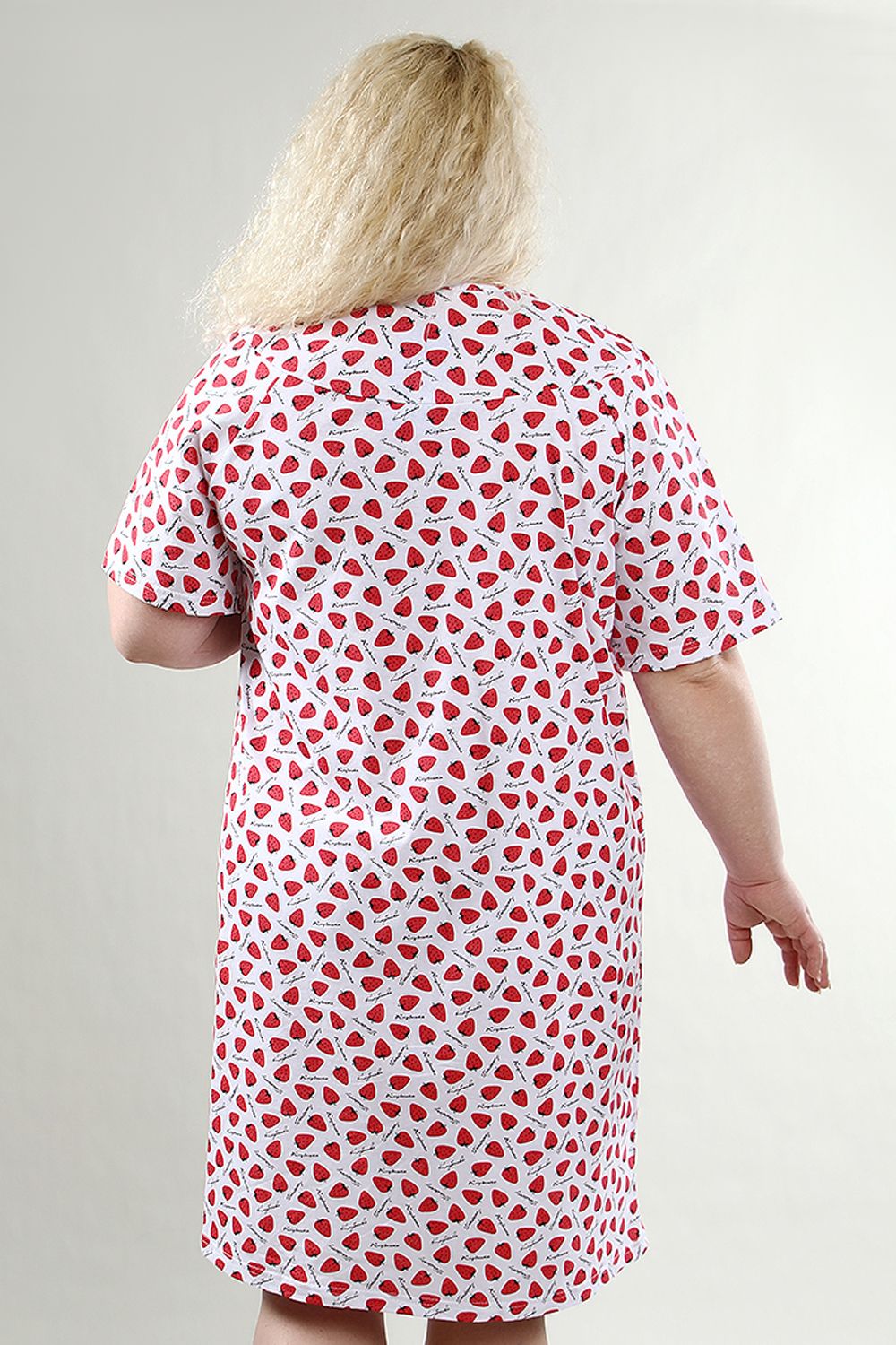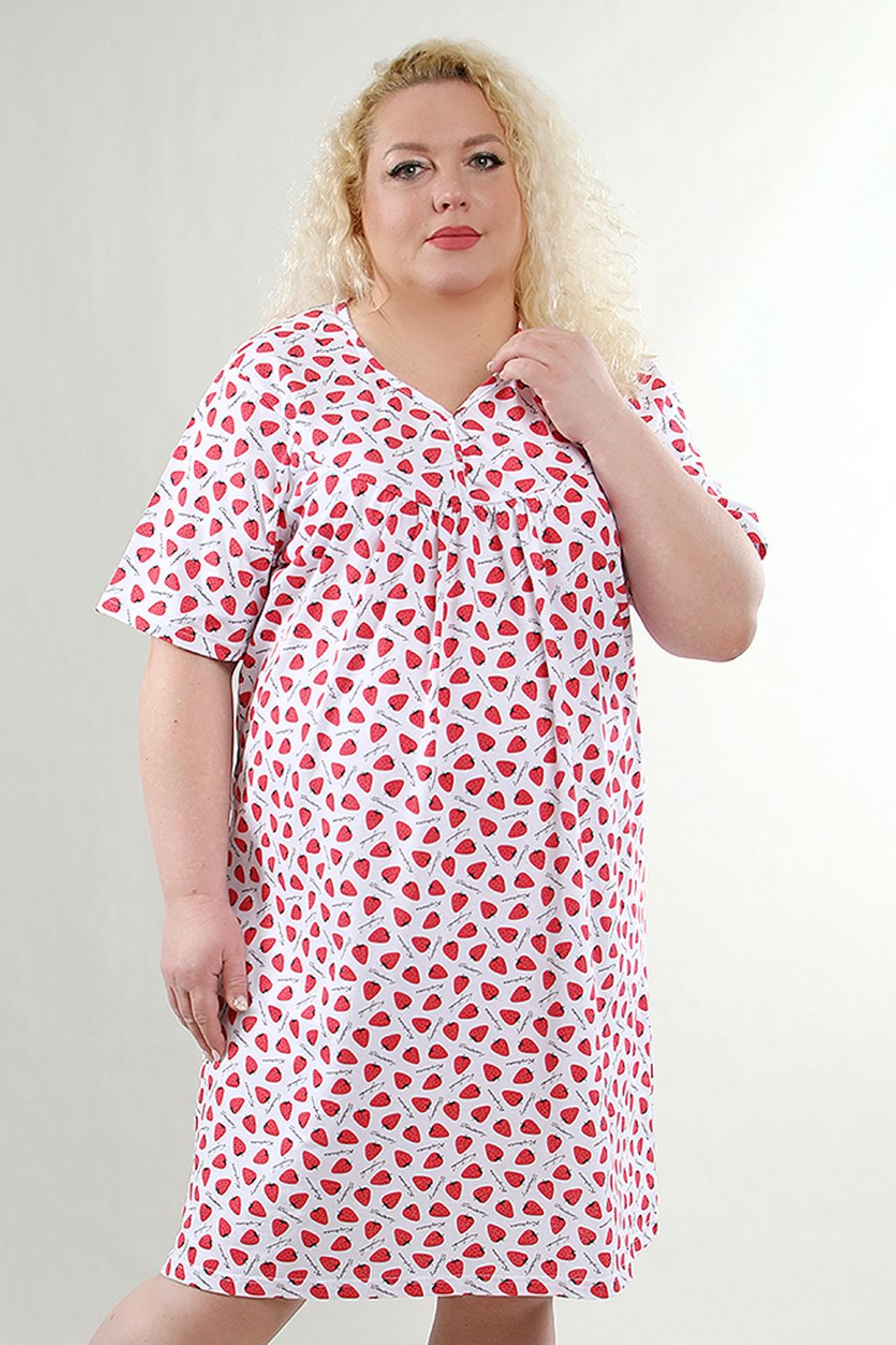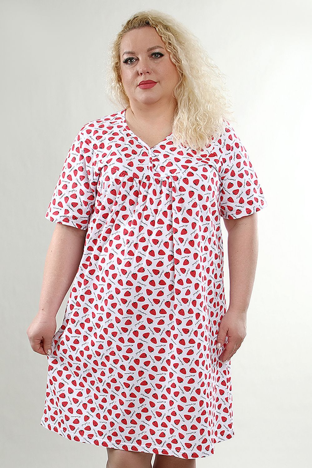 Сорочка женская с коротким рукавом. Данная модель выполнена из трикотажного полотна кулирка (хлопок 100%). Покрой реглан с отрезной полочкой. Горловина фигурная обработанная окантовкой из основной ткани. На кокетке присутствуют кнопки. Отличная модель для сна и дома.