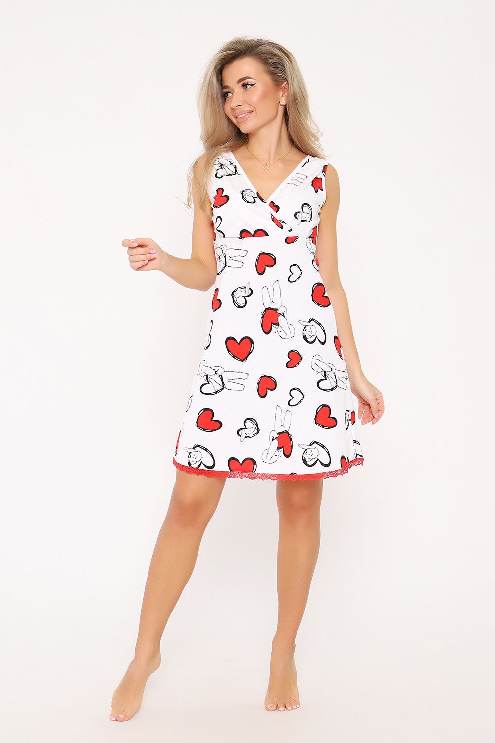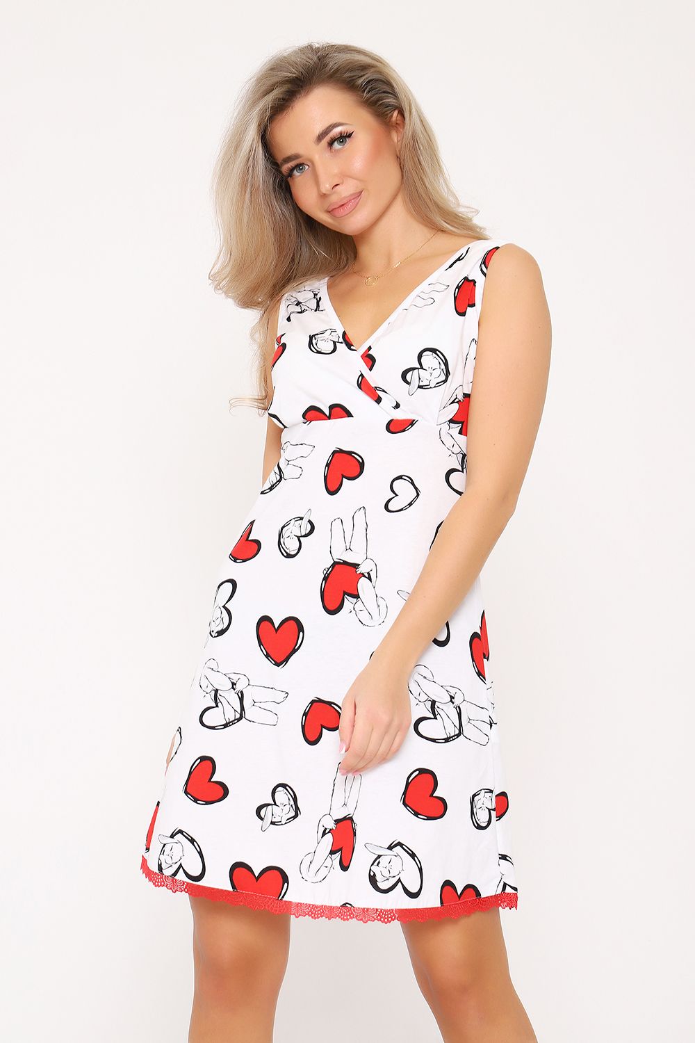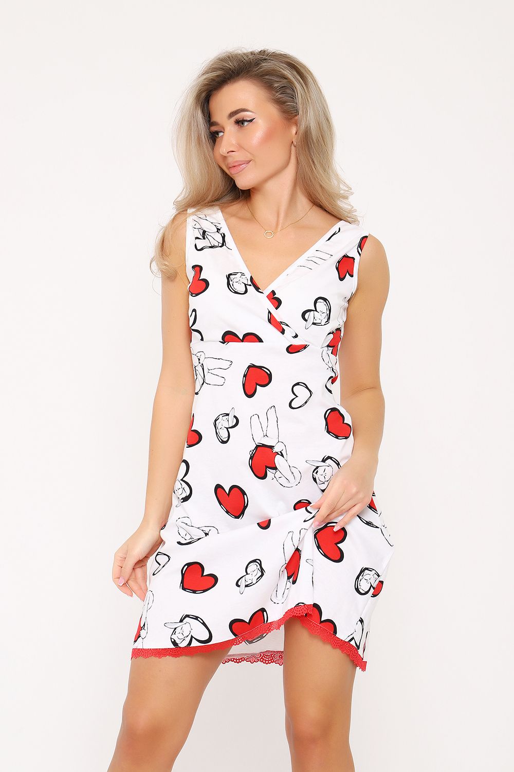 Сорочка женская без рукавов с V-образным вырезом. Данная модель выполнена из трикотажного полотна кулирка (хлопок 100%) . Полочка отрезная , горловина на запах. Низ изделия обработан изящным кружевом. Отличная модель для сна и для романтического настроения .
