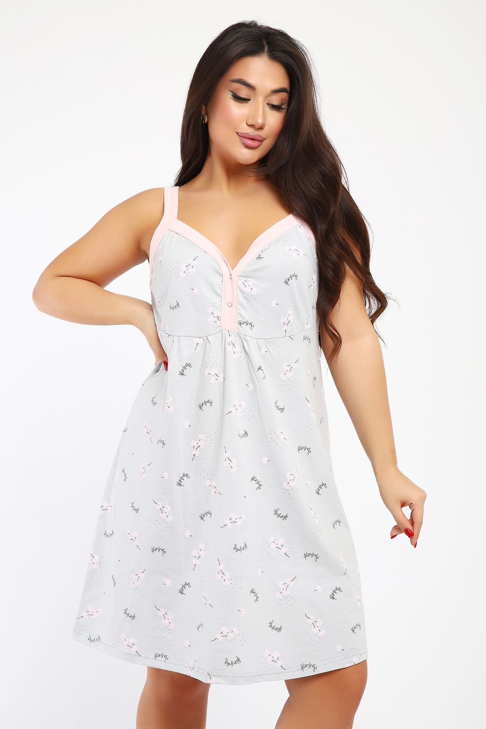 Сорочка женская без рукава на брителях . Данная модель выполнена из трикотажного полотна кулирка ( хлопок 100%). Полочка отрезная с кнопками. Горловина обработана широкой окантовкой. Отличная модель для сна и кормления.