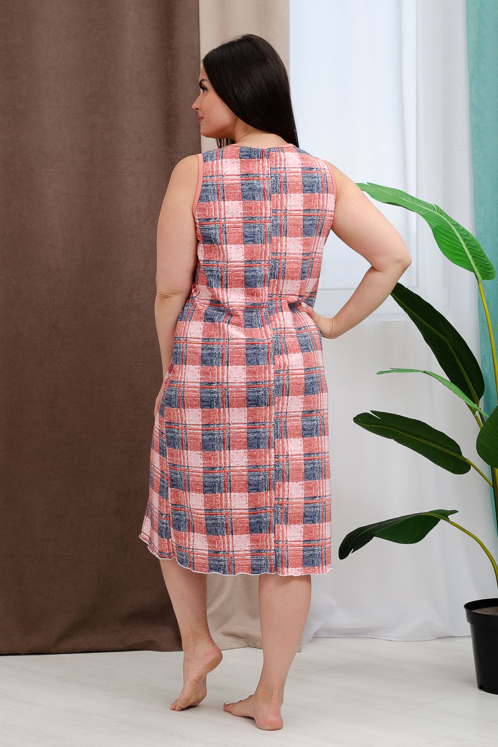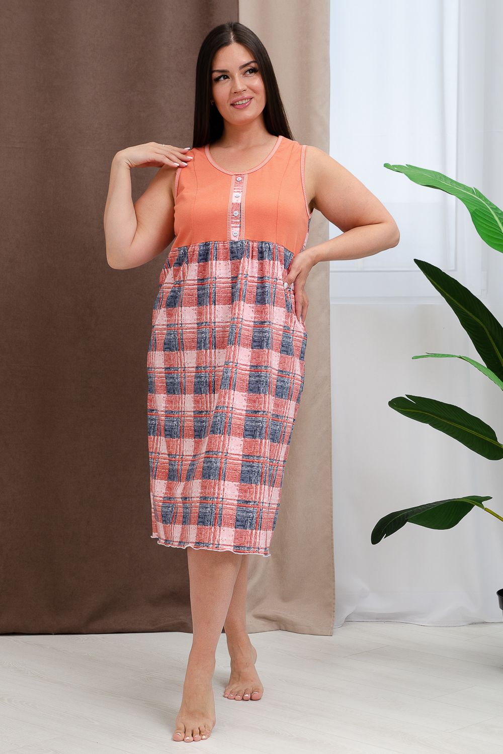 Сорочка женская прямого силуэта, без рукава. В верхняя часть сорочки из отделочной ткани, с рельефами, на планке три пуговицы. Для обеспечения достаточной свободы нижняя часть полочки со сборкой.