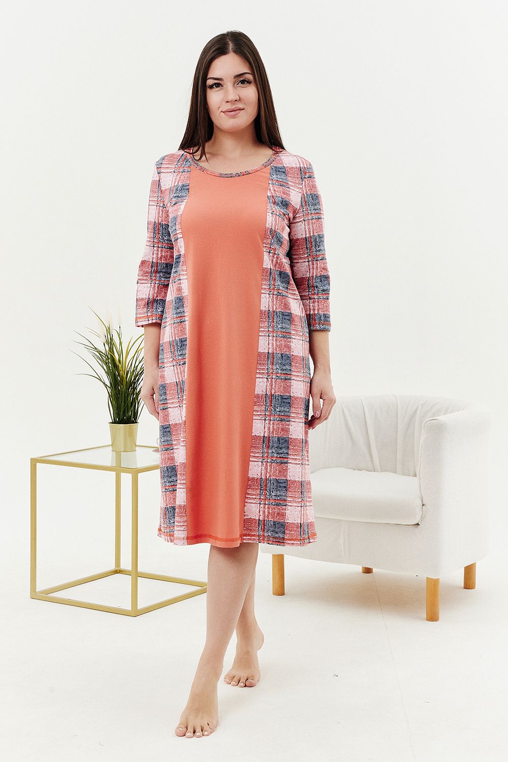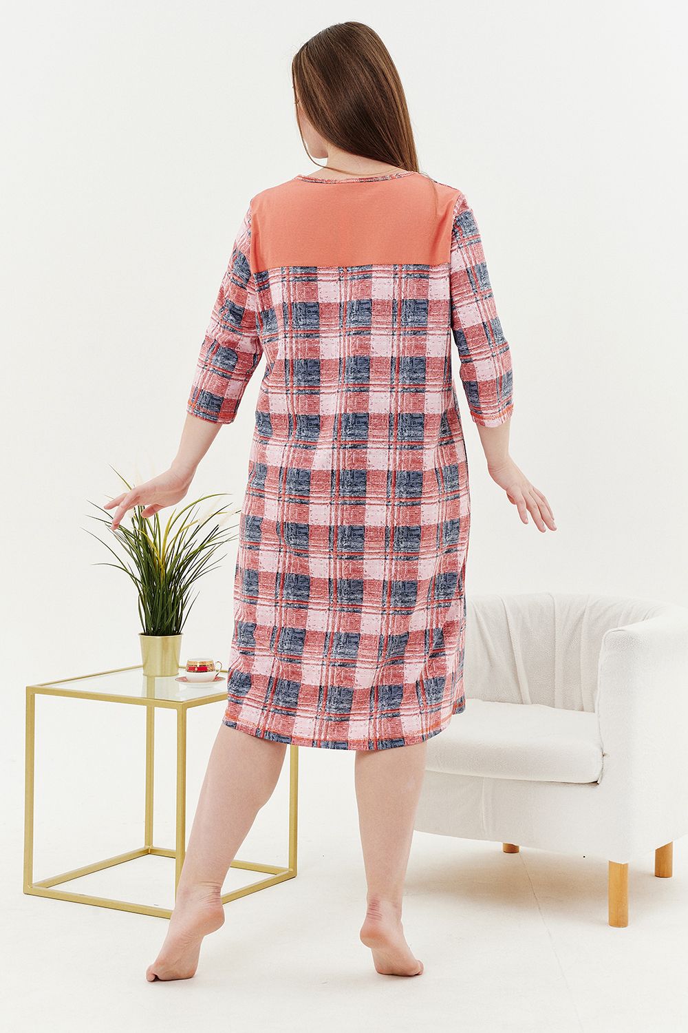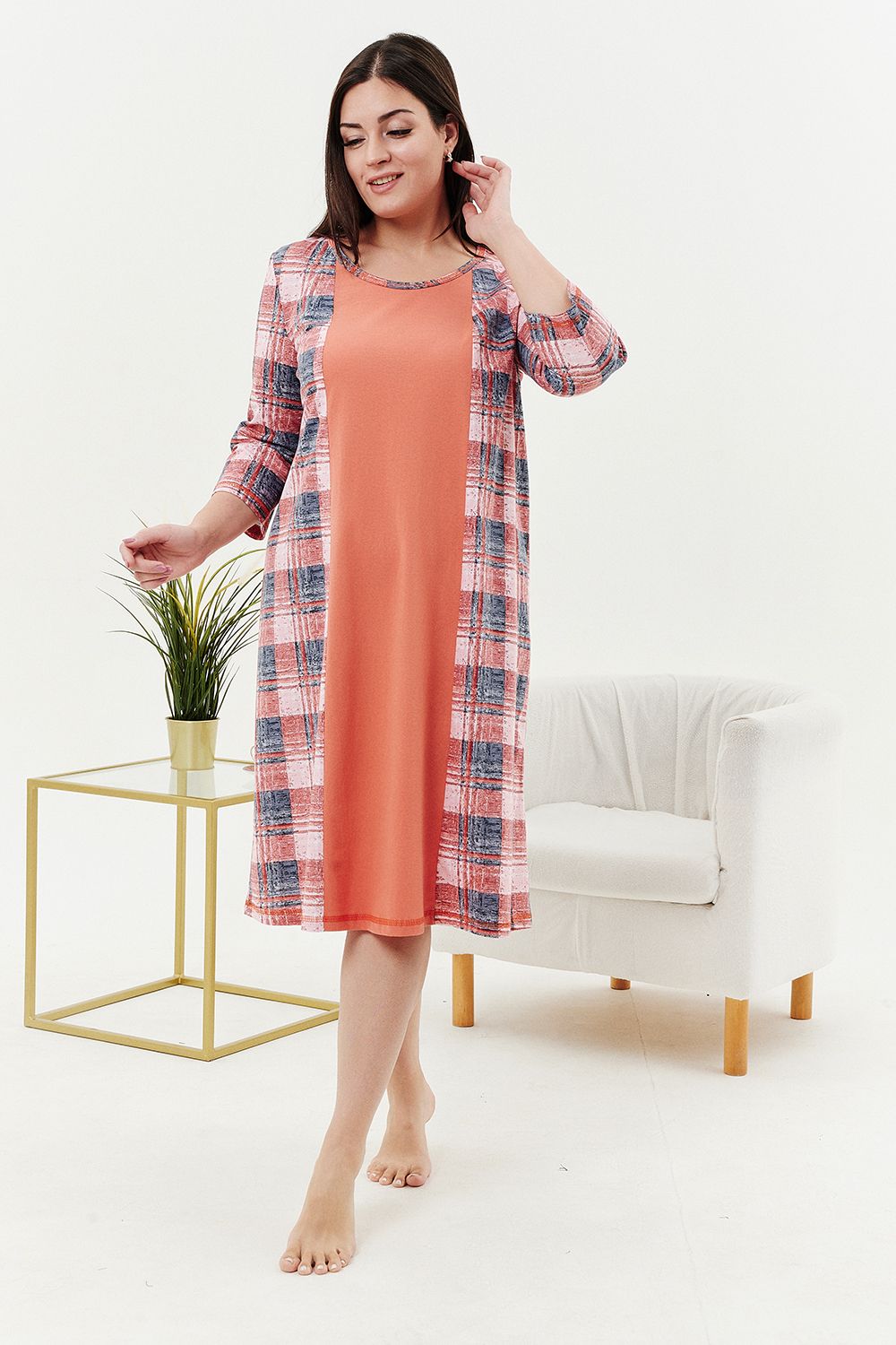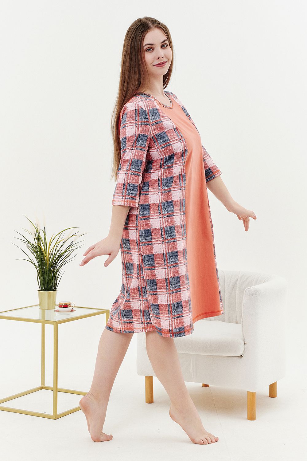 Сорочка женская, расширенная к низу. На полочке рельефы, на спинке кокетка. Рукав втачной, длина 3/4. Благодаря сочетанию тканей-компаньонов: однотонного персика и клетки сорочка выглядит стильно и по-домашнему комфортно.
