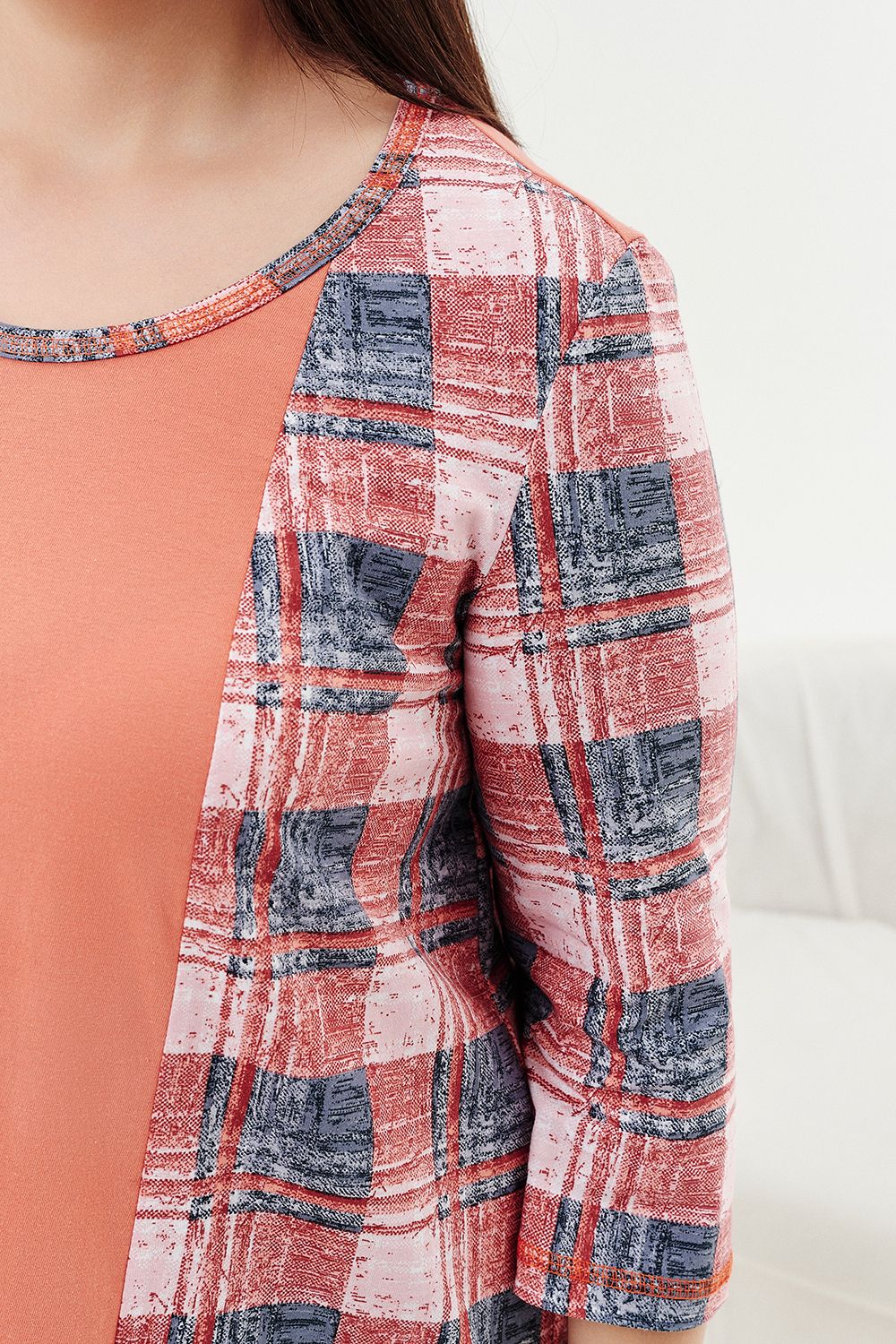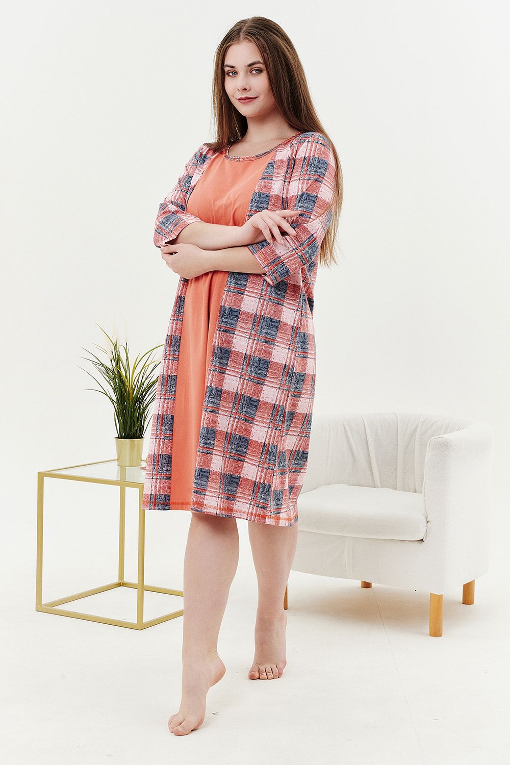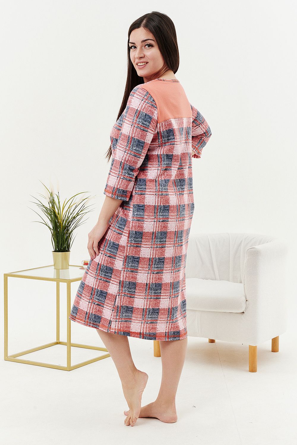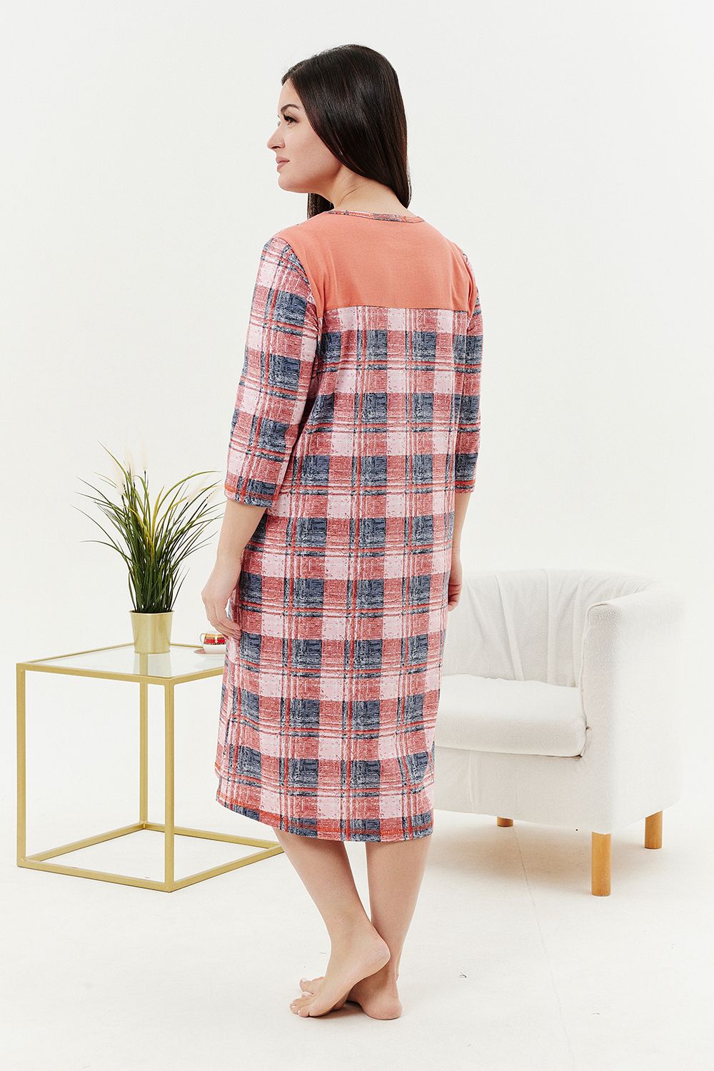 Сорочка женская, расширенная к низу. На полочке рельефы, на спинке кокетка. Рукав втачной, длина 3/4. Благодаря сочетанию тканей-компаньонов: однотонного персика и клетки сорочка выглядит стильно и по-домашнему комфортно.
