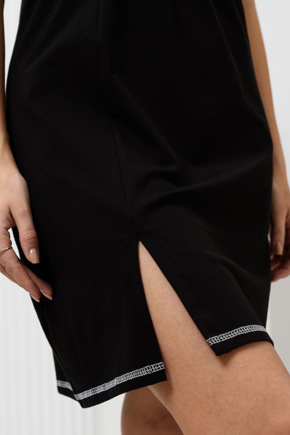 Сорочка на бретелях, полуприлегающего силуэта, длиной выше колена. Полочка с кокетками из отделочного полотна, под грудью собрана на резинку. Спинка с кокеткой. В нижней части рельефного шва полочки обработан разрез. Проймы, бретели обработаны бейкой из отделочного полотна.