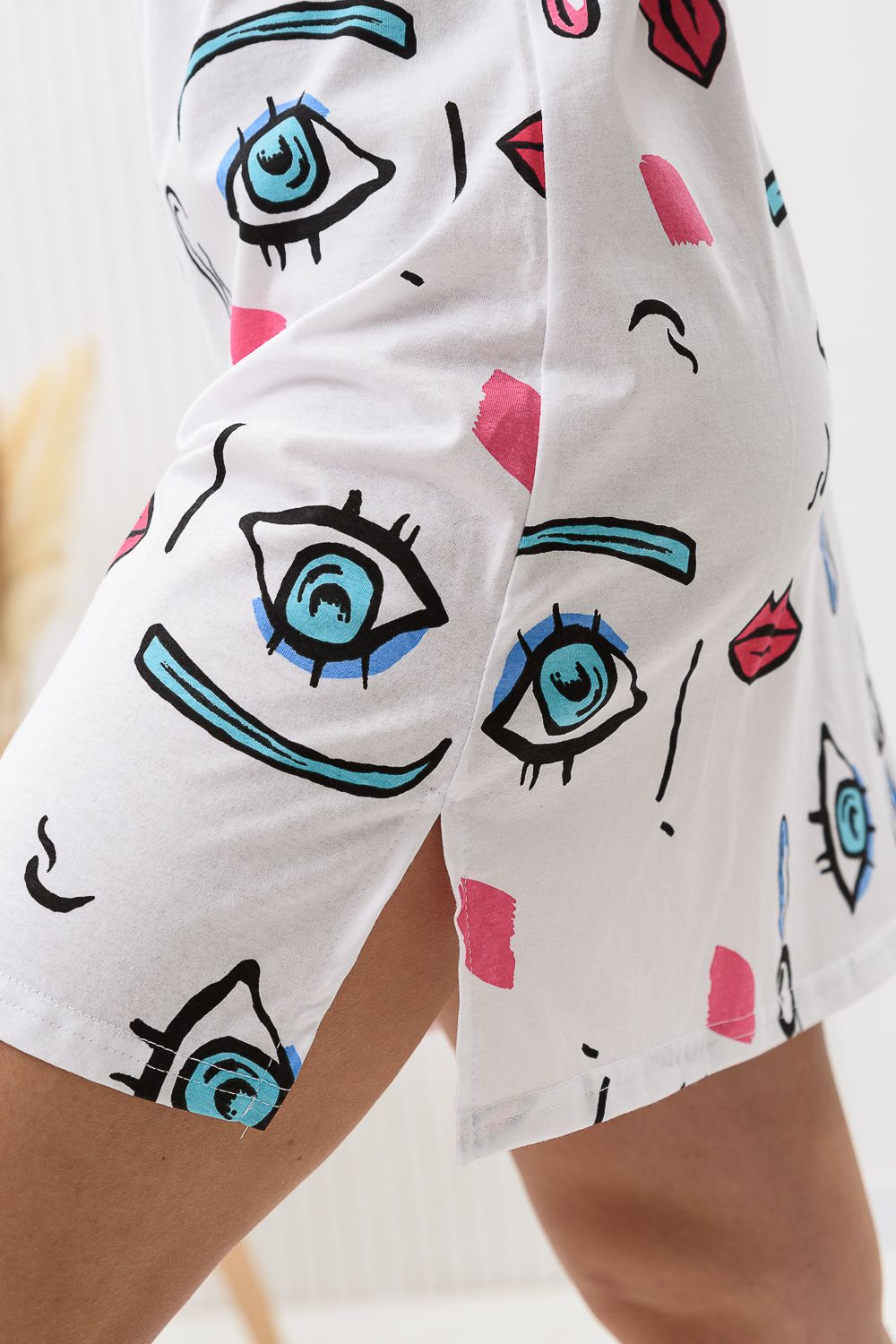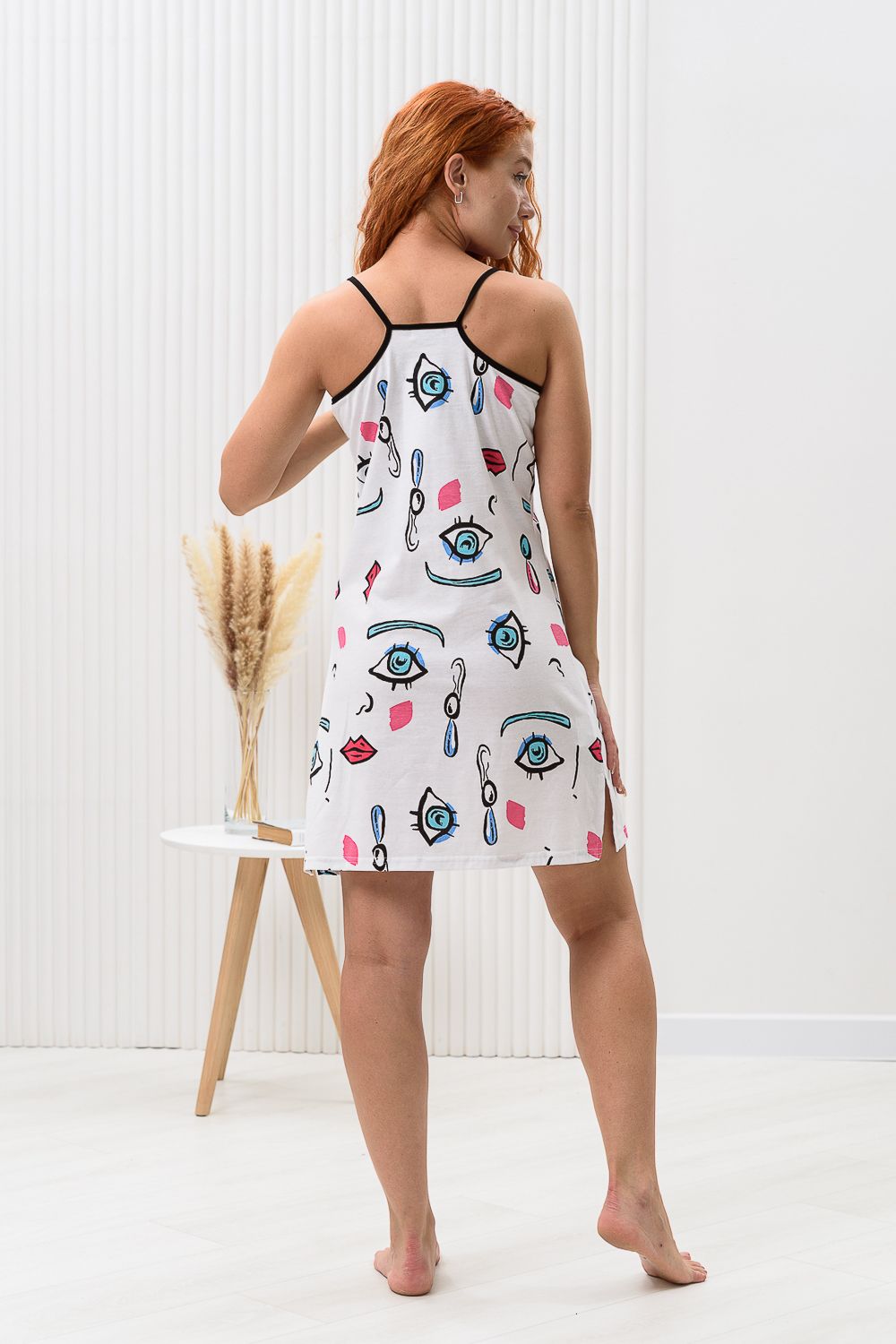 Сорочка на бретелях полуприлегающего силуэта, с разрезами в нижней части боковых швов, длиной выше колена. Полочка вверху с фигурными кокетками и вставкой из отделочного полотна. Проймы и бретели обработаны бейкой из отделочного полотна.