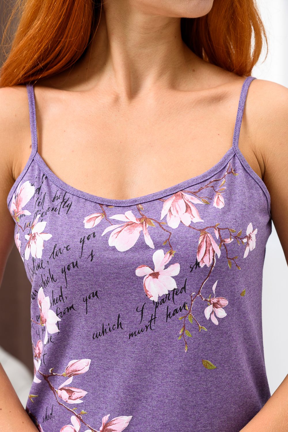 Сорочка на бретелях полуприлегающего силуэта, с фигурной линией низа, длиной выше колена. На полочке внизу обработан декоративный разрез. Проймы, бретели и разрез на полочке обработаны бейкой из основного полотна.