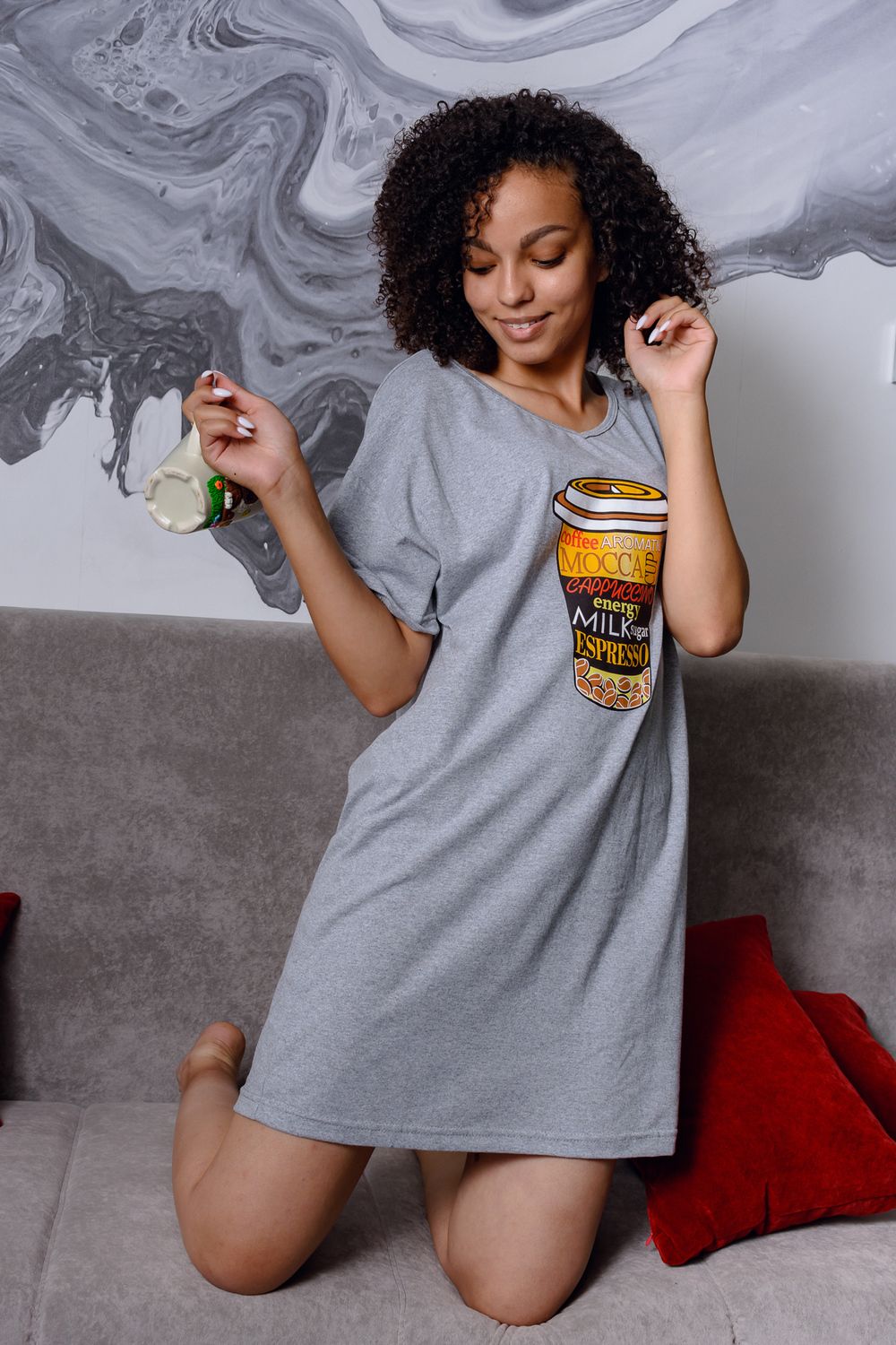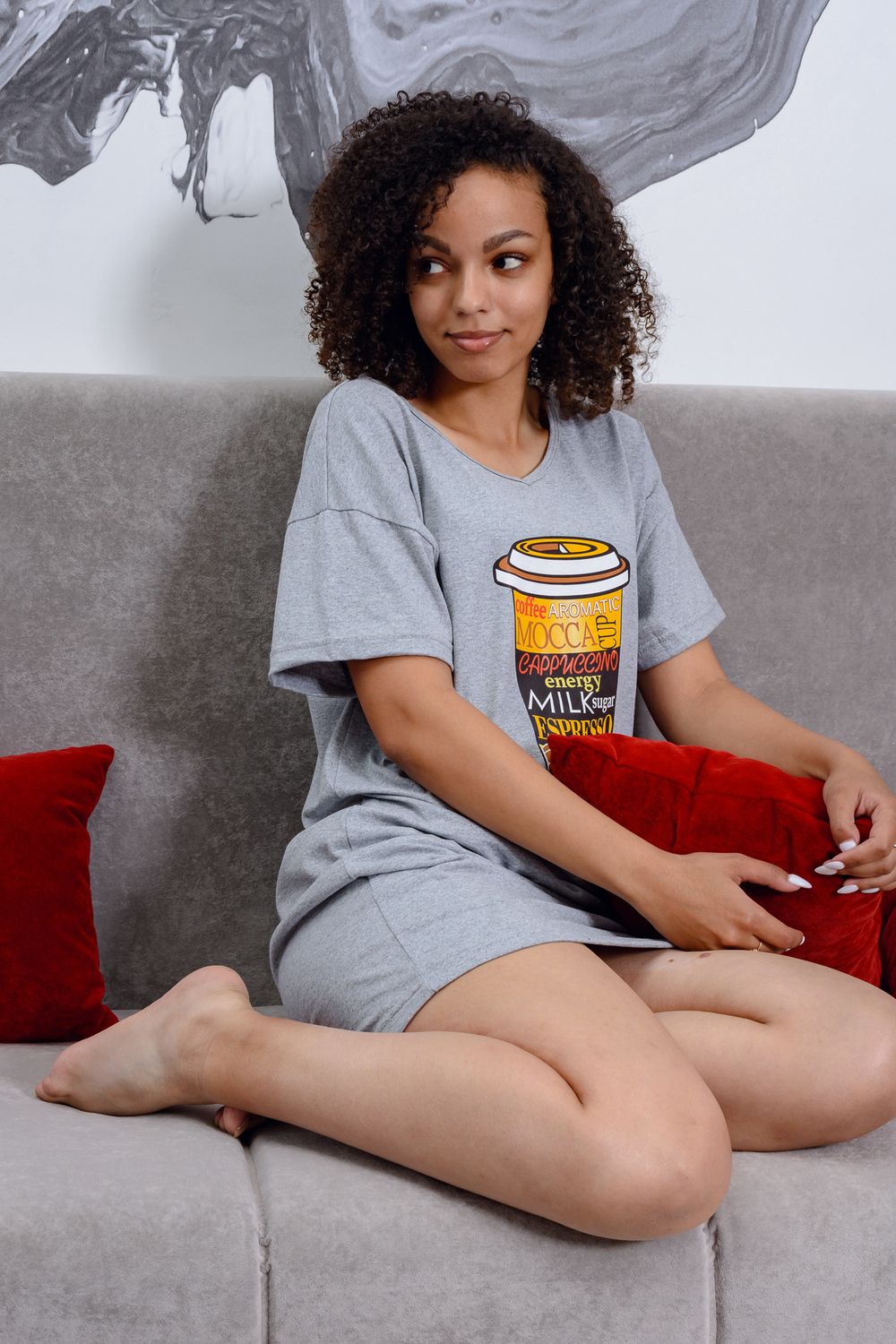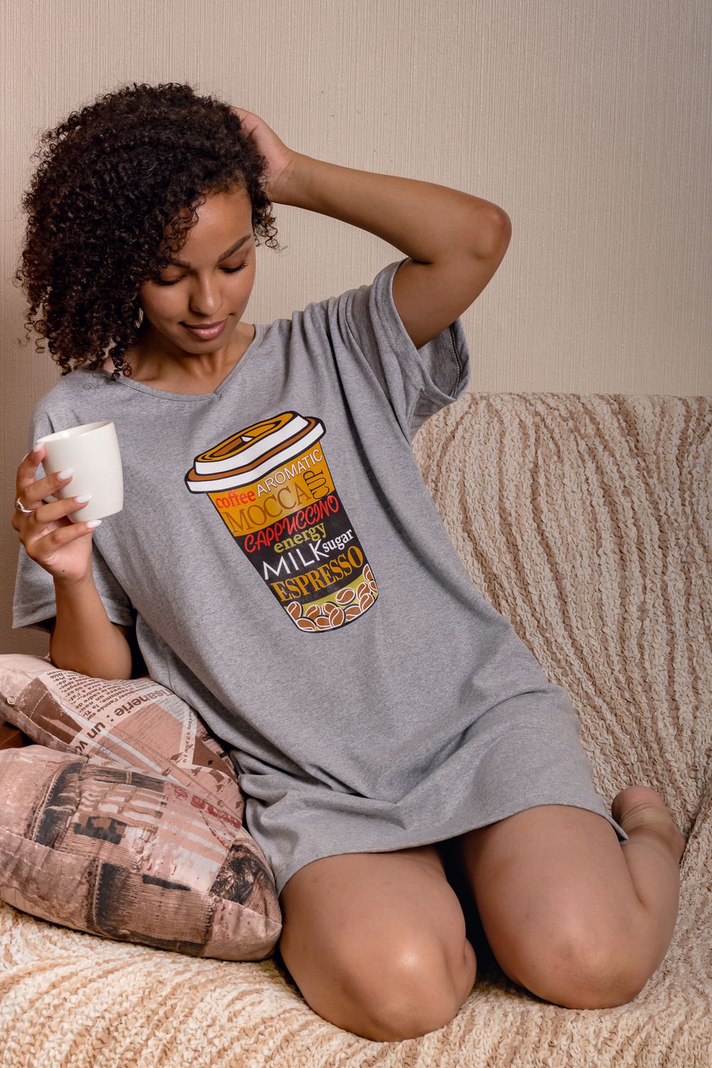 Молодёжная сорочка в виде удлинённой свободной футболки с современным принтом. Благодаря наличию в составе небольшого количества полиэстера сорочка не мнётся. Можно использовать в качестве домашней туники. Оттенок серого меланжа может отличаться
