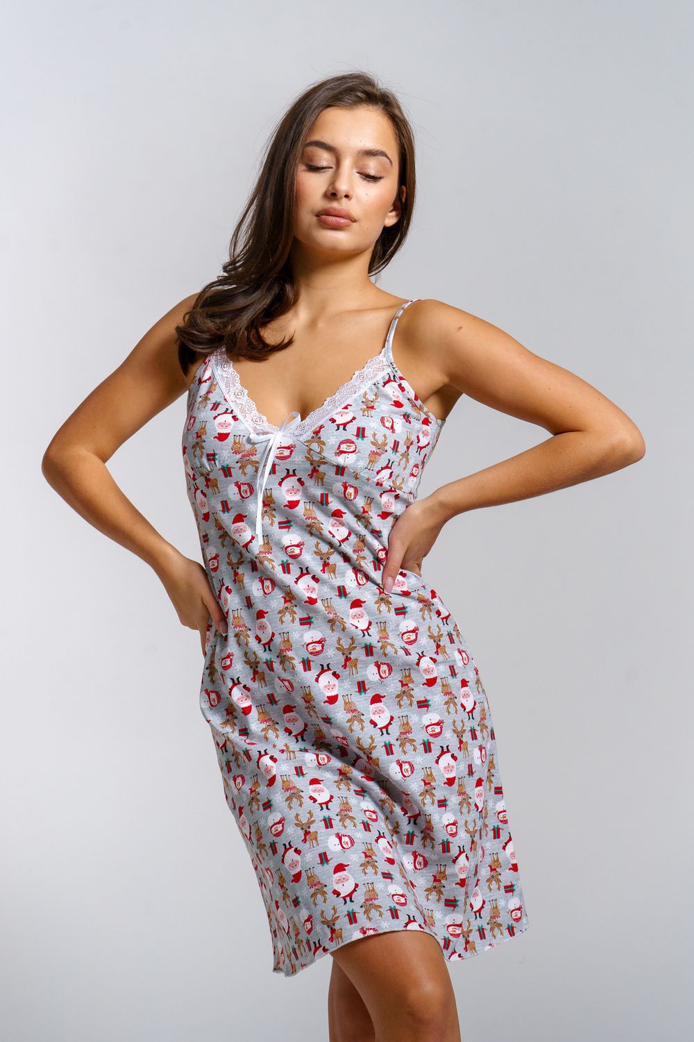 Женственная сорочка на бретелях из мягкого кулирного полотна с новогодним принтом. Чашки сорочки отрезные, верх которых обработан белым кружевом. Низ сорочки подшит специальным швом.