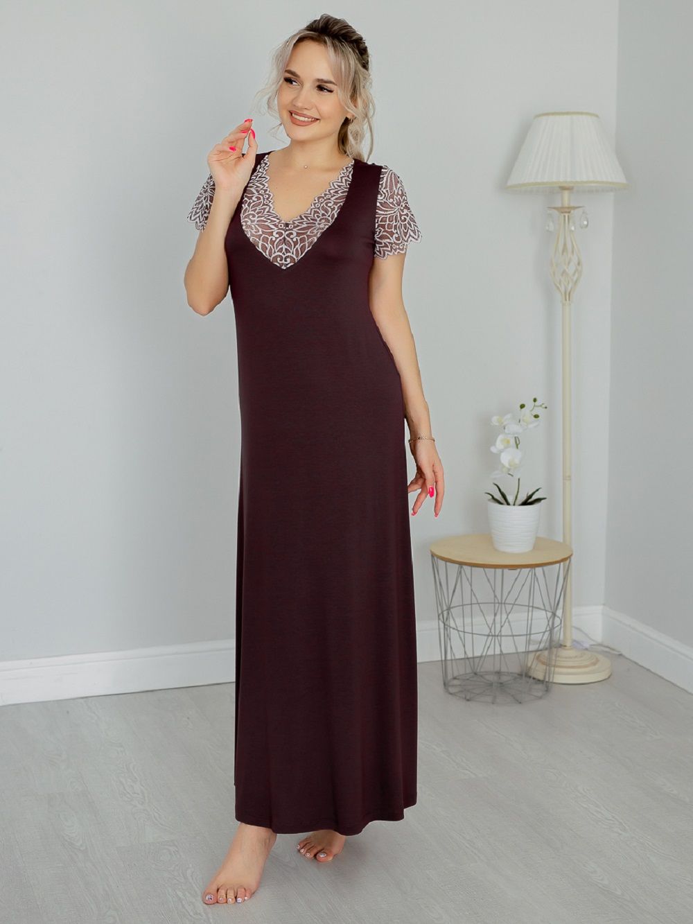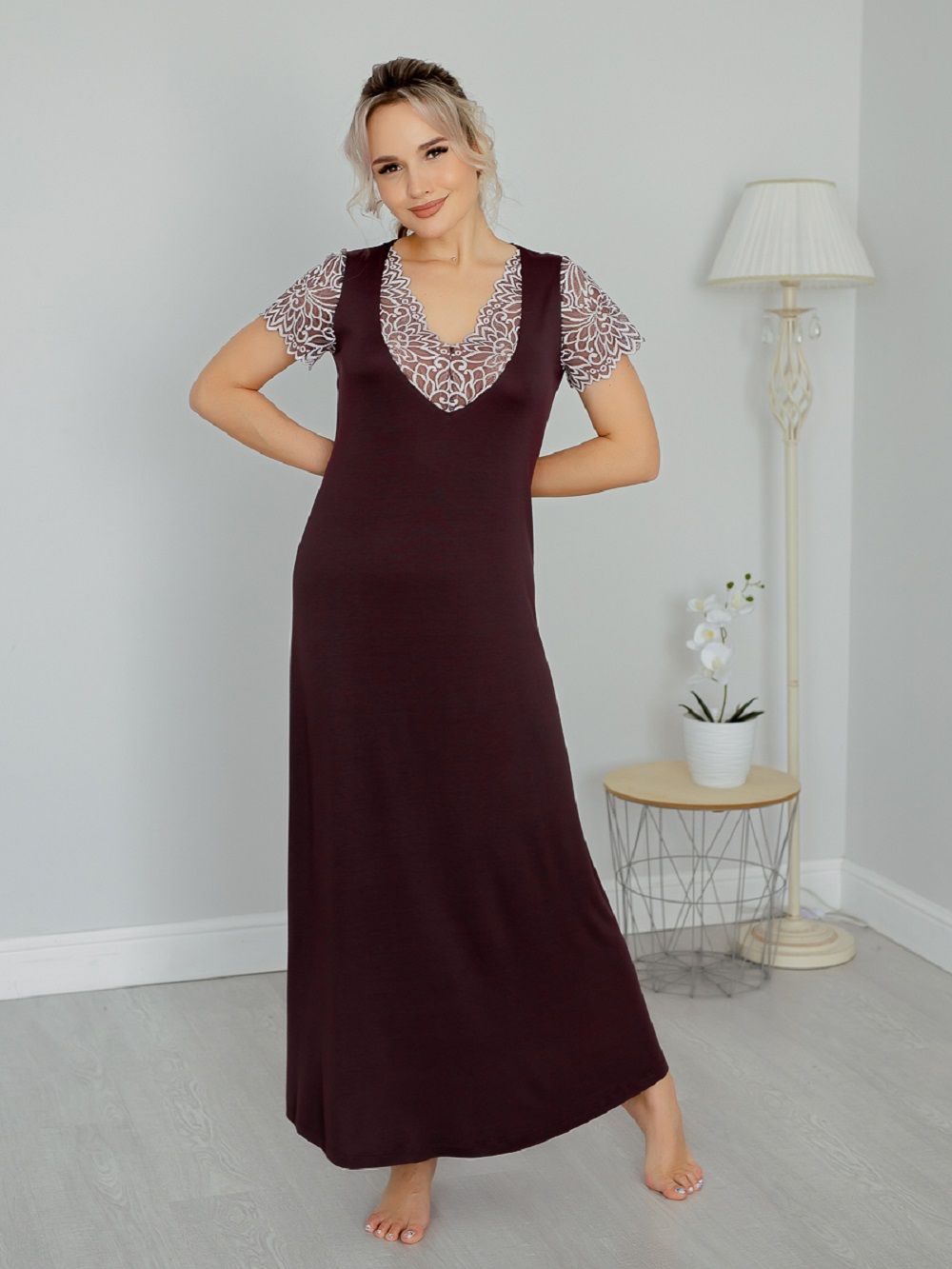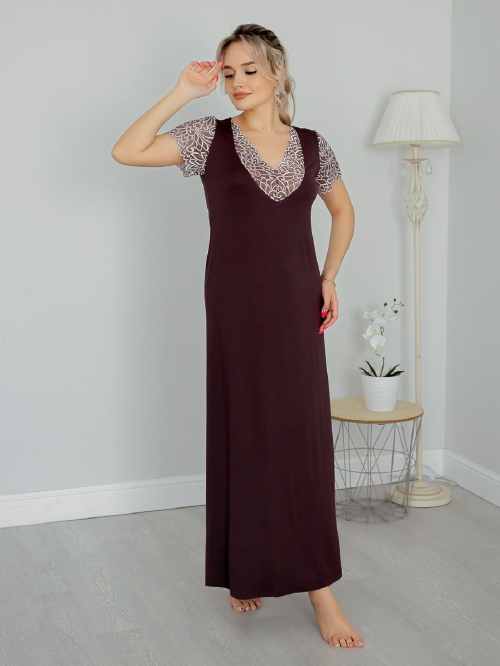 Ночная сорочка женская длинная из вискозного полотна. Ночная сорочка А-силуэта полуприталенного кроя. Эффектная и стильная сорочка для сна и отдыха – отличный наряд для дома. Короткие рукава и глубокий вырез горловины сделаны из эластичного кружева. Кружевной вырез эффектно подчеркивает зону декольте. Рубашка длинная, поэтому подойдет и на высоких. Состав ткани 92 % вискоза и 8 % эластан. Ночную сорочку удобно надеть и для сна и использовать как домашнее платье. Ночная рубашка представлена большим размерным рядом, в продаже размеры с 44 по 62. Натуральная шелковистая ткань позволяет коже дышать, превращает сорочку в комфортную одежду для дома. Эластичное и эффектное кружево добавляет ночной сорочке сексуальности и женственности. Домашняя одежда для женщин может быть красивой и сексуальной. Вискоза отлично тянется, а это значит, что сорочка подойдет для беременных и кормящих, возьмите ее с собой в роддом и будете самой элегантной мамочкой.