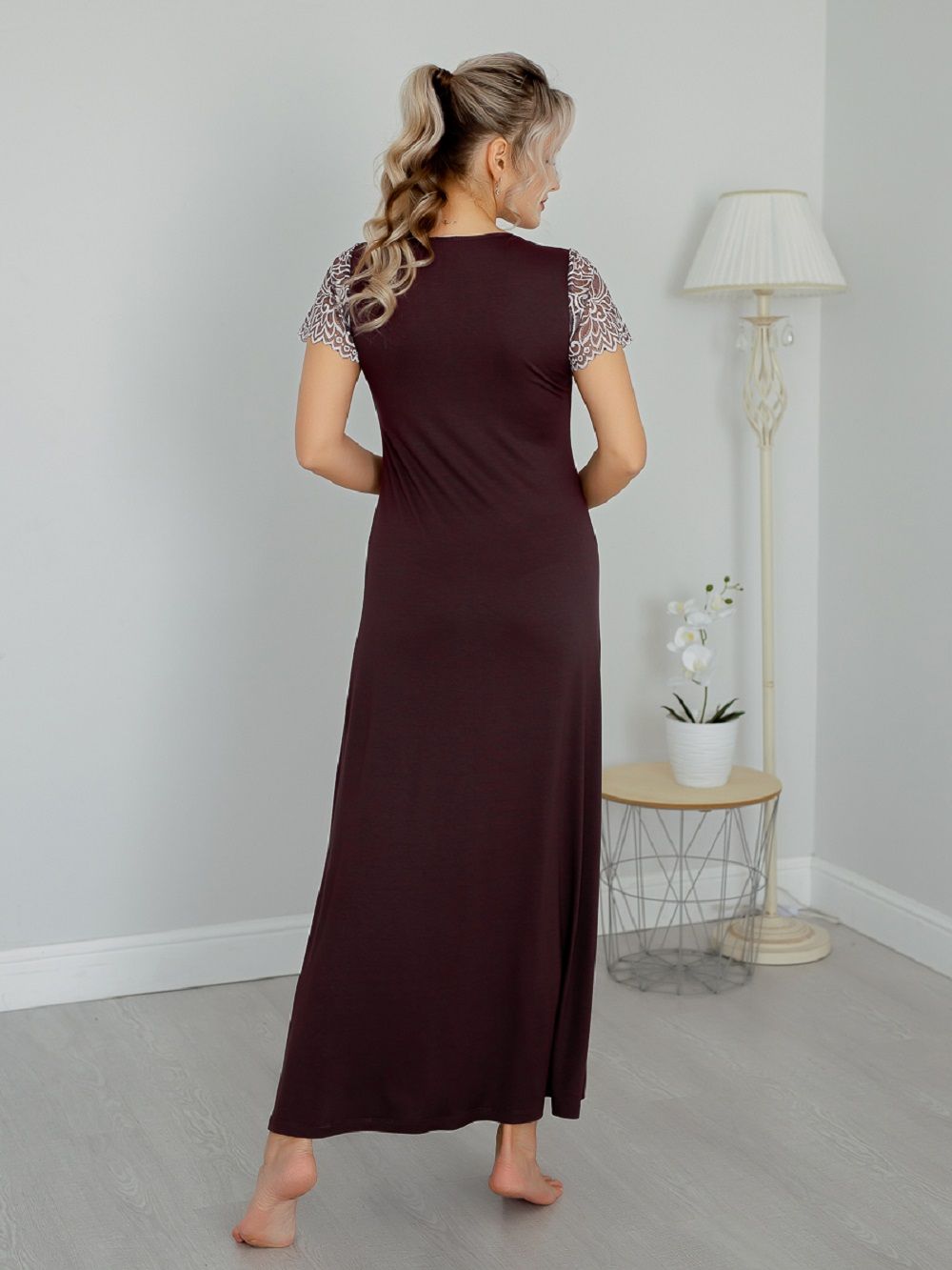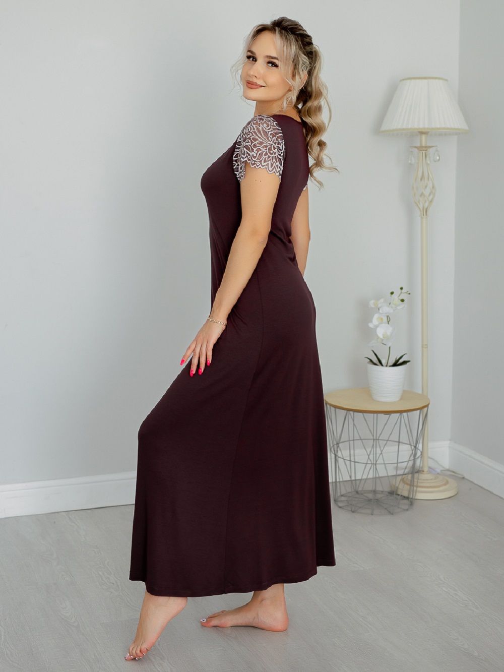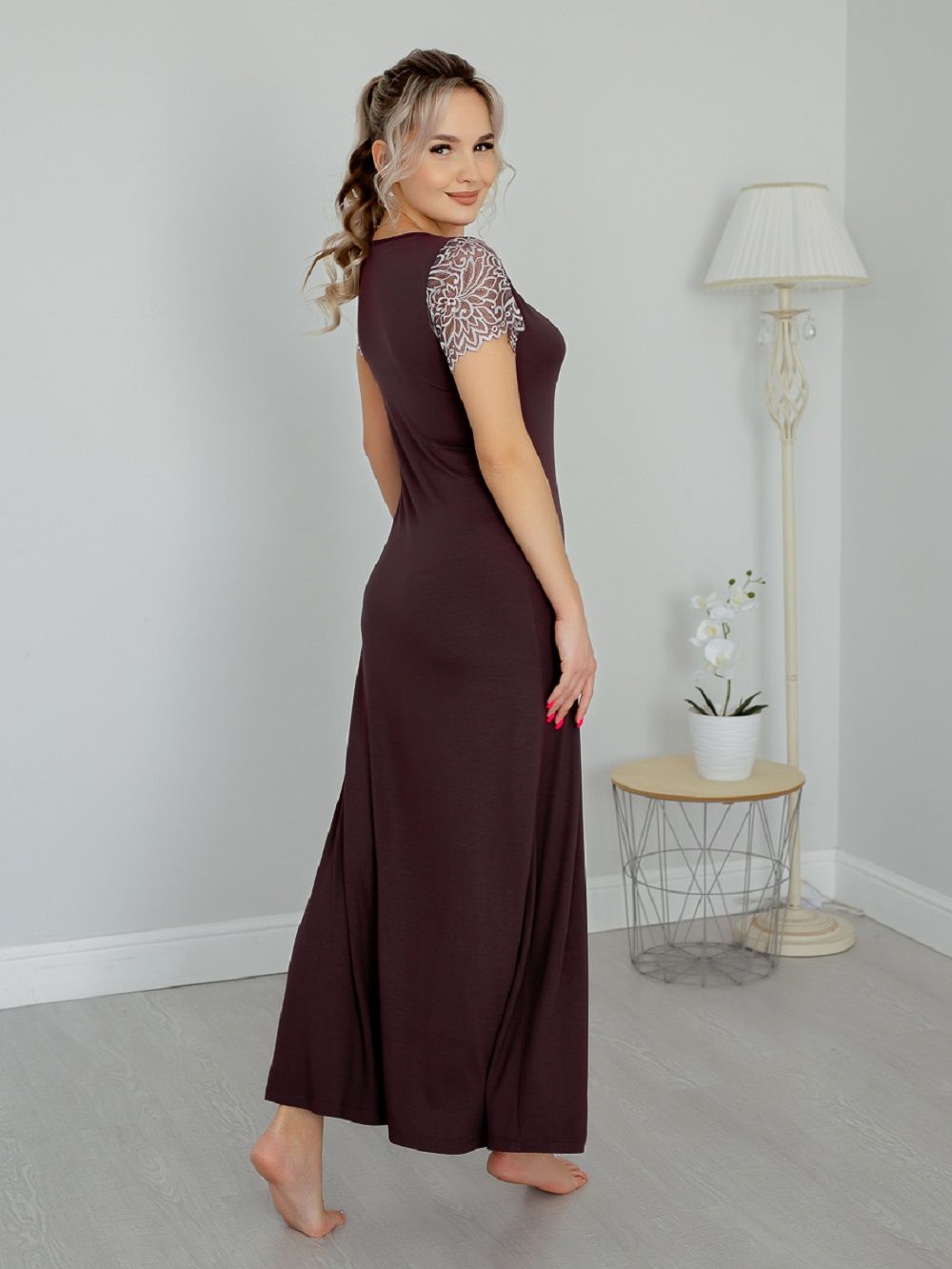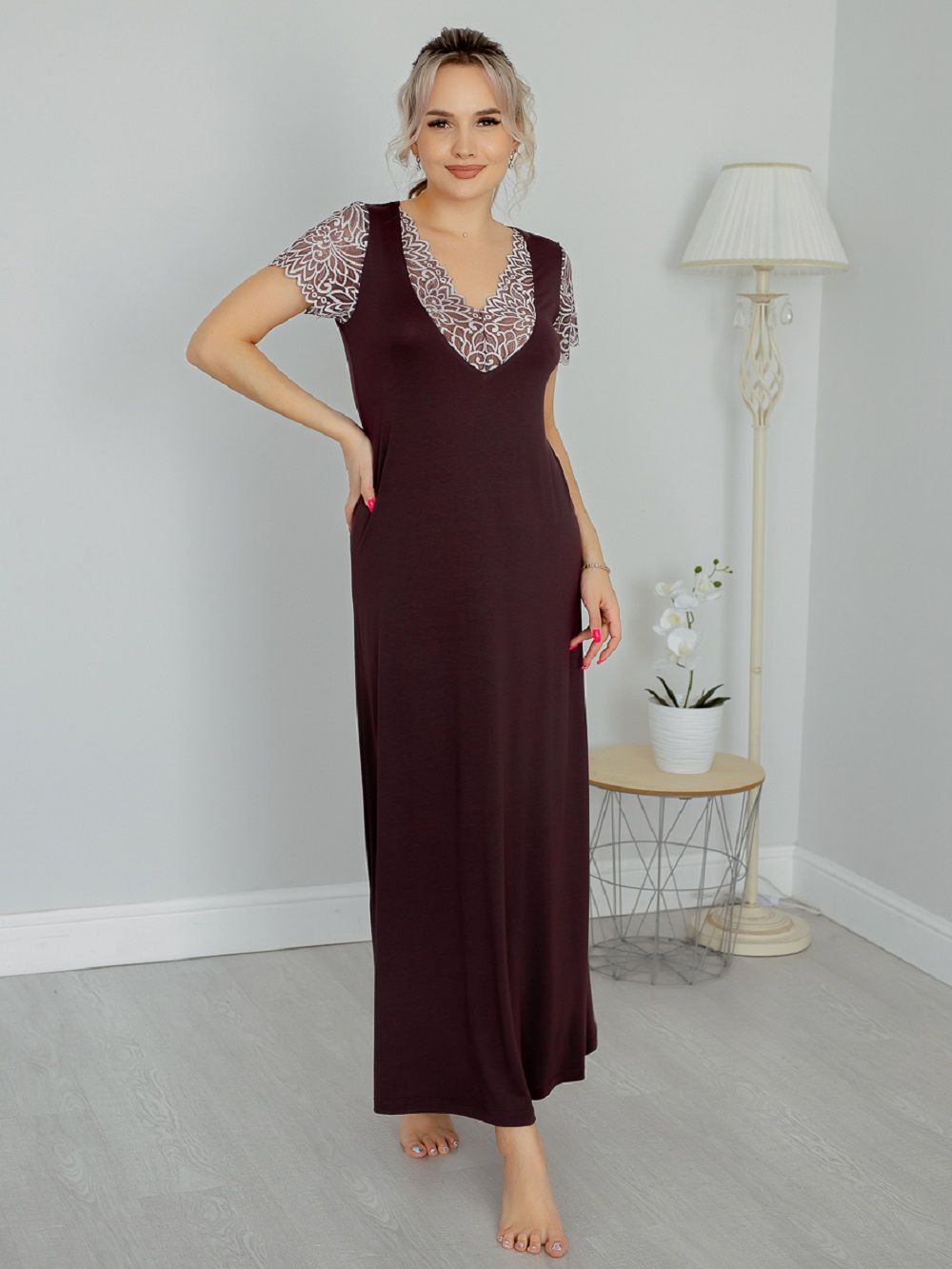 Ночная сорочка женская длинная из вискозного полотна. Ночная сорочка А-силуэта полуприталенного кроя. Эффектная и стильная сорочка для сна и отдыха – отличный наряд для дома. Короткие рукава и глубокий вырез горловины сделаны из эластичного кружева. Кружевной вырез эффектно подчеркивает зону декольте. Рубашка длинная, поэтому подойдет и на высоких. Состав ткани 92 % вискоза и 8 % эластан. Ночную сорочку удобно надеть и для сна и использовать как домашнее платье. Ночная рубашка представлена большим размерным рядом, в продаже размеры с 44 по 62. Натуральная шелковистая ткань позволяет коже дышать, превращает сорочку в комфортную одежду для дома. Эластичное и эффектное кружево добавляет ночной сорочке сексуальности и женственности. Домашняя одежда для женщин может быть красивой и сексуальной. Вискоза отлично тянется, а это значит, что сорочка подойдет для беременных и кормящих, возьмите ее с собой в роддом и будете самой элегантной мамочкой.