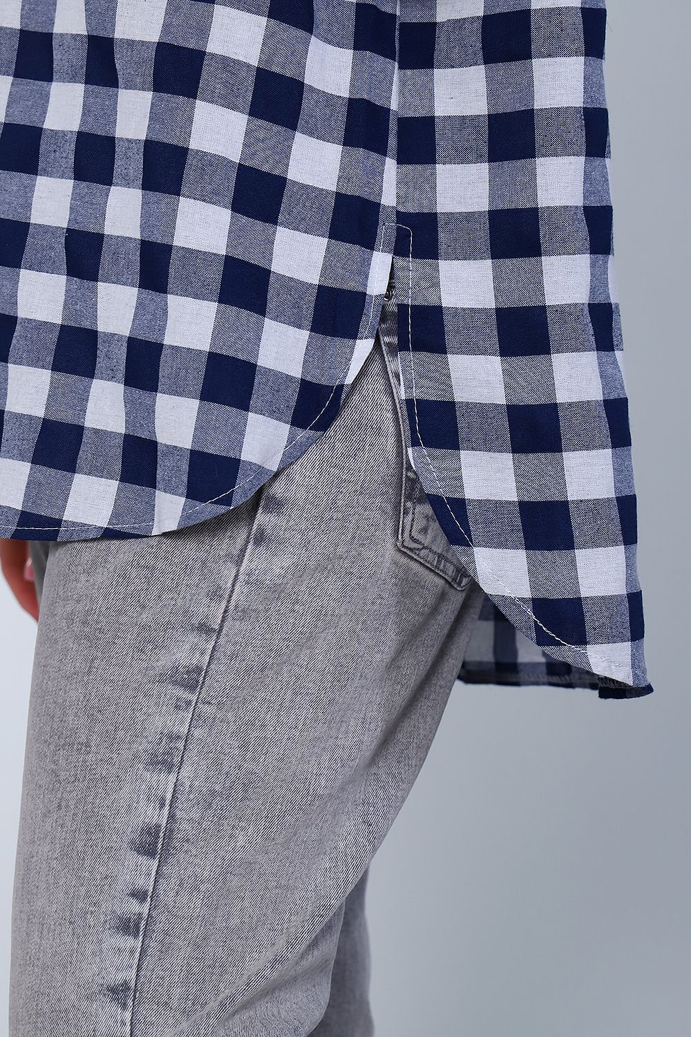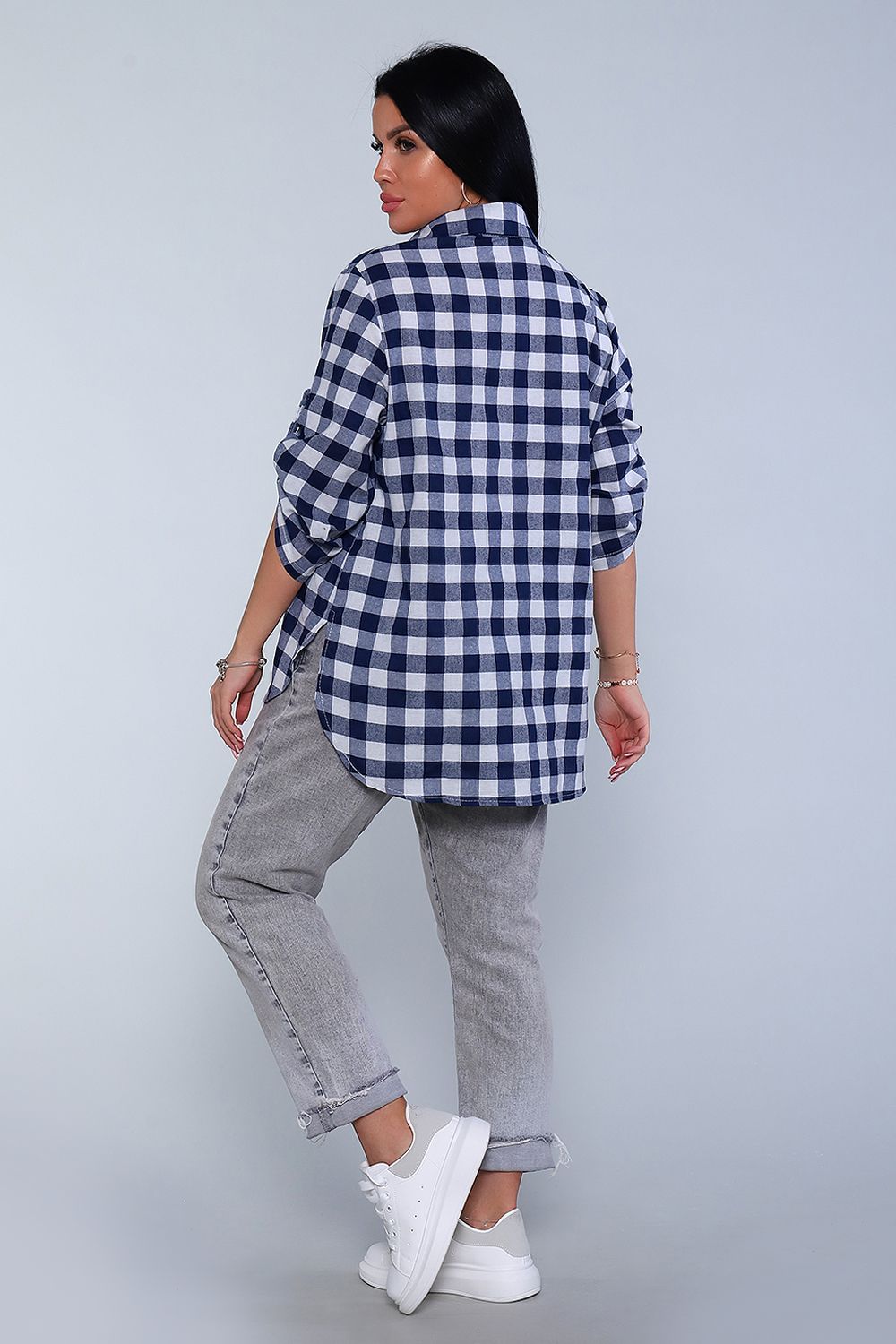 Повседневная, женская, туника свободного силуэта из набивного трикотажного полотна (штапель). Горловина круглая с отложным воротником. Спинка изделия, чуть длиннее полочки, низ изделия закруглен. На полочке рубашки расположен накладной нагрудный карман. Рукава укороченные, низ рукавов подобран на пату. Спинка цельнокроеная. Низ туники фигурный. Туника застегивается на пуговицы.