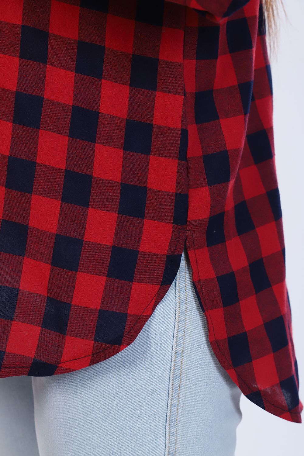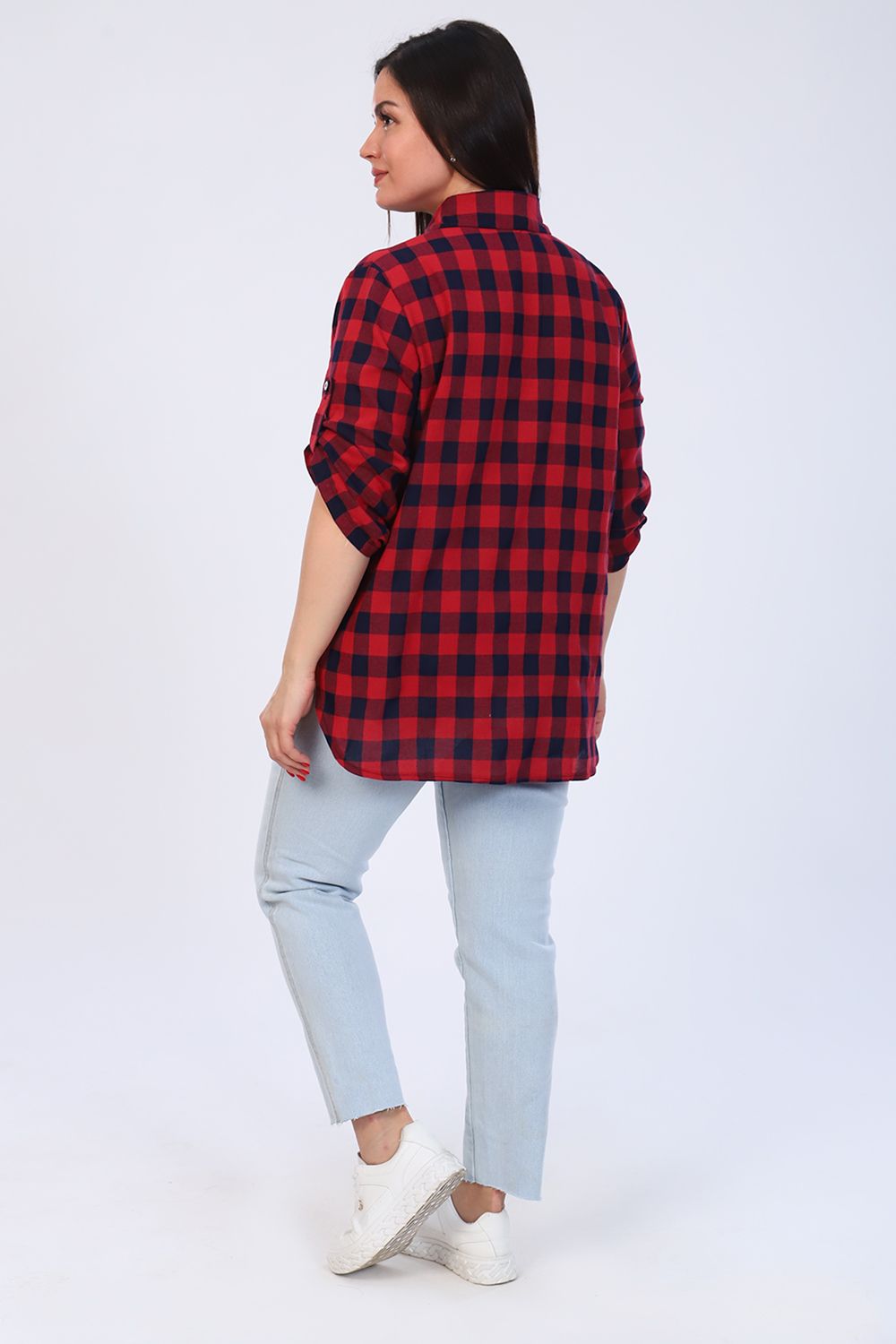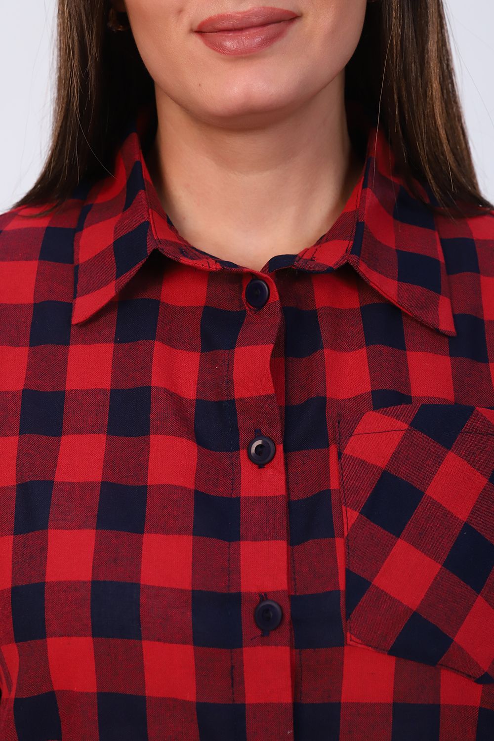 Повседневная, женская, туника свободного силуэта из набивного трикотажного полотна (штапель). Горловина круглая с отложным воротником. Спинка изделия, чуть длиннее полочки, низ изделия закруглен. На полочке рубашки расположен накладной нагрудный карман. Рукава укороченные, низ рукавов подобран на пату. Спинка цельнокроеная. Низ туники фигурный. Туника застегивается на пуговицы.