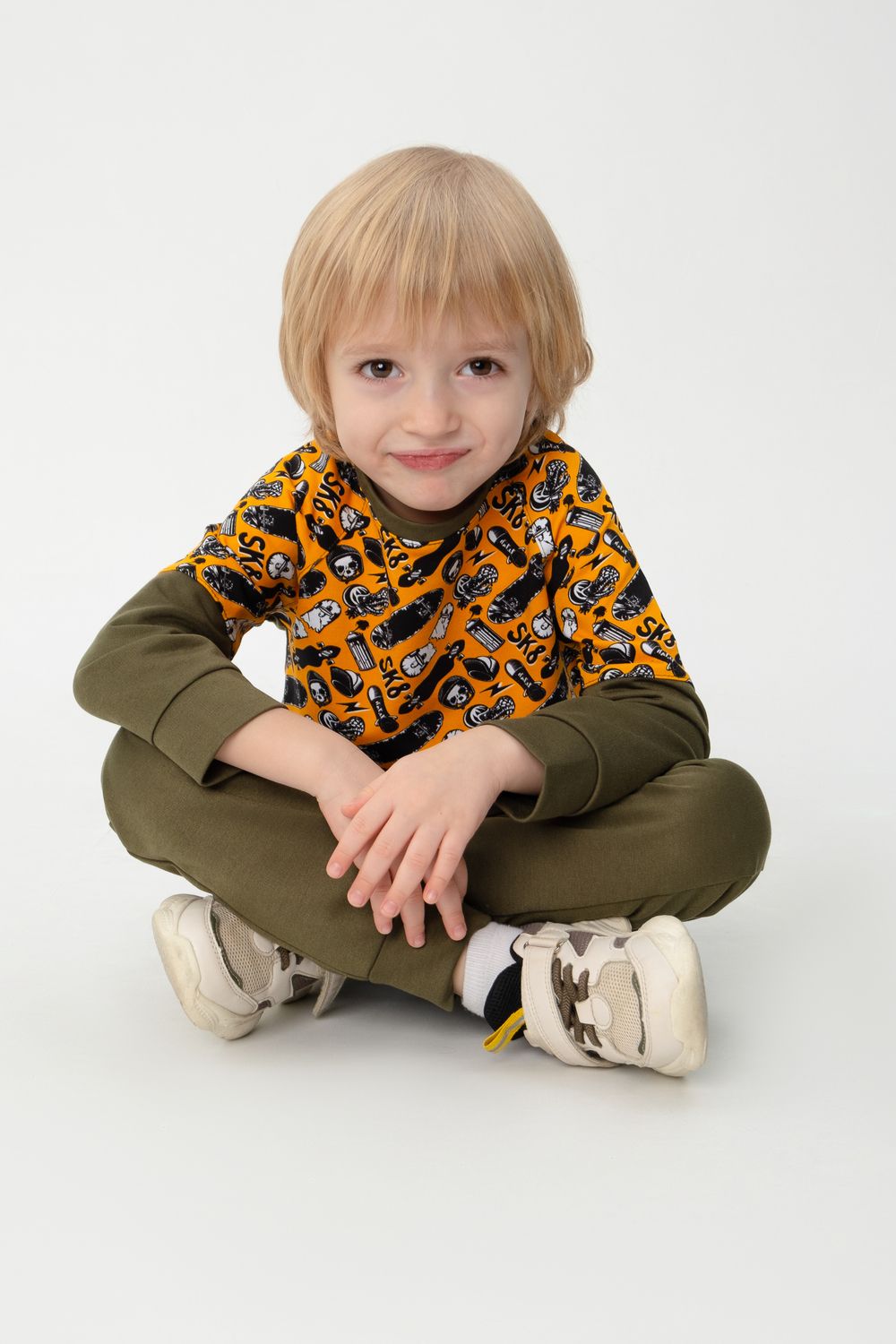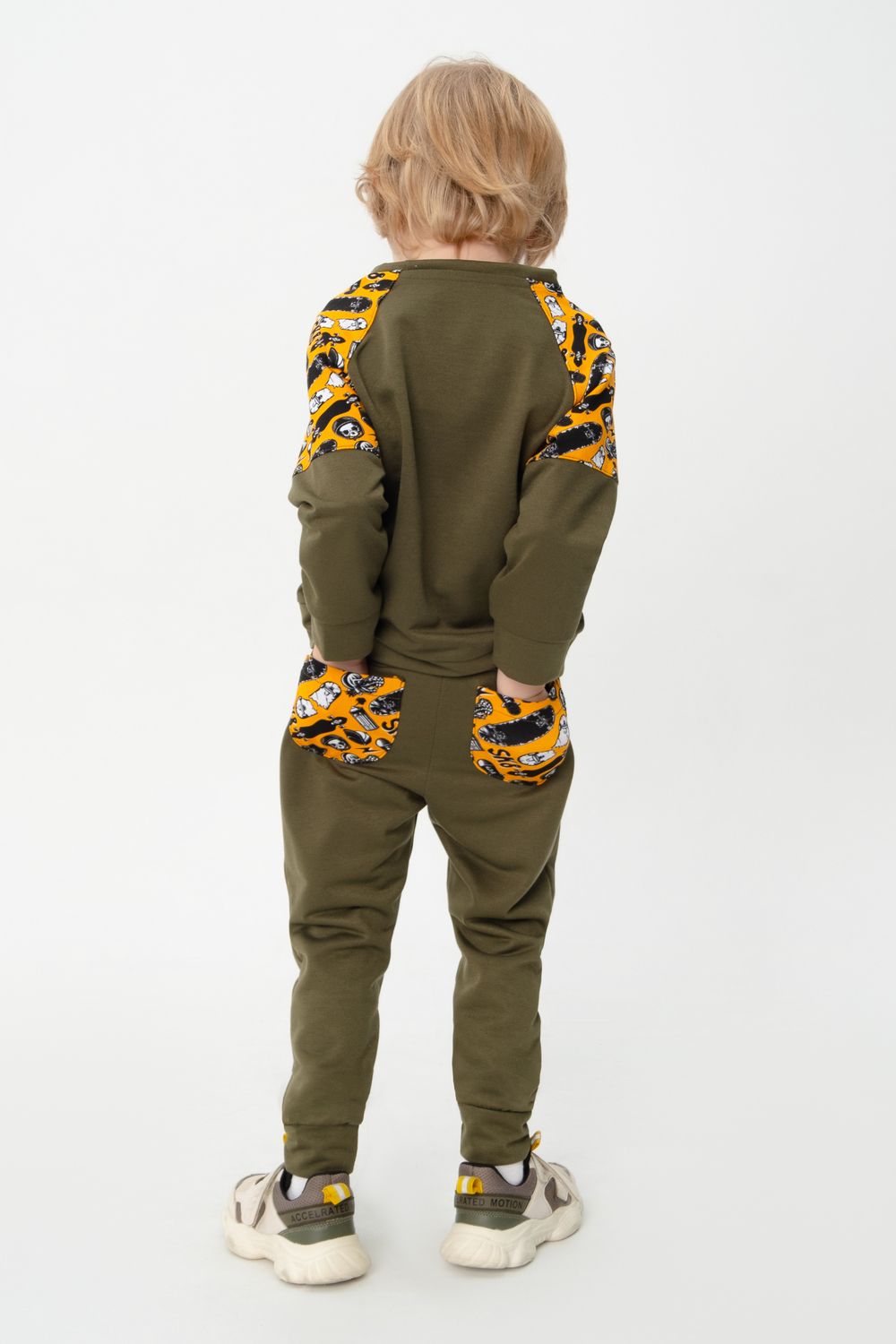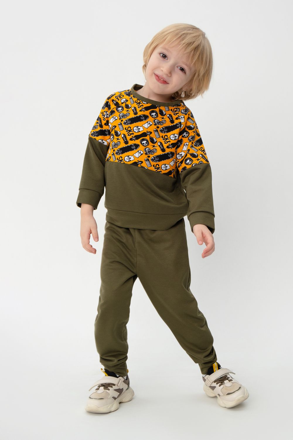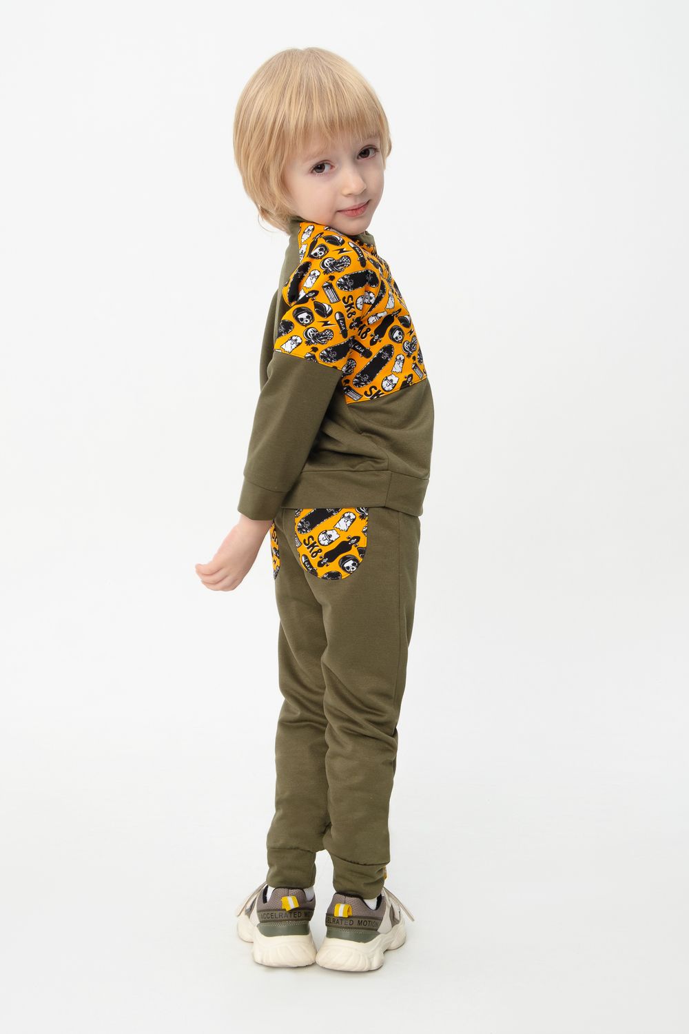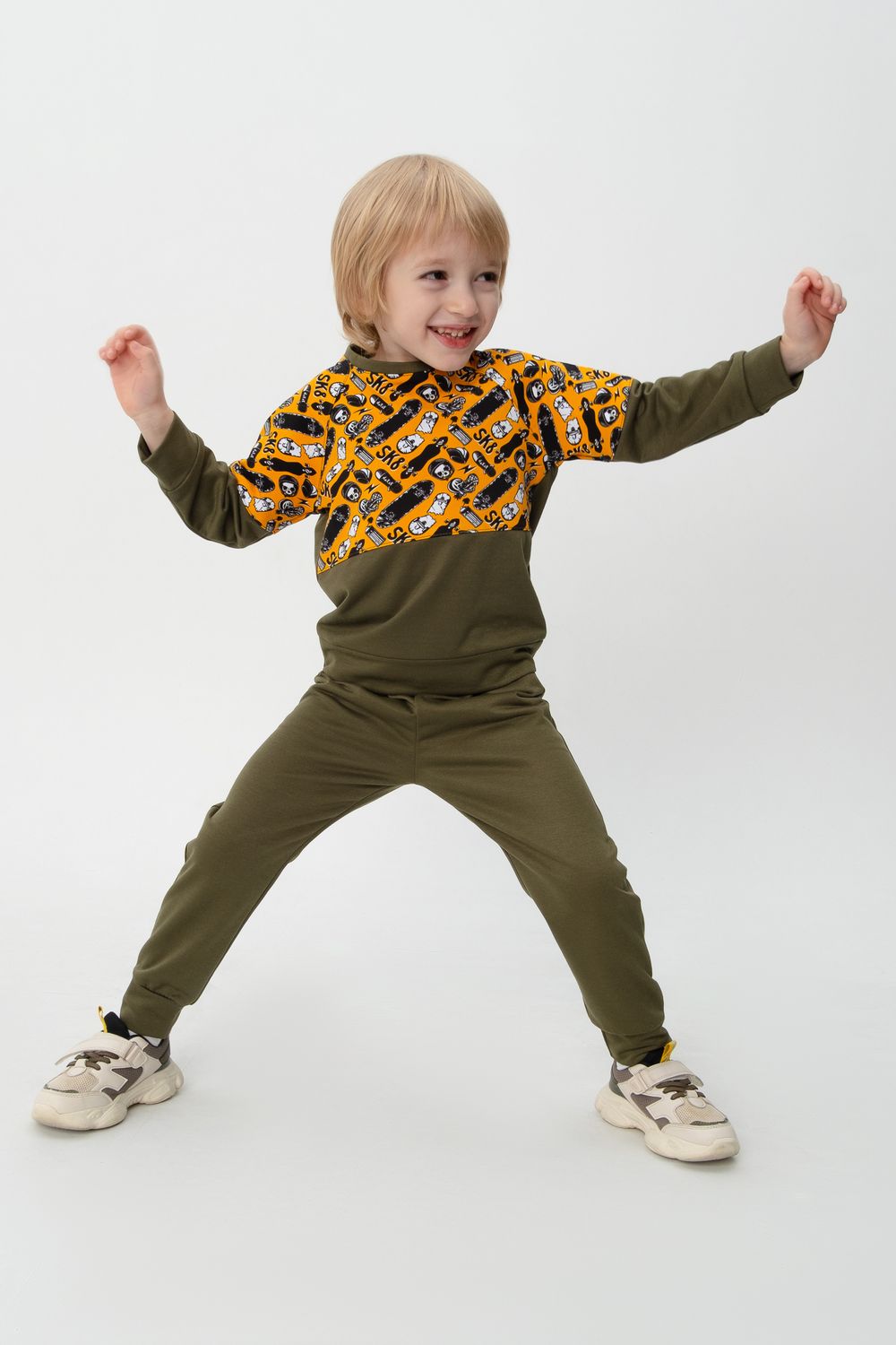 Костюм выполнен из двух видов футера - обычного и набивного. В комплект входит свитшот и брюки прямой посадки. Принт с изображением скейтбордов выполнен в области плеч и на задних карманах брюк. Идеально подойдет как для занятий спортом, так и для прогулок на свежем воздухе.