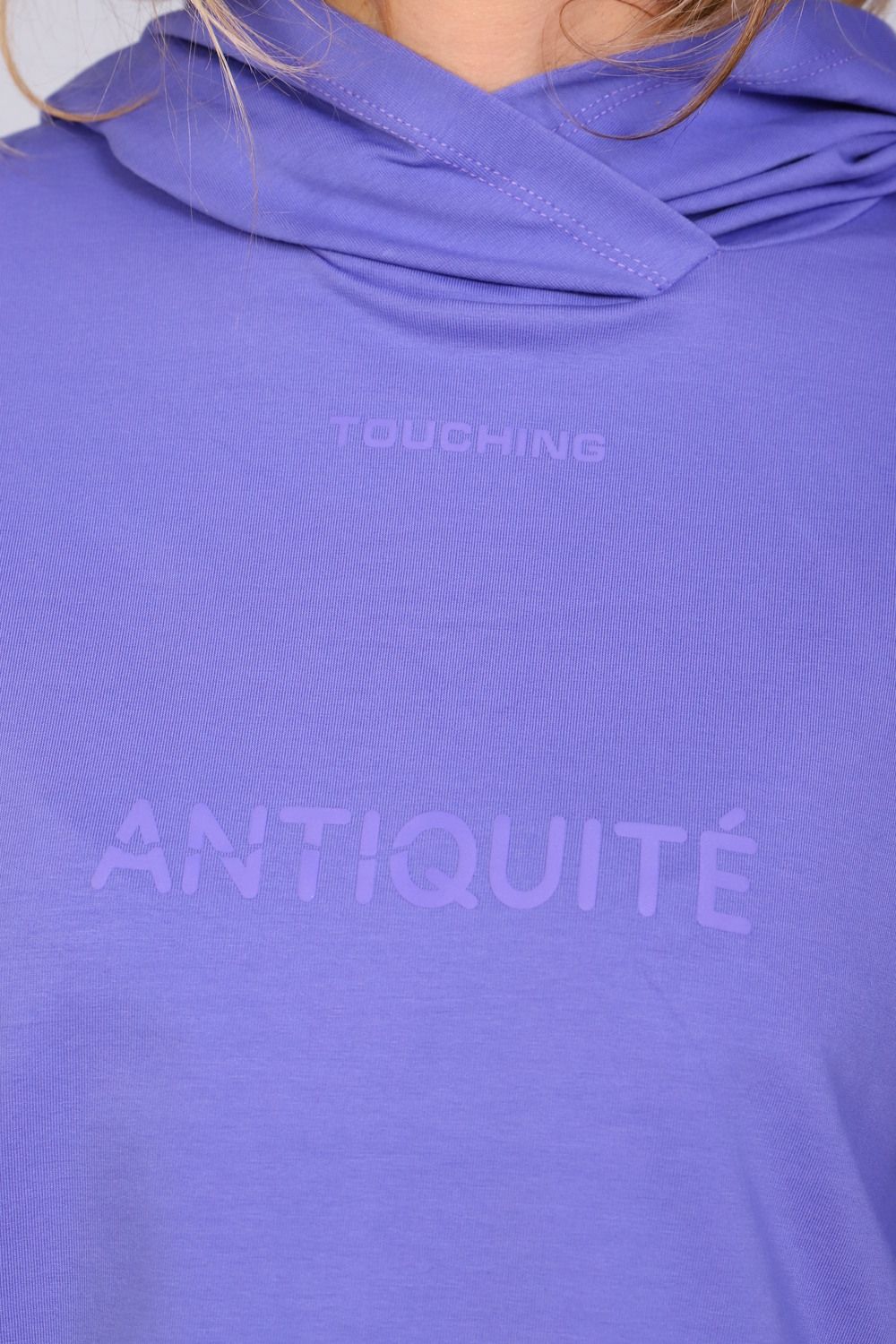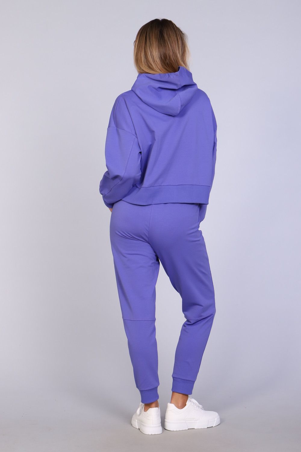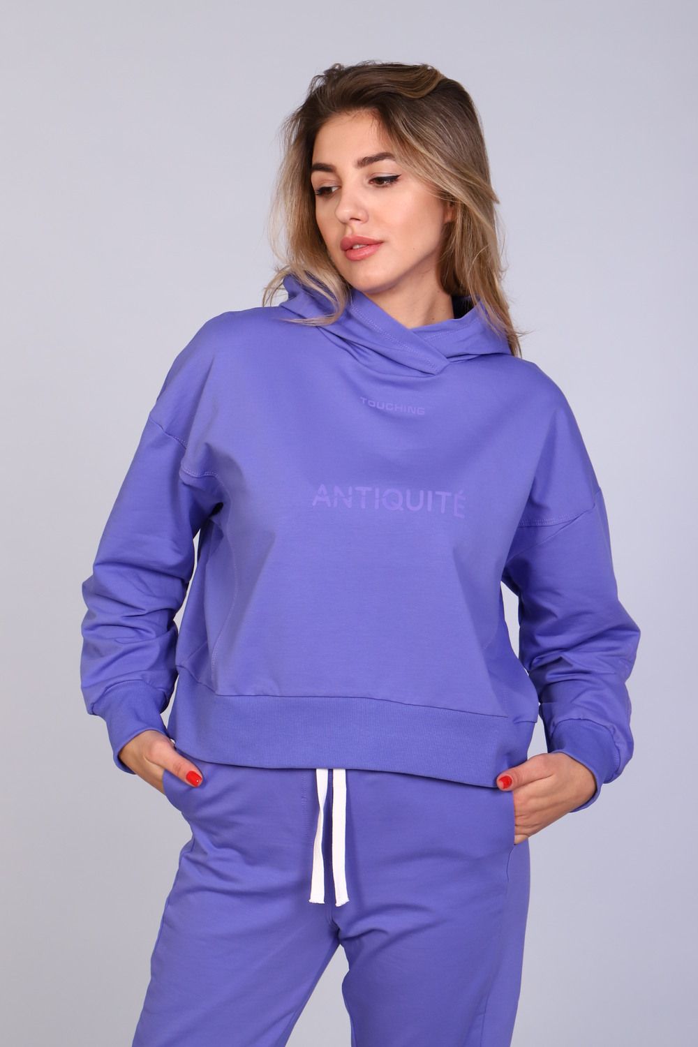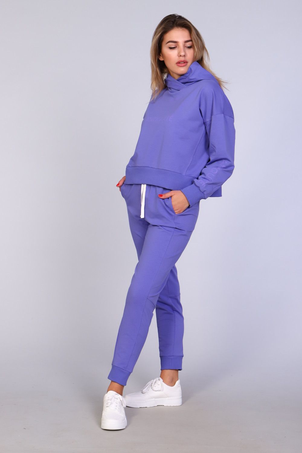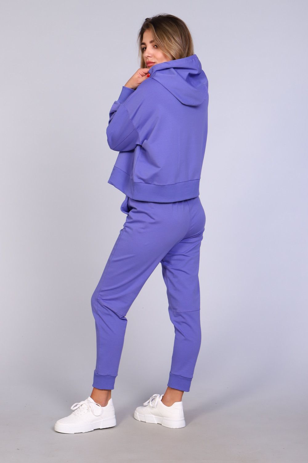 Костюм женский с зауженными брюками с манжетами внизу, на резинке и свободной кофтой с капюшоном и манжетами на рукавах. Модель выполнена из футера 2-х нитки (петля - хлопок).