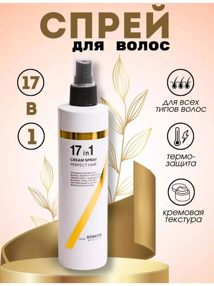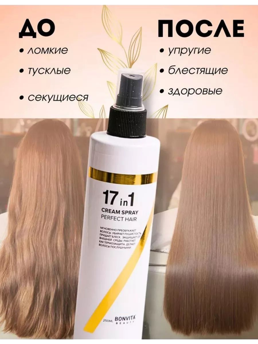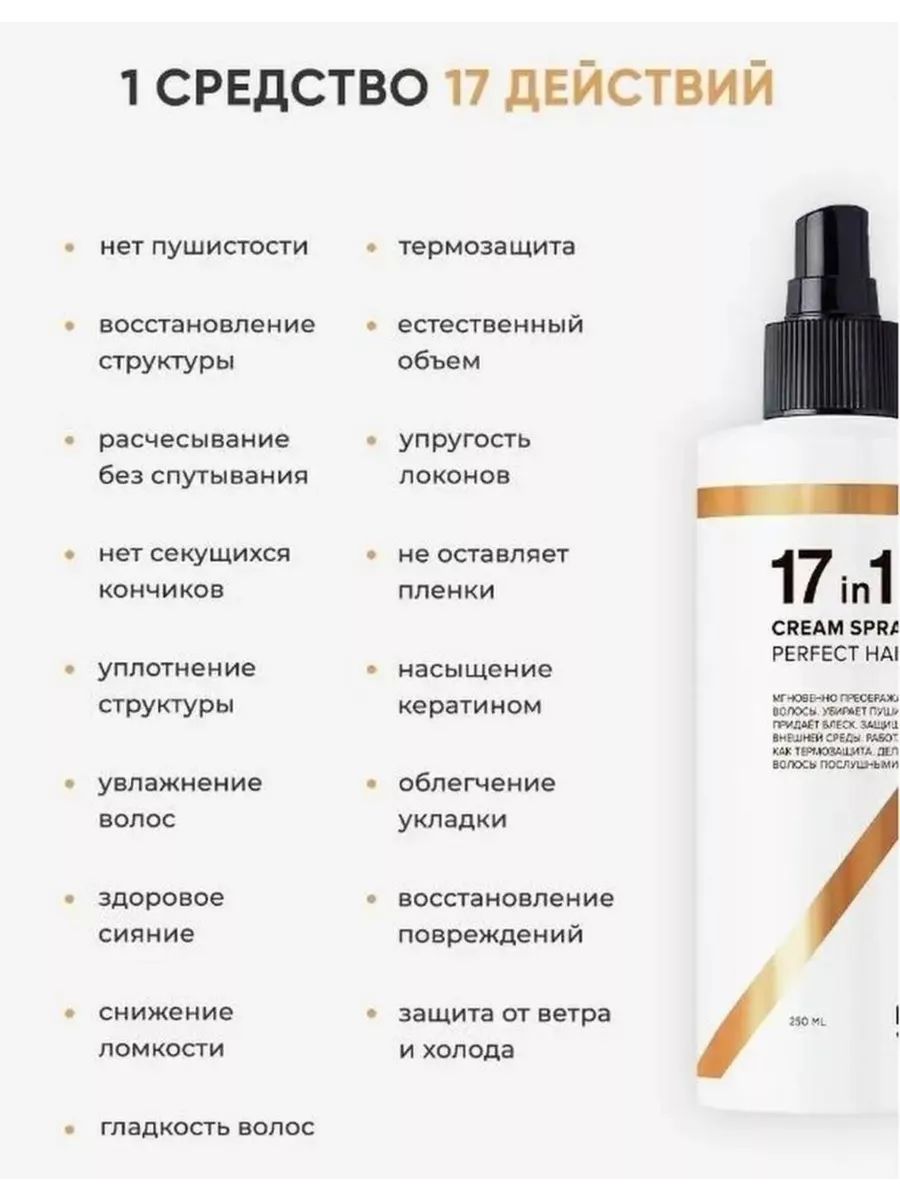 Спрей для волос 17в1 мгновенно преображает волосы, убирает пушистость, придает блеск, защищает от внешней среды, работает как термозащита, делает волосы послушными. Заменяет целый ряд привычных средств по уходу за волосами. После его использования волосы приобретают сияющий вид, легче расчесываются и перестают путаться. Помогает бороться с секущимися кончиками и восстанавливает поврежденные волосы. 17 компонентов в составе спрея гармонично взаимодействуют друг с другом. Подходит волосам любого типа для ежедневного использования. Его эффективность подтвердили 95% девушек из двухсот сорока опрошенных с разными типами волос и длины. Применение: распылить на чистые волосы, распределить по всей длине, не смывать. Меры предосторожности: только для наружного применения. Избегать попадания в глаза и на поврежденную кожу. Возможна индивидуальная непереносимость компонентов. Хранить в недоступном для детей месте.