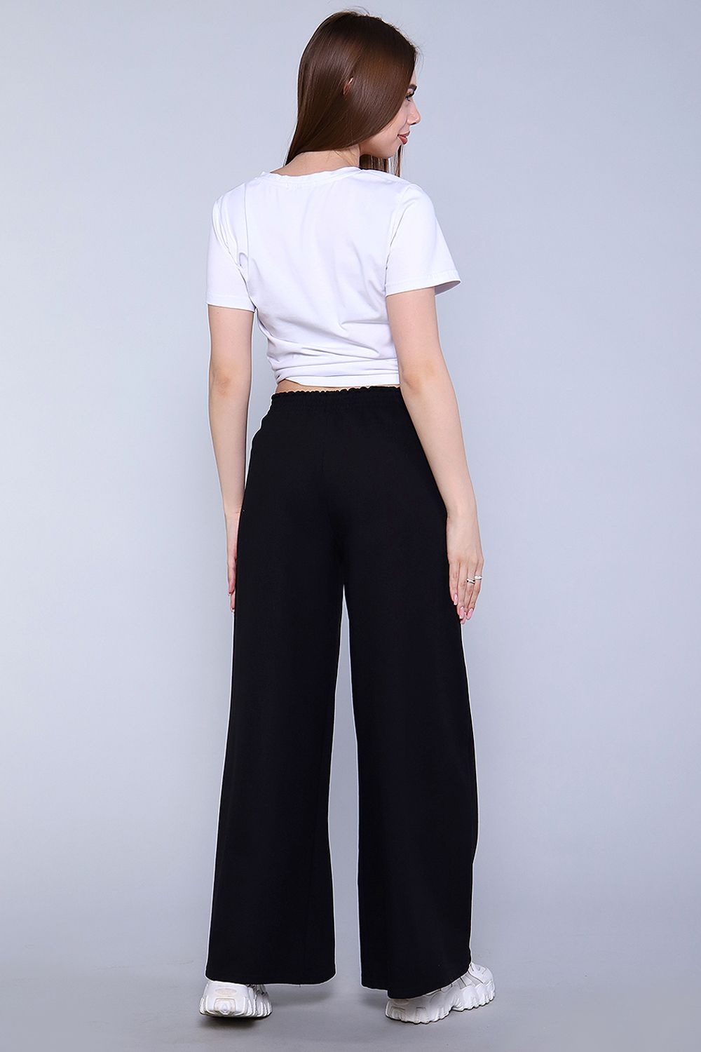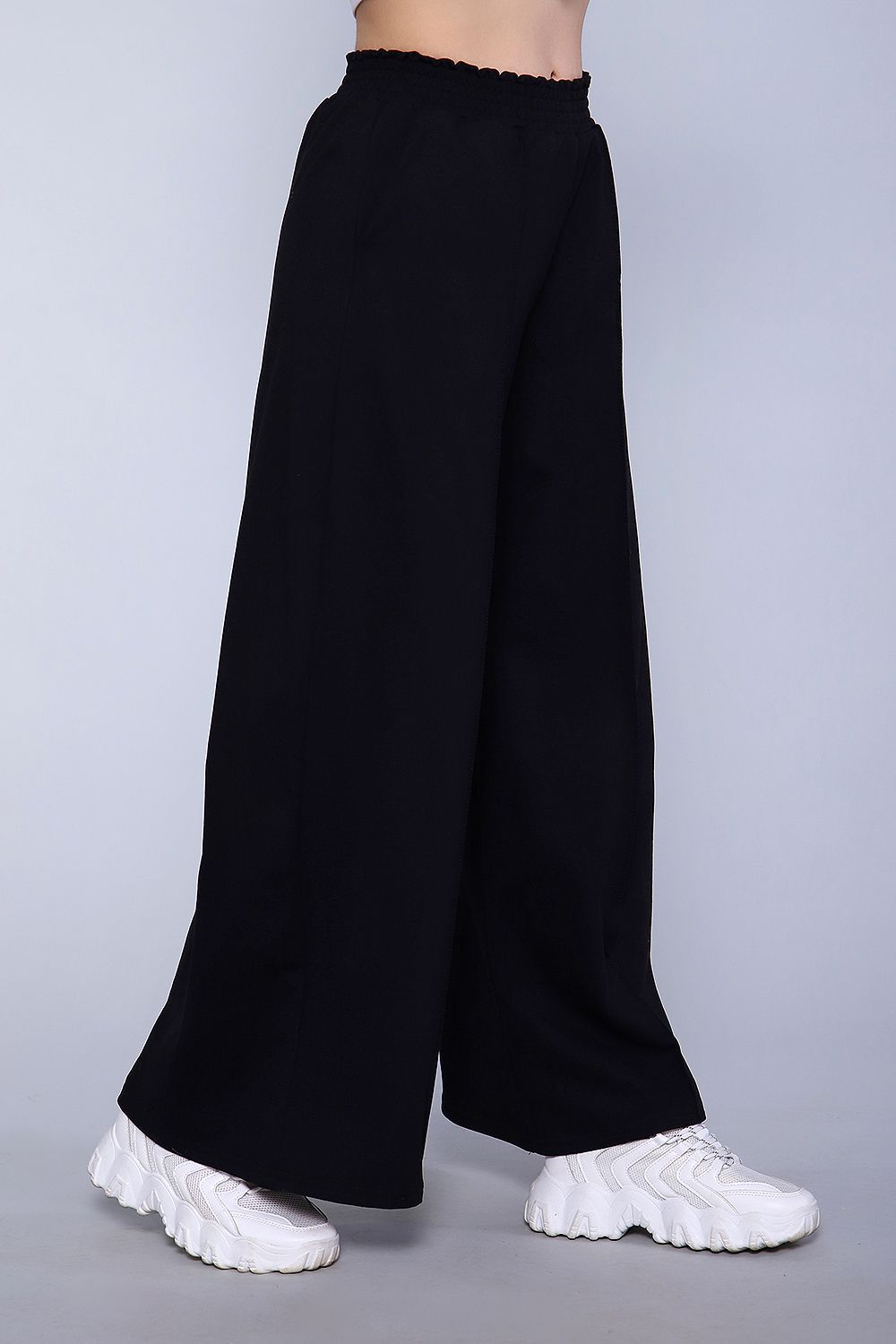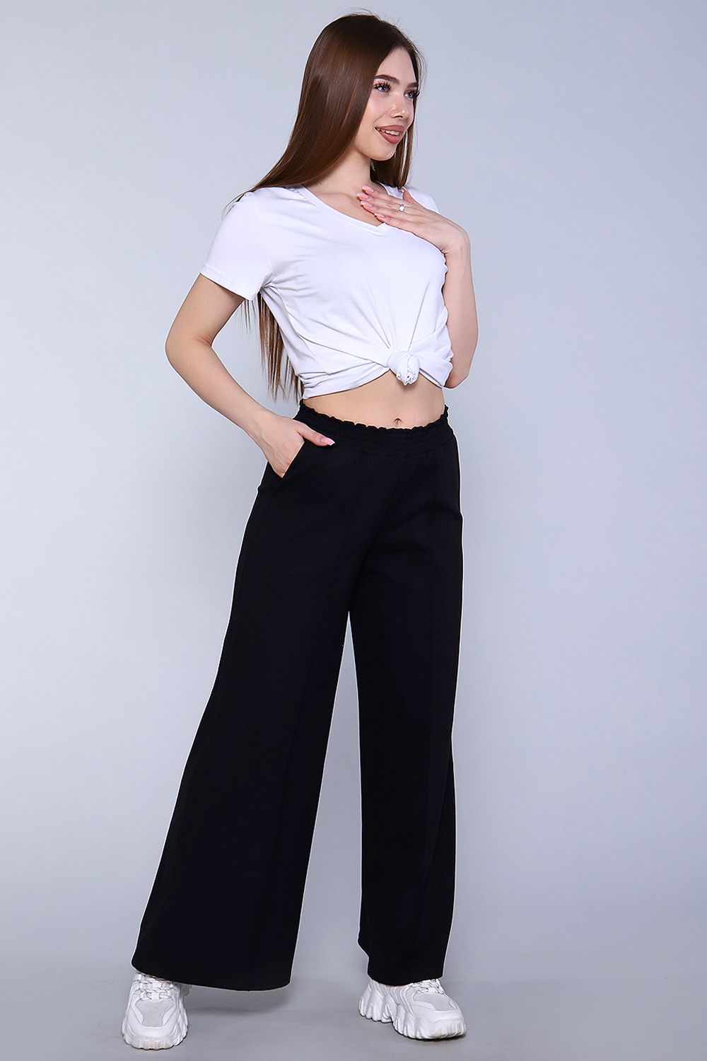 Широкие брюки женские палаццо со стрелками и с карманами. Пояс брюк обработан на поясной машине, что делает брюки практичными при носке – резинка не скручивается. В модели палаццо клеш от бедра, это визуально вытягивает фигуру, делает стройнее и элегантнее. Брюки свободного кроя скрываю все недостатки фигуры. Отлично сочетаются с блузками, рубашками, футболками, пиджаками, свитерами и водолазками. Брюки палаццо отлично подойдут как на работу в офис, так и создадут праздничный вечерний образ.