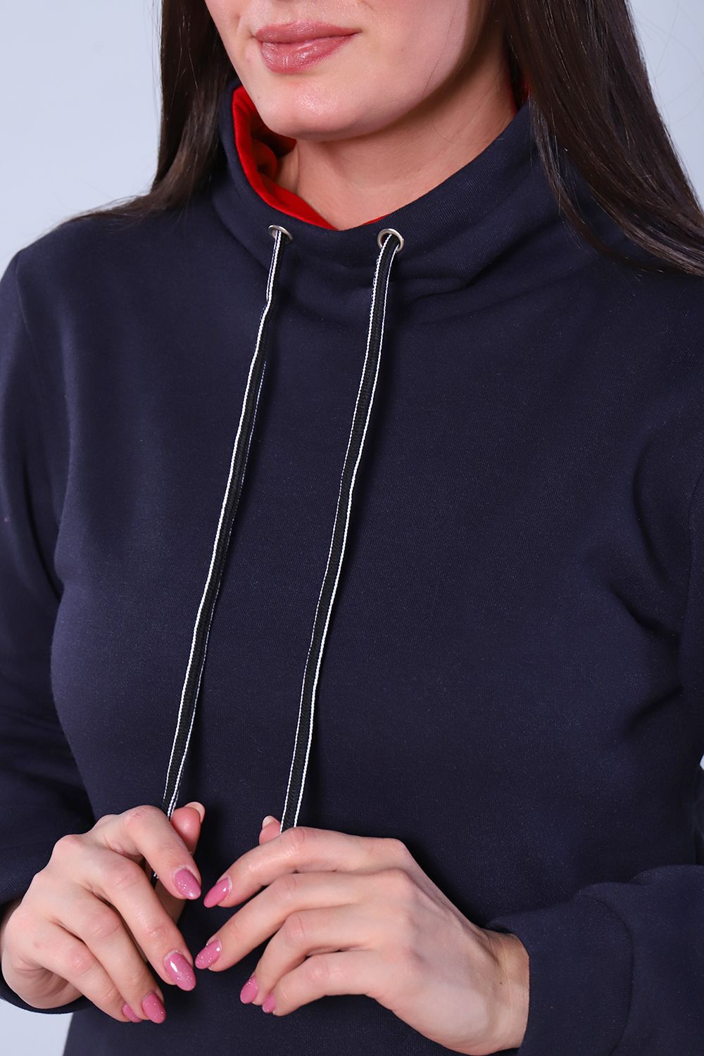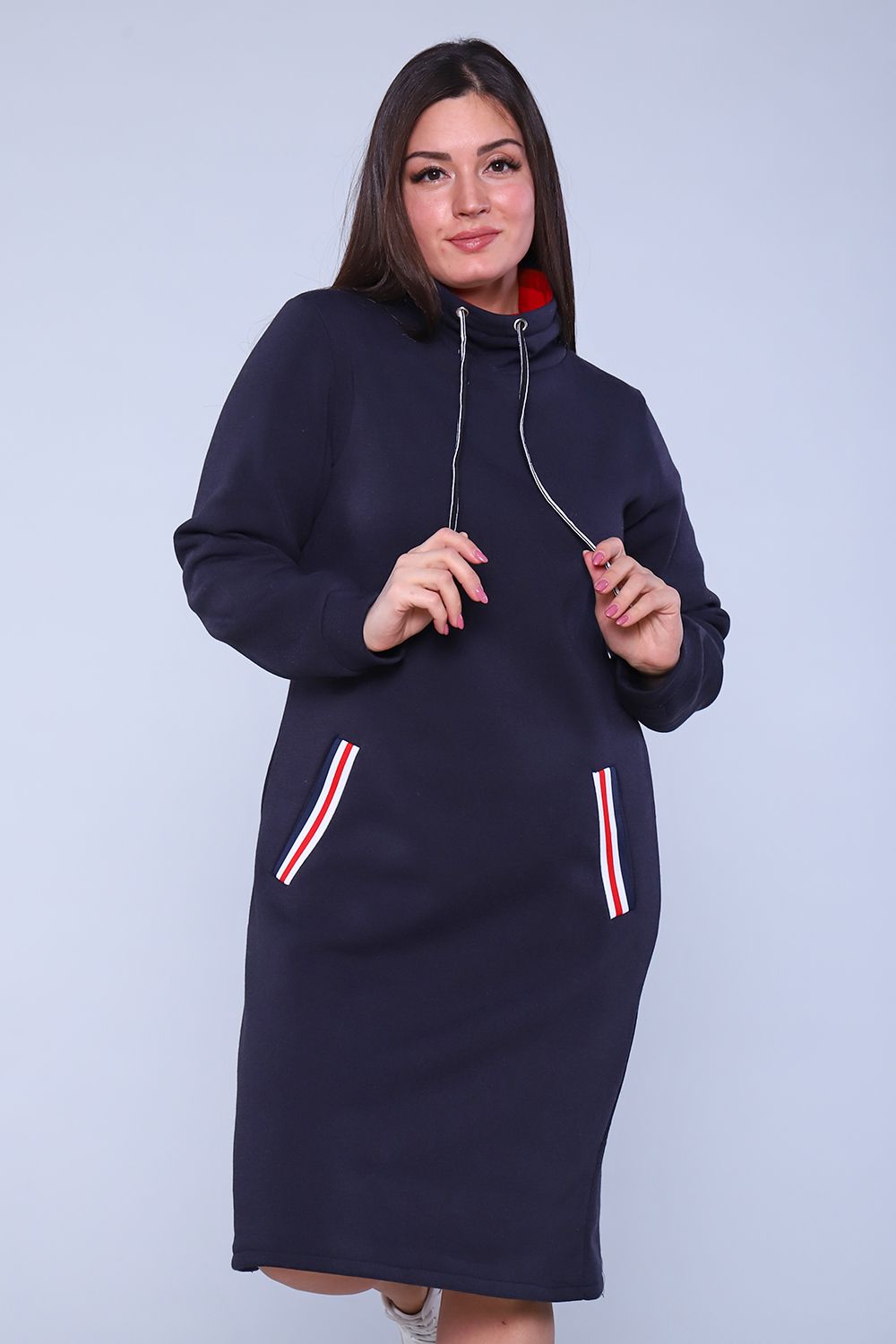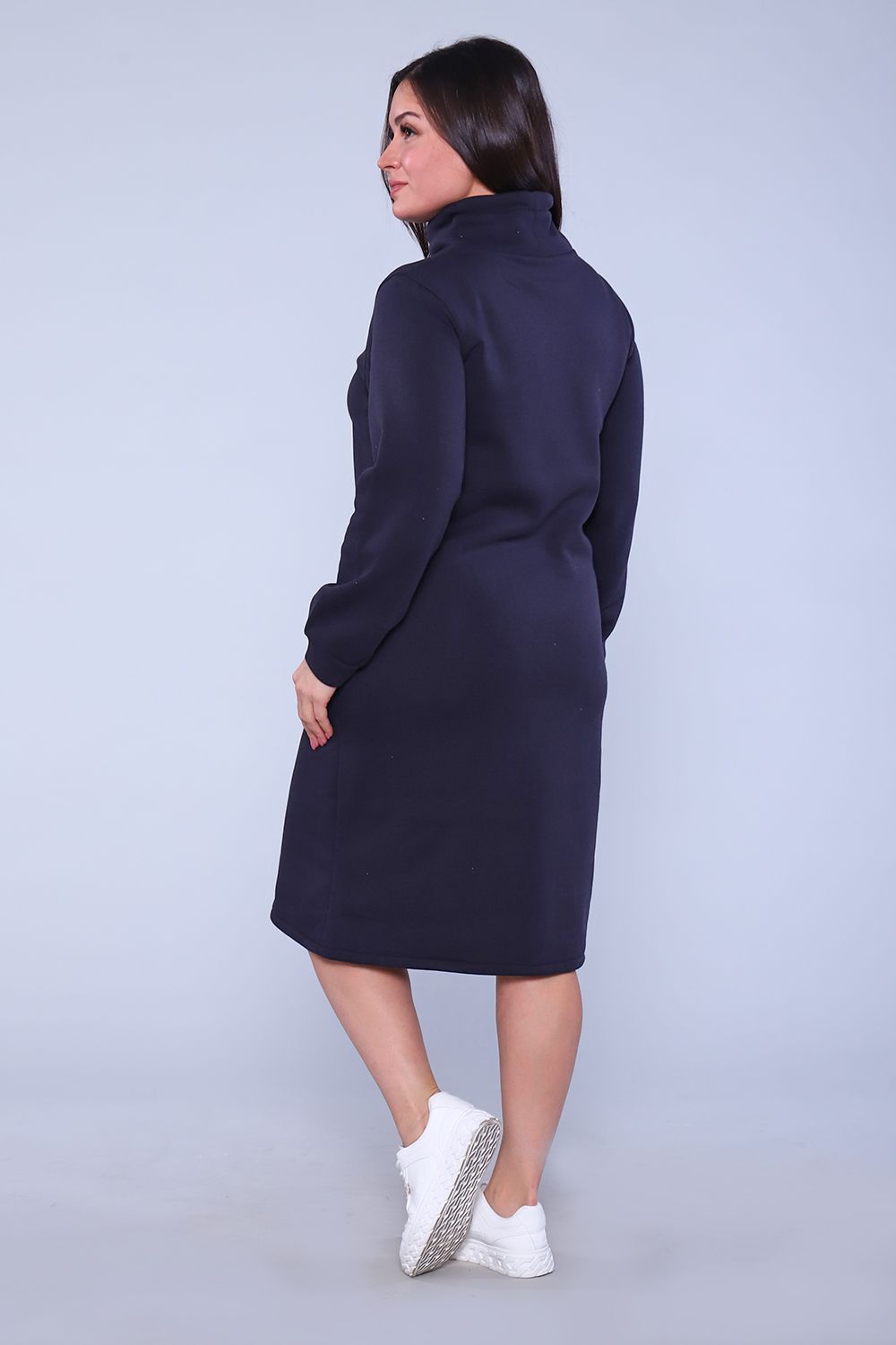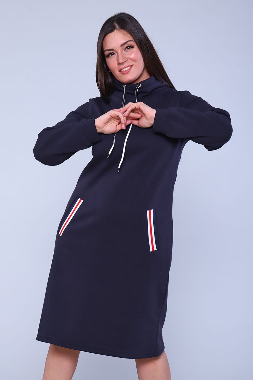 Платье женское комбинированное из футера прямого силуэта. Длинный рукав ма манжете, воротник стойка на шнуровке через люверсы. На передней полочке внутренние карманы с отделкой. Теплое и удобное.