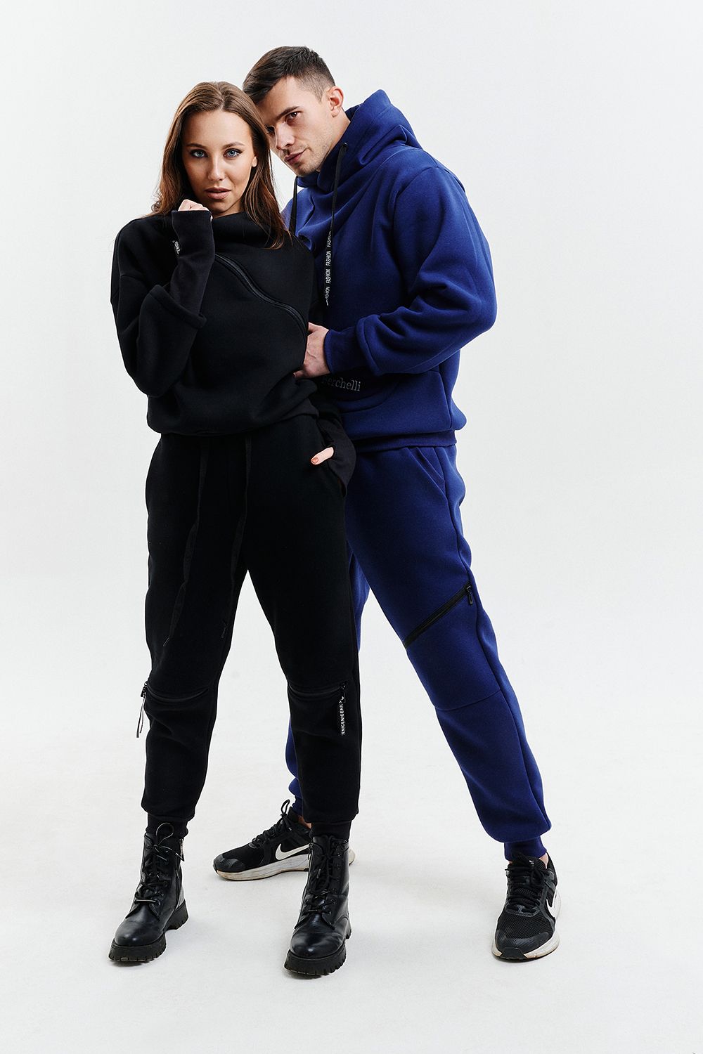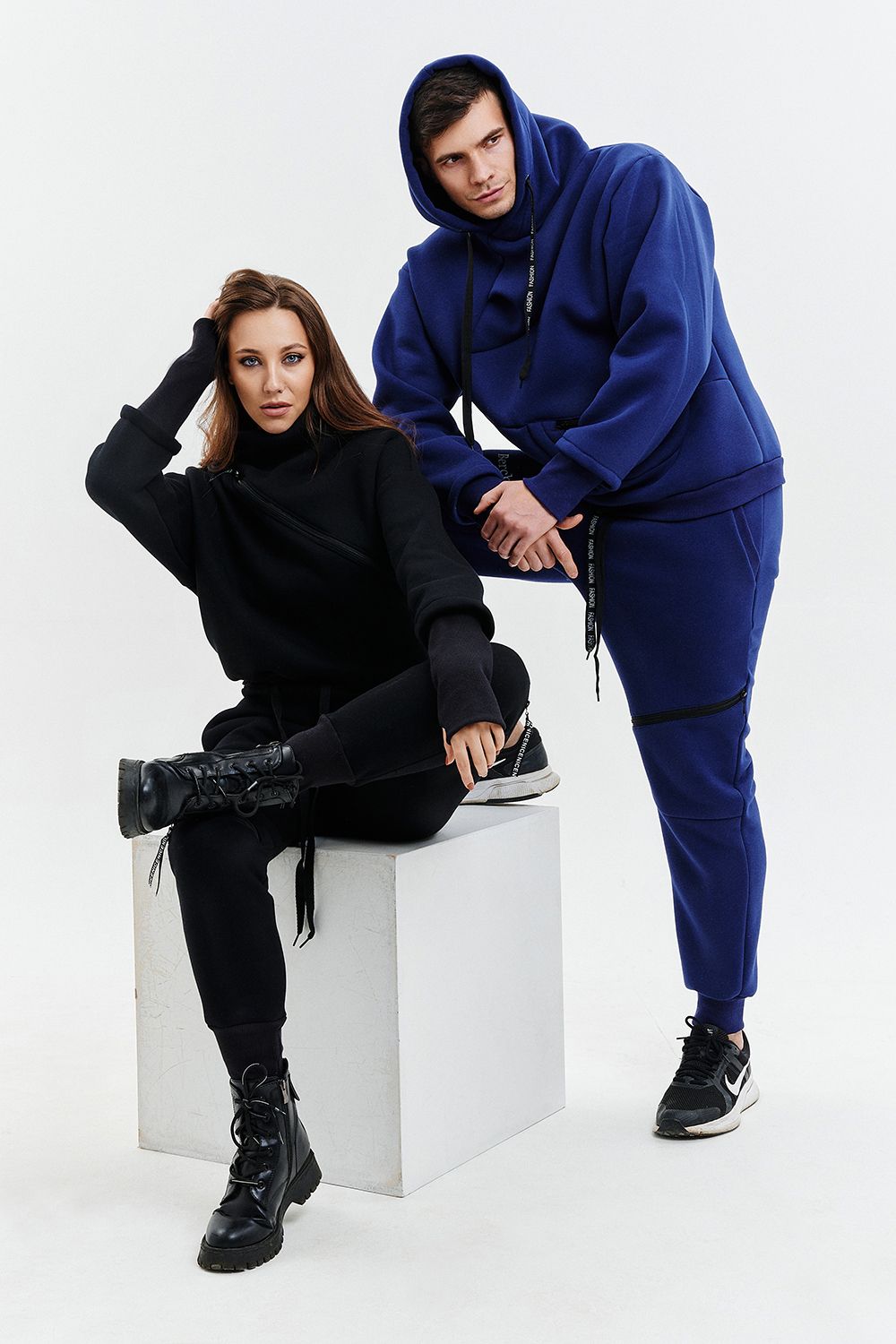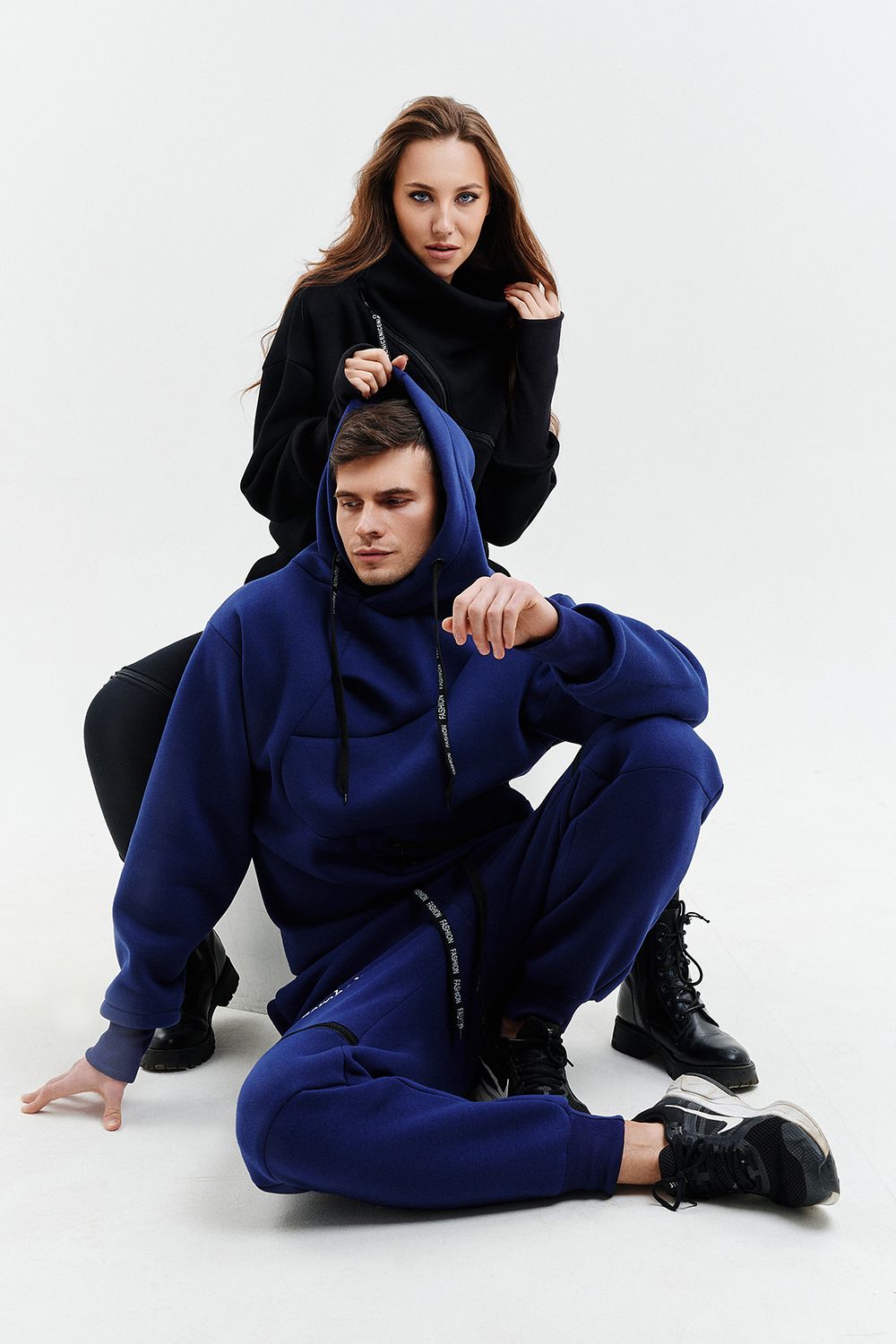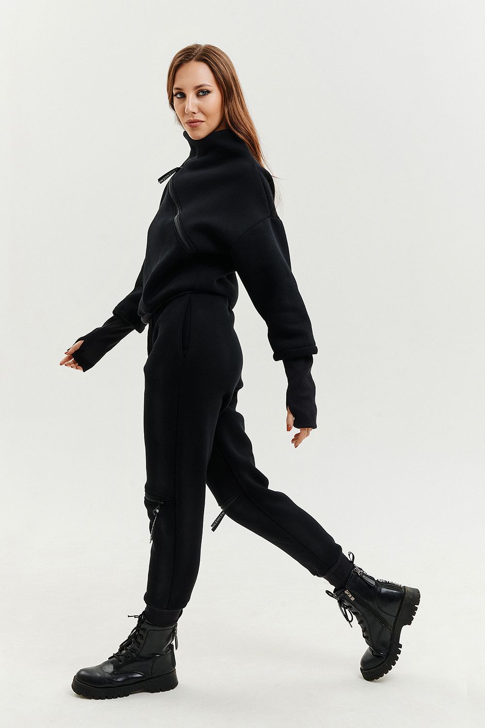 Удобный и стильный женский спортивный костюм. Состоит из свитшота и брюк-" джогеров". Толстовка и брюки оформлены функциональными, декоративными молниями. Толстовка с удобным воротником-стойкой, низ рукавов обработан высокой манжетой-перчаткойиз кашкорсе. Джогеры с высокой посадкой и широкой эластичной резинкой на поясе со шнурком. Низки брюк обработаны манжетами, что очень удобно при носке и отлично смотрятся с грубыми ботинками в стиле "челси". Спортивный костюм подходит как для зимних видов спорта, лыж, коньков, так и в холодную погоду осенью, весной.