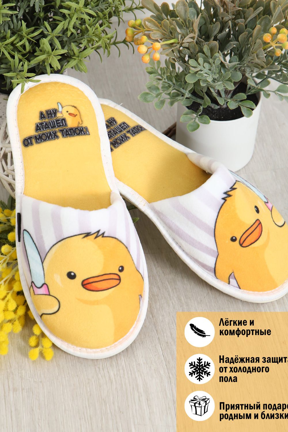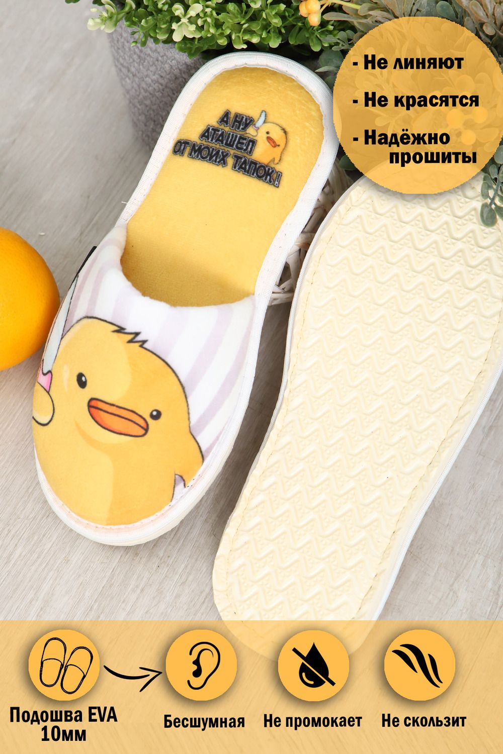 Мягкие домашние тапочки с закрытым носом и открытой пяткой – это идеальный аксессуар для создания уютной атмосферы в вашем доме! Верх и стелька изготовлены из теплых и приятных на ощупь материалов. Подошва изготовленная из высококачественного ПВХ, который еще называют EVA. Обеспечивает отличное сцепление с полом и защиту от скольжения. Это уникальный материал и при всей своей комфортабельности, долго способен выдерживать большие нагрузки Удобные и стильные, эти тапочки с рисунком станут незаменимым аксессуаром вашего домашнего гардероба как зимой, так и в летние дни! Все наши тапки прошиваются для большей износостойкости армированной нитью, а сублимационная печать позволяет наносить краску на волокна ткани, из-за чего цвета получаются насыщенными и сохраняют яркость даже после нескольких стирок. Дизайнерские принты придадут уникальности и поднимут настроение вам и вашим гостям!