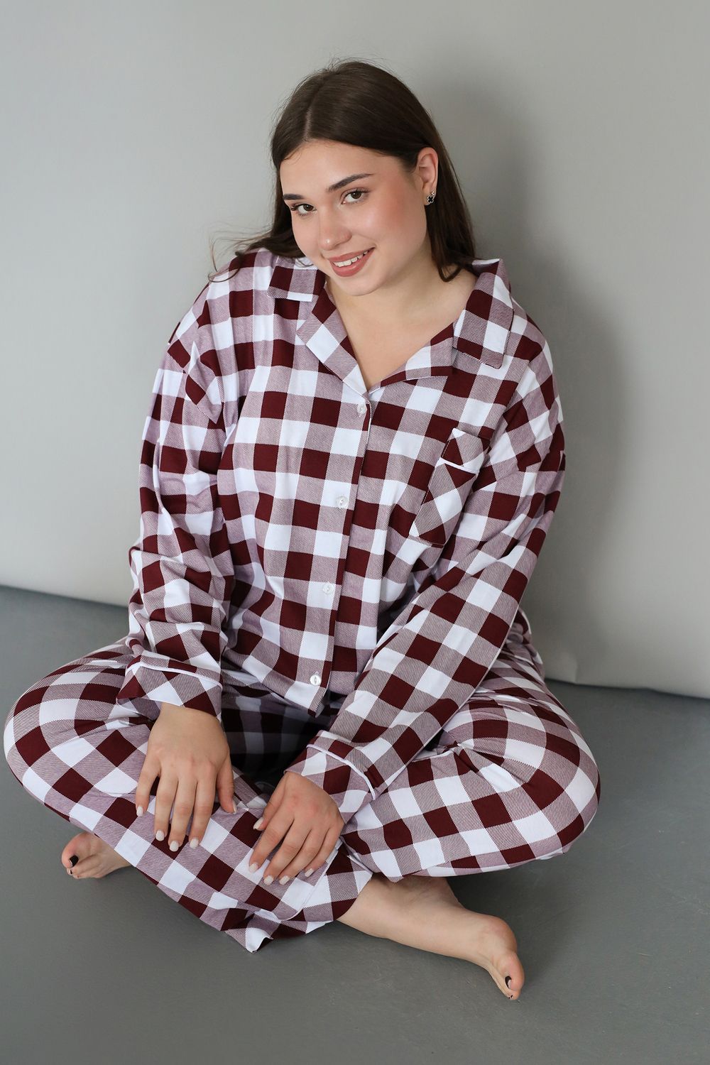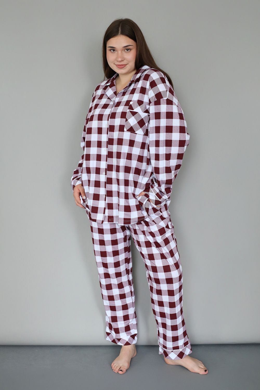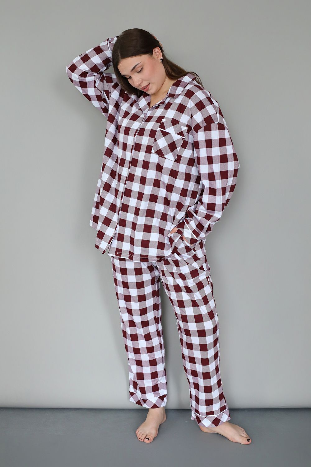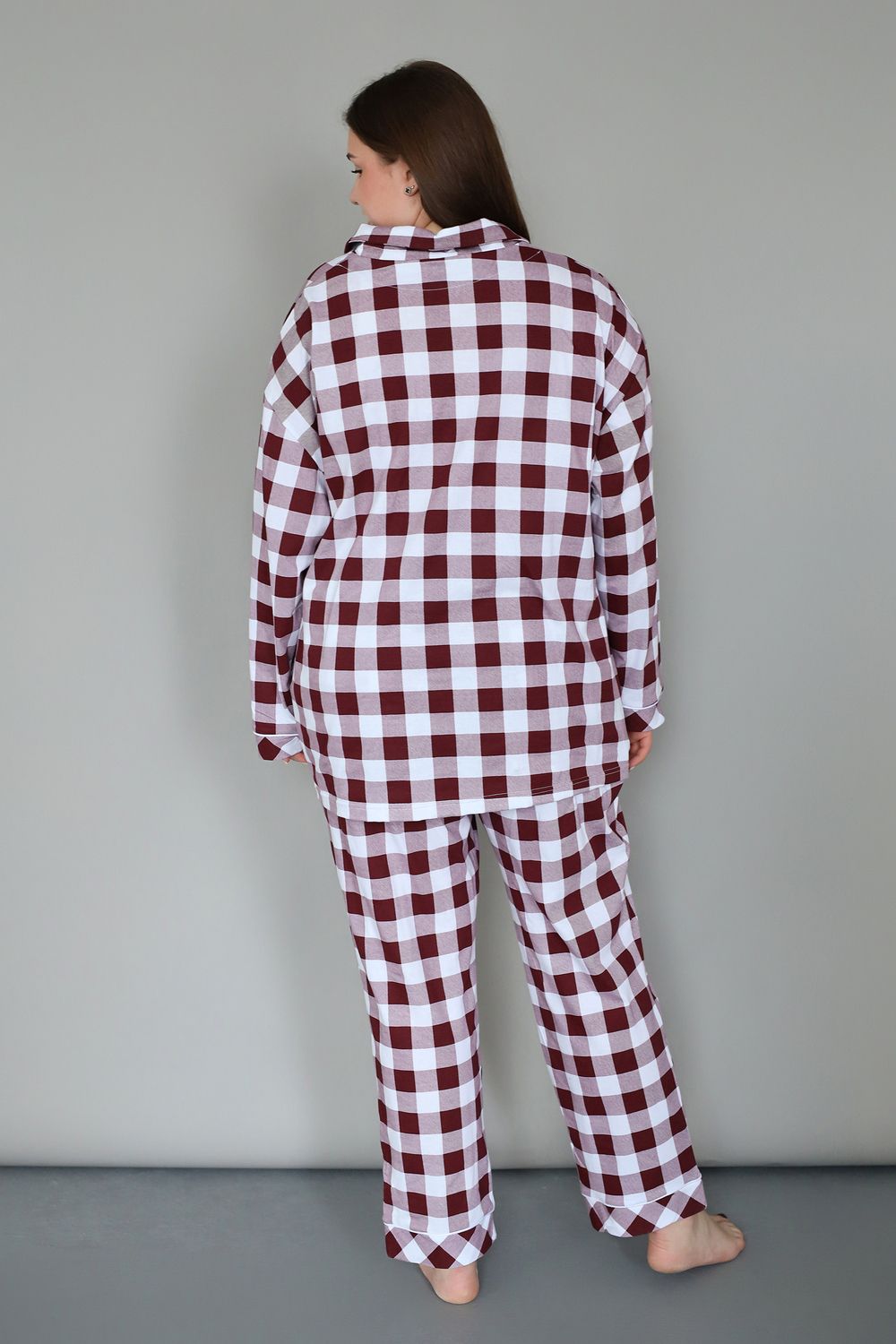 Теплая пижама больших размеров с рубашкой и штанами - бордовый
