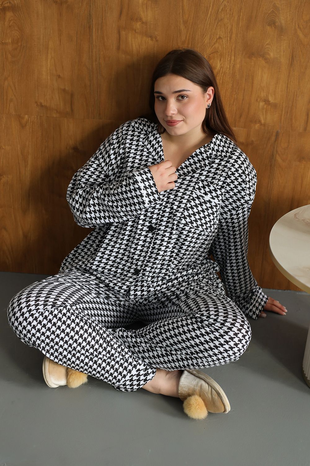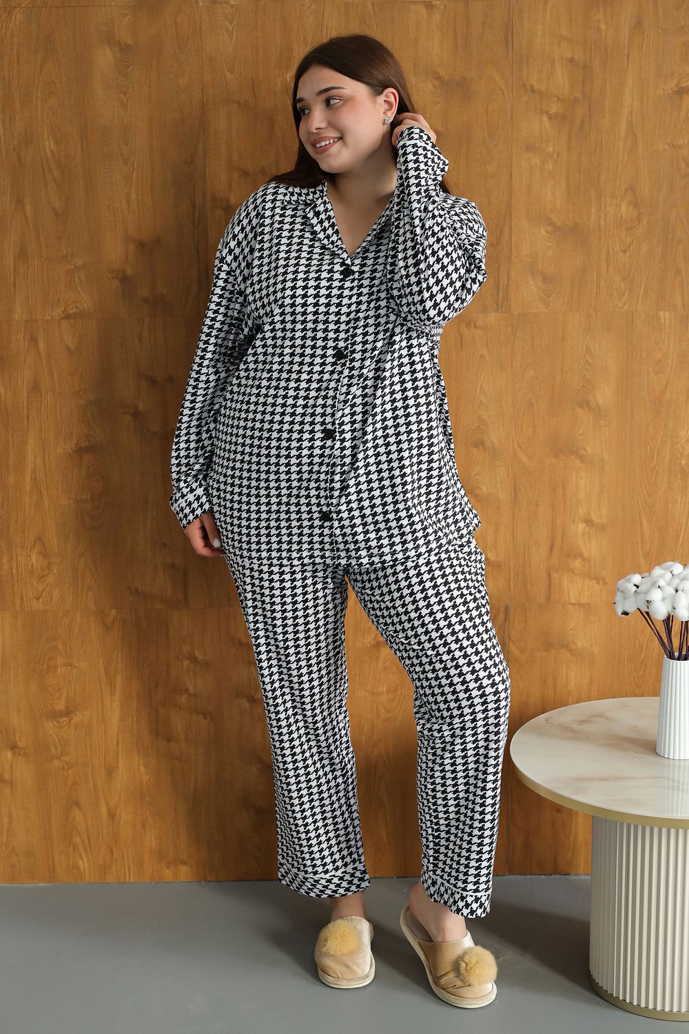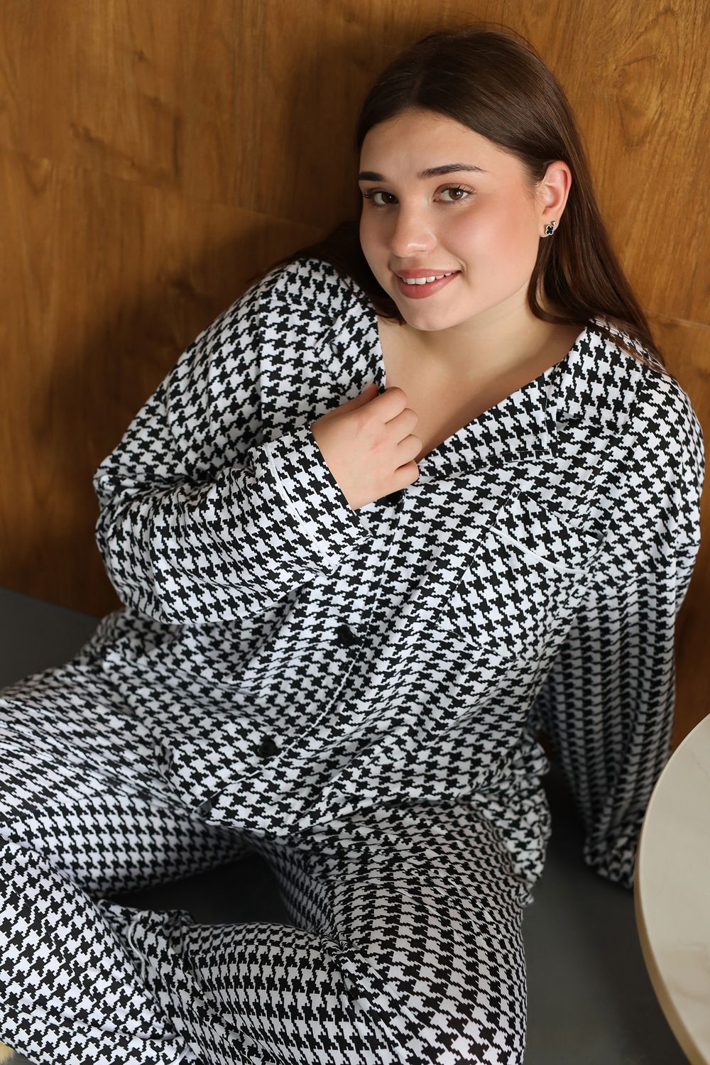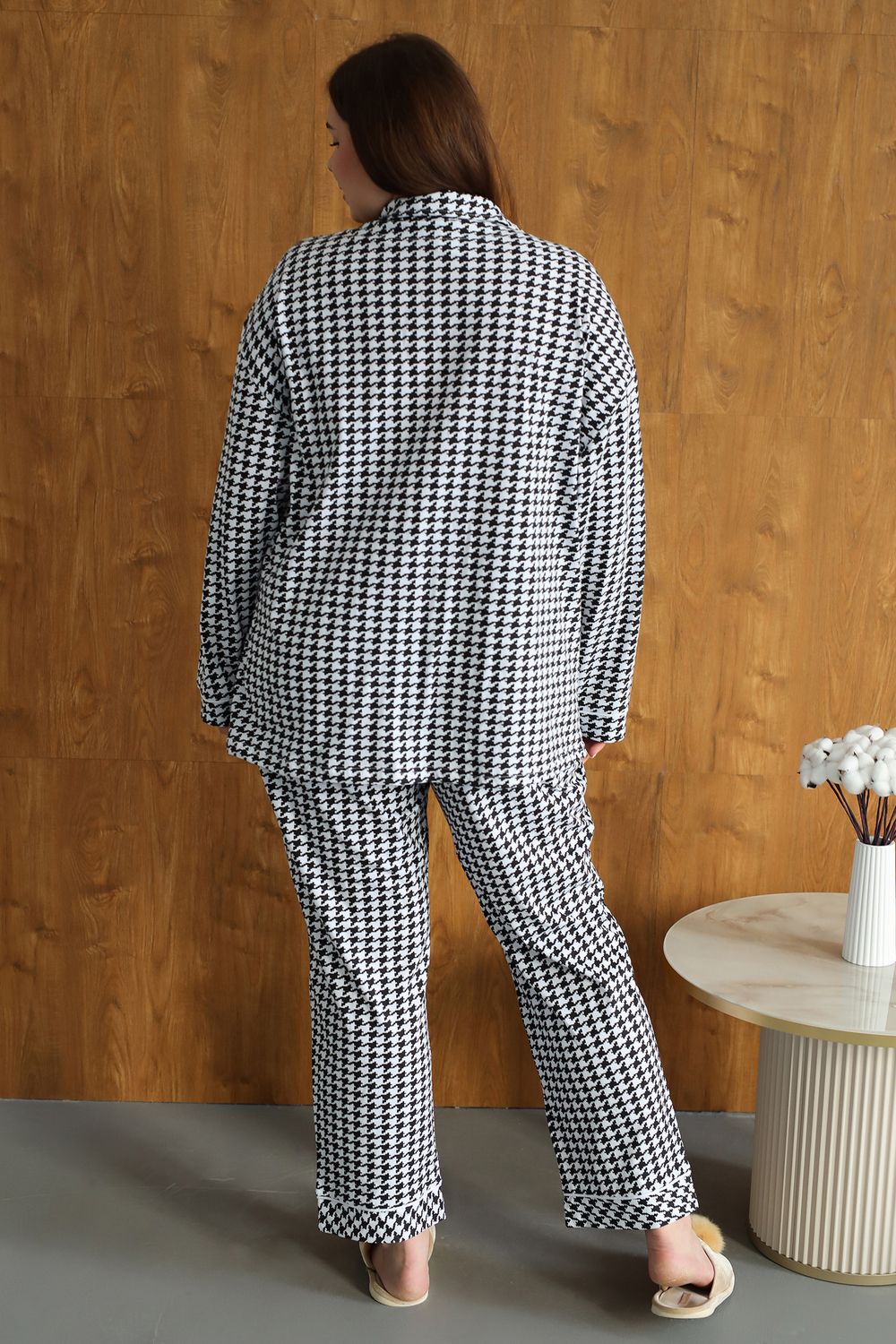 Теплая пижама больших размеров с рубашкой и штанами - черно-белый