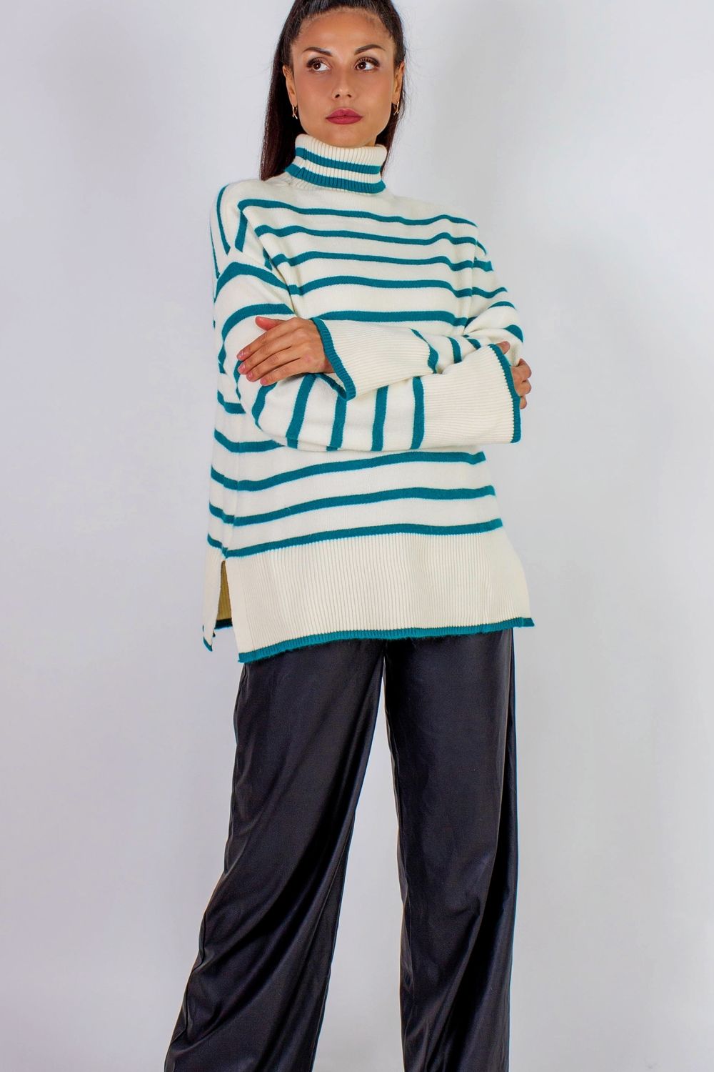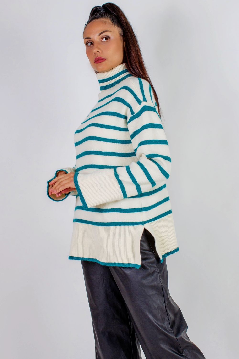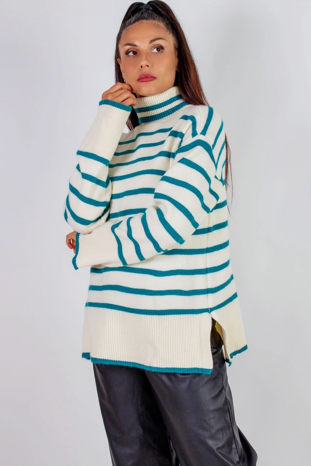 Теплая туника в полоску высокий ворот арт. 2918 - молочный+бирюзовая полоса