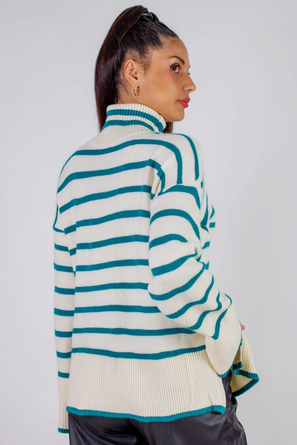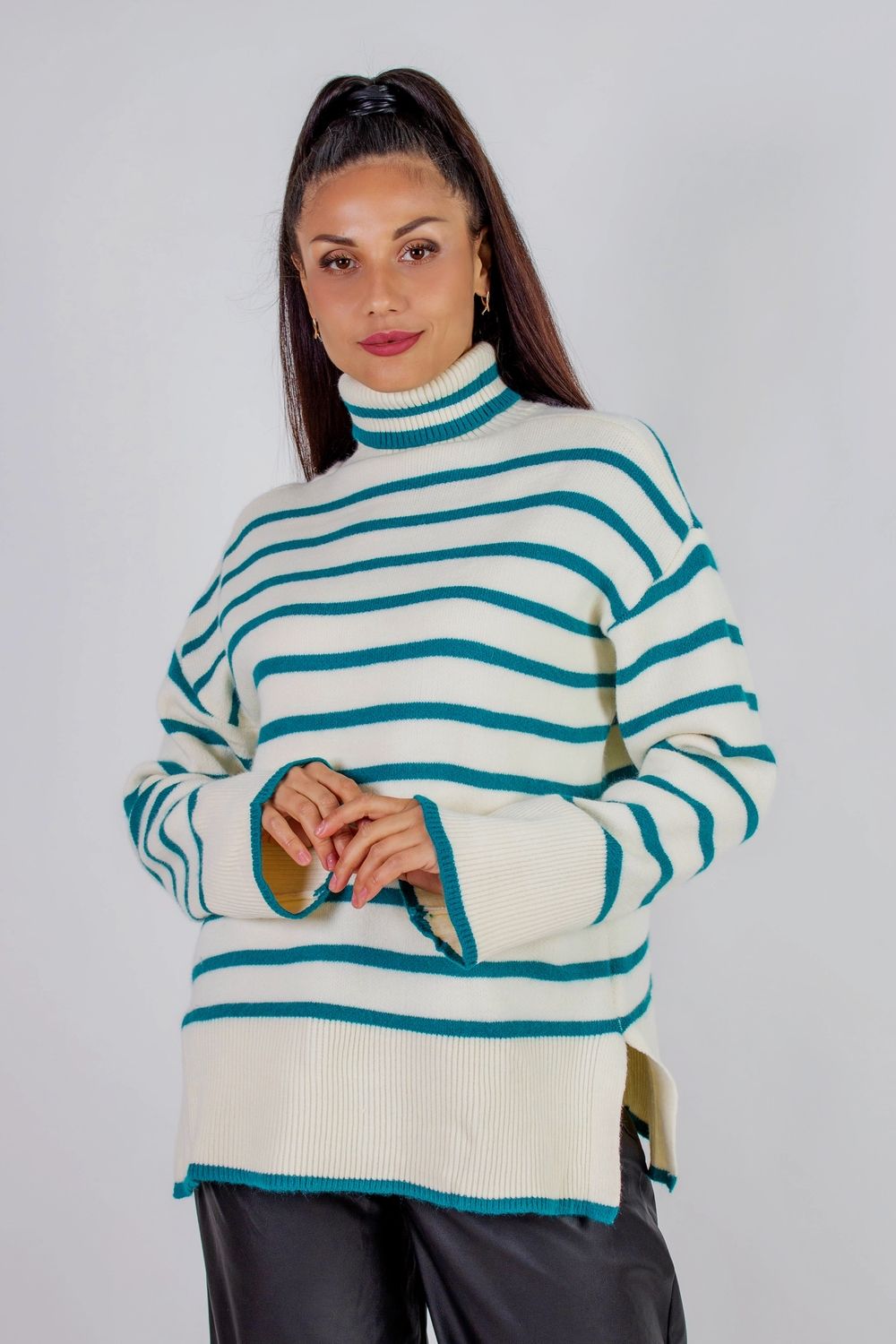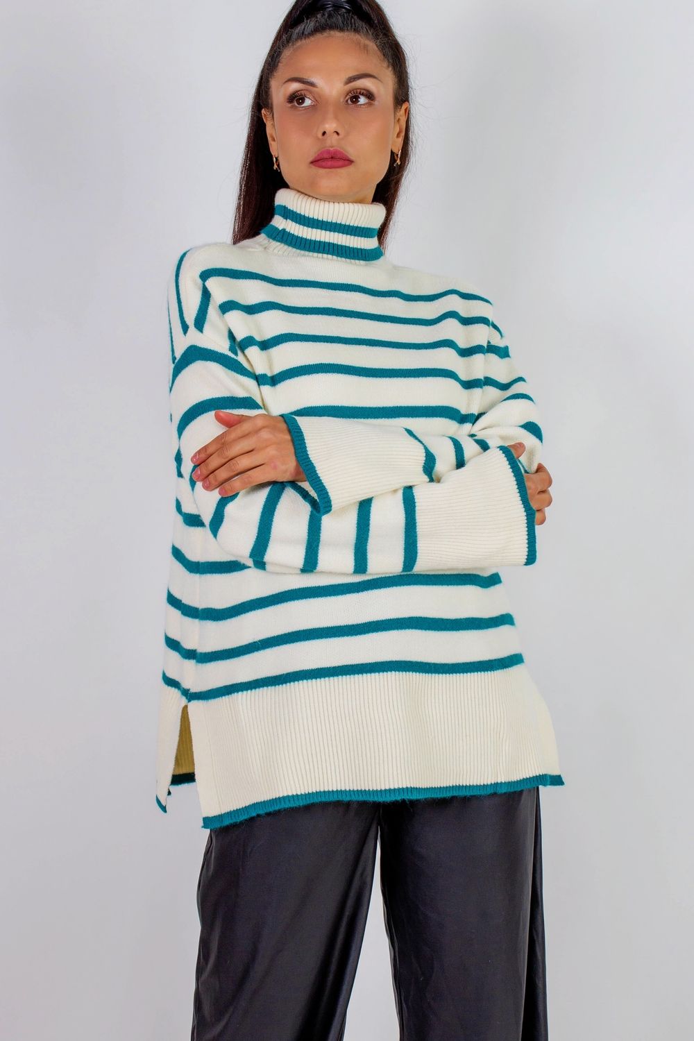 Теплая туника в полоску высокий ворот арт. 2918 - молочный+бирюзовая полоса