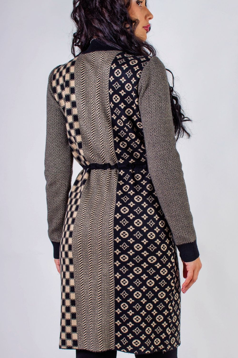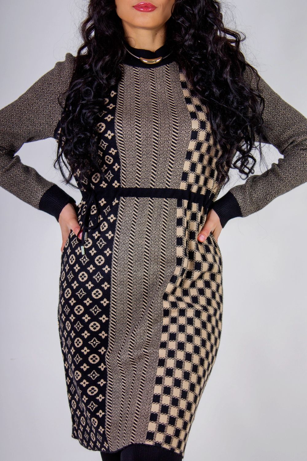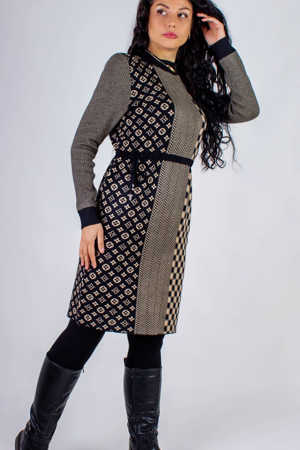 Классическая расцветка платья дополняется различными актуальными текстурами, расположенными полосами, что не только придаёт изделию изысканный вид, но и визуально удлиняет силуэт, делая фигуру более стройной и элегантной. Округлая горловина с мягкой резинкой создает уютное чувство, а рукава с подобными манжетами делают образ завершённым.