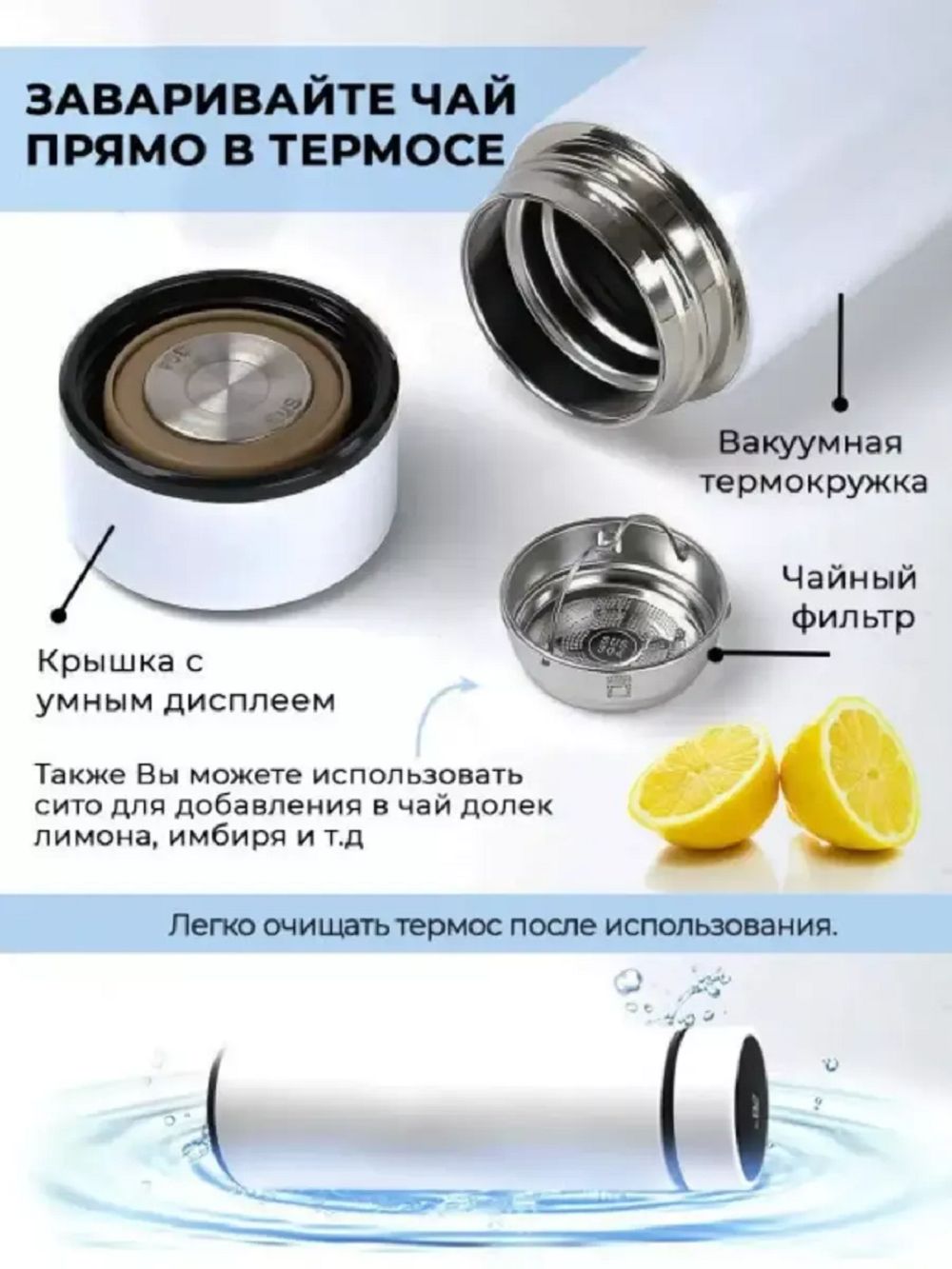 Представляем вам идеальное решение для любителей горячего напитка - наш невероятно стильный и удобный термос! Благодаря своей компактности и прочности, умная термос-бутылка объем 0,5 л станет надежным спутником в любых поездках и приключениях. К тому же он может стать отличным подарком для близких людей, которые ценят функциональность. Имеет ситечко-фильтр. Благодаря использованию высококачественных материалов, термокружка обеспечивает длительное сохранение тепла, что особенно актуально в холодное время года. Независимо от погоды, ты сможешь наслаждаться вкусным чаем и сохранять поднятое настроение.