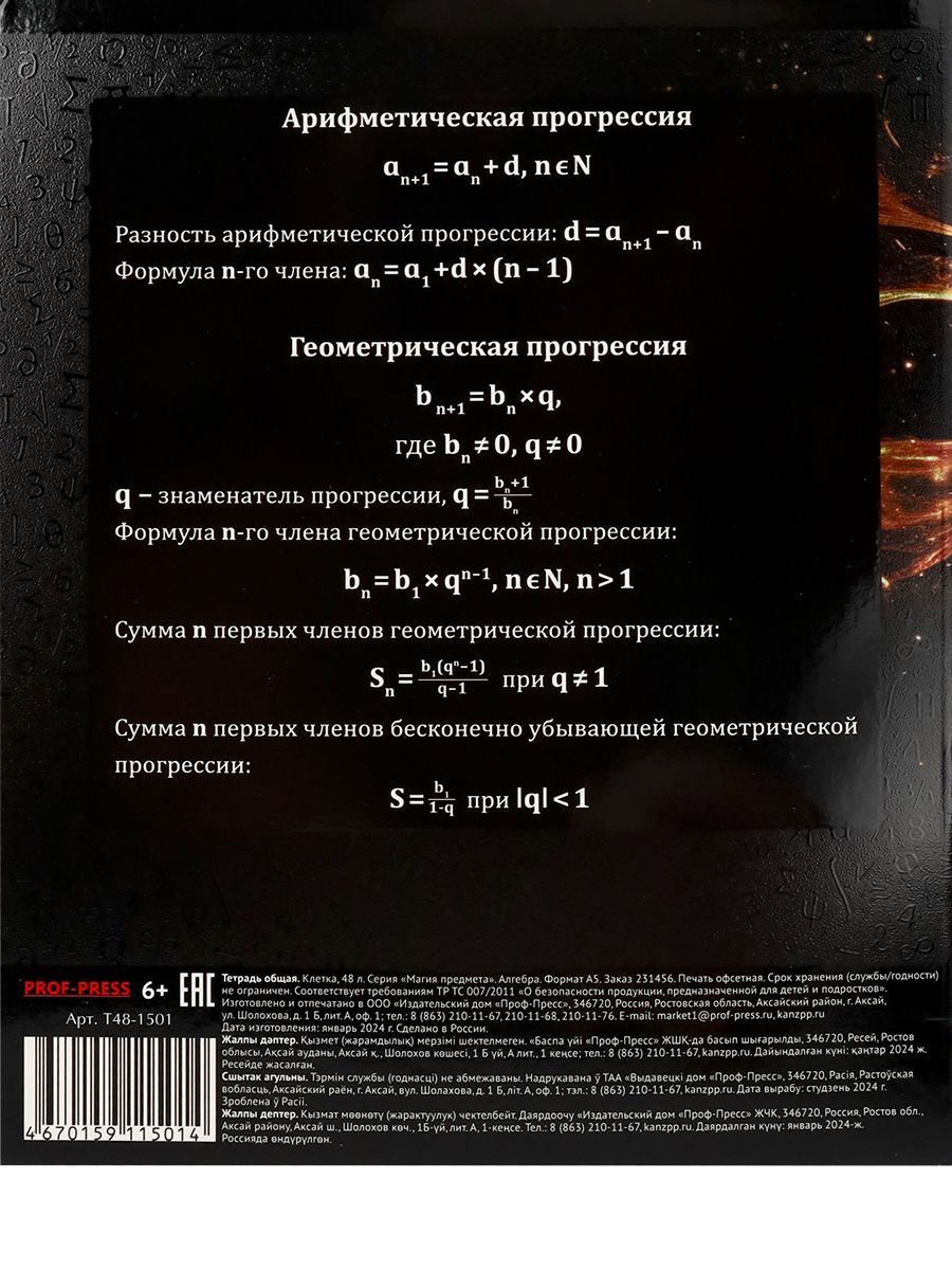 На протяжении всего обучения в школе главным помощником для ученика является тетрадь! Новая серия "Магия предмета" — это серия из 16 предметных тетрадей, тактильный и визуальный дизайн которых притягивает к более углубленному изучению предметов. Магическое мерцание фольги и блеск твин-лака на отдельных элементах обложки особенно эффектно выглядит на черном фоне. Внутри расположен справочный материал с подсказками по соответствующему школьному предмету. Обложка: мелованный целлюлозный картон, печать по холодной фольге, твин-лак. Внутренний блок: офсет 60 г/м 100 % белизны, 48 листов. Линовка: клетка.