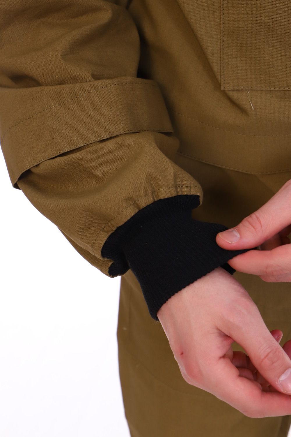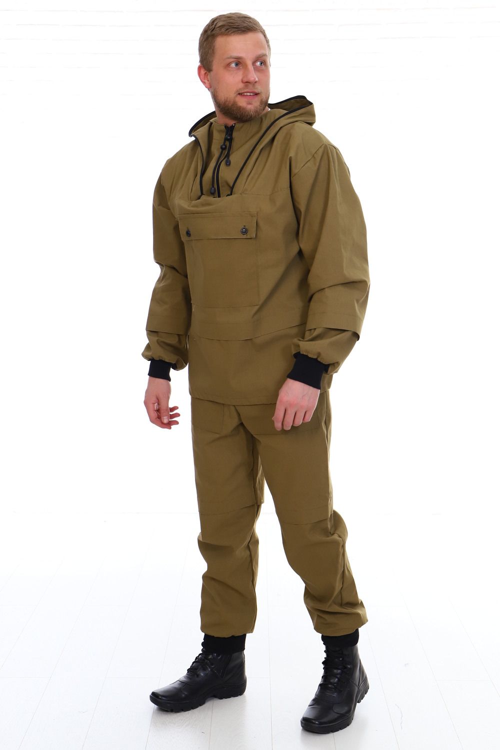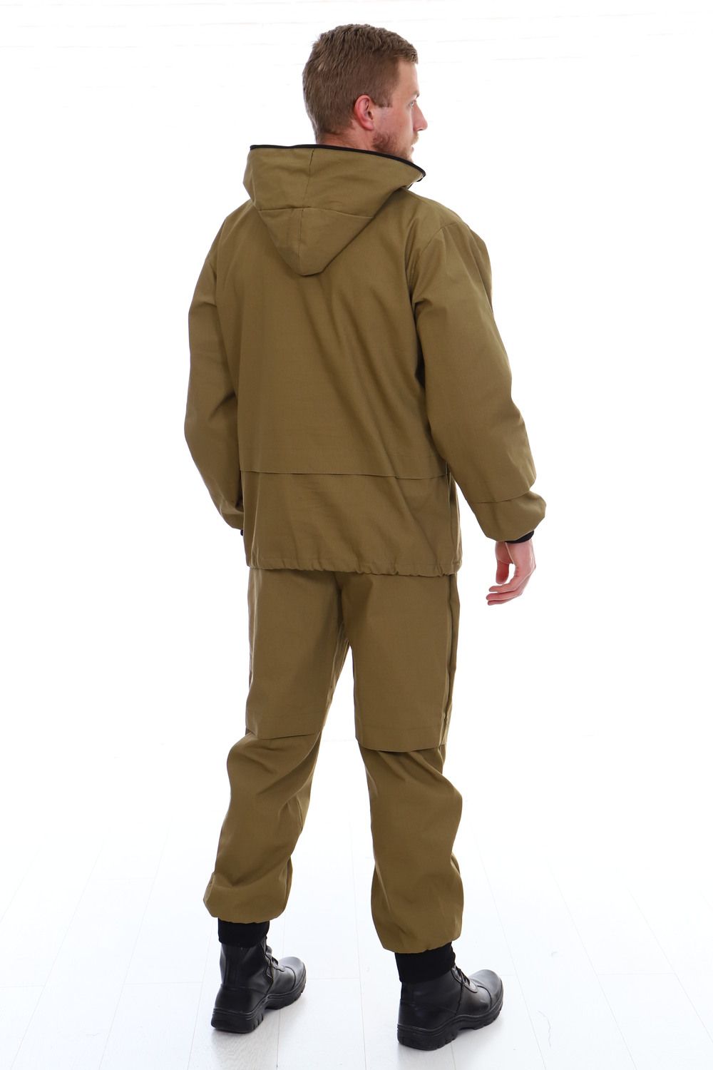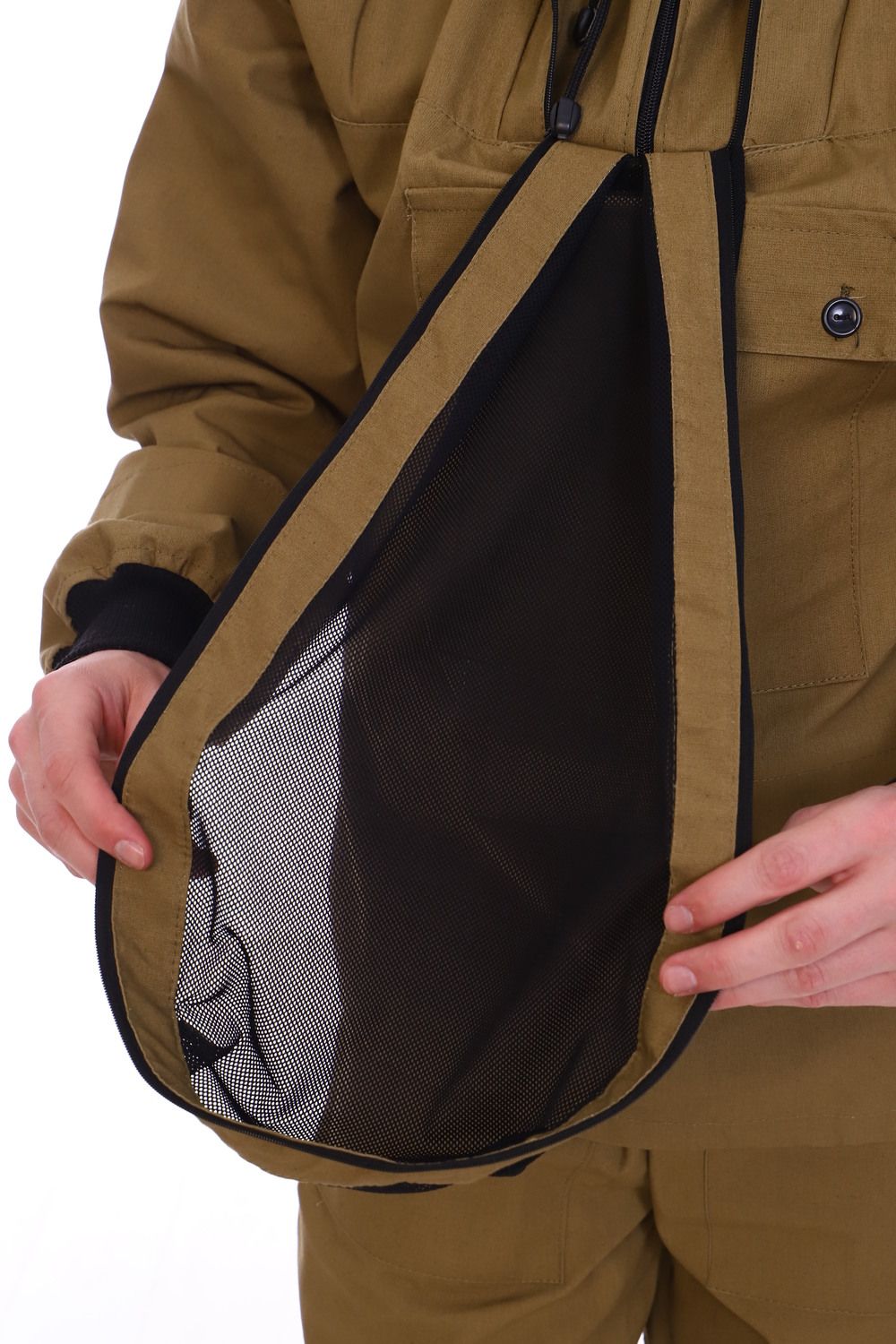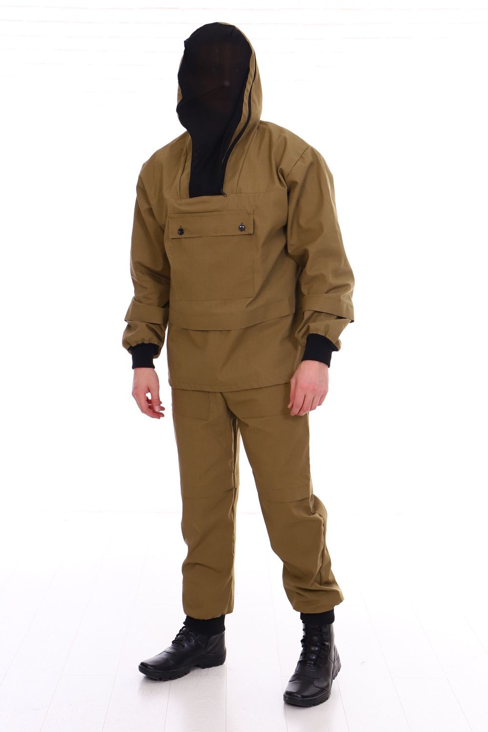 Противоэнцефалитный костюм цвета хаки от клещей, гнуса и комаров, пчел, подойдёт не только как спецодежда на лесозаготовке, в сельском хозяйстве, для пчеловодов и во многих других отраслях, но может использоваться и как костюм для страйкбола, пейнтбола, охоты, рыбалки, туризма и других видов активного отдыха. Костюм состоит из куртки - анорак и брюк. Куртка с капюшоном и противомоскитной сеткой, сетка отстегивается и убирается в специально предназначенный карман. Костюм противоэнцефалитный выполнен в полном соответствии с ГОСТ Р 12.4.296-2013, поэтому снабжен не только противомоскитной сеткой, но и противоклещевыми ловушками на штанинах, рукавах и куртке. Накладные карманы с клапанами на пуговицах. Куртка имеет рукава с трикотажными манжетами и регулировку по низу, брюки с притачным поясом с эластичной тесьмой (резинкой) по талии, с трикотажными манжетами снизу. Защитные свойства: З МИ, от общих производственный загрязнений и истирания, от вредных биологических факторов. По стандартам для спецодежды, длина рукава измеряется от линии втачивания воротника, длина брюк от шва втачивания пояса (без учета его ширины) до низка брюк.