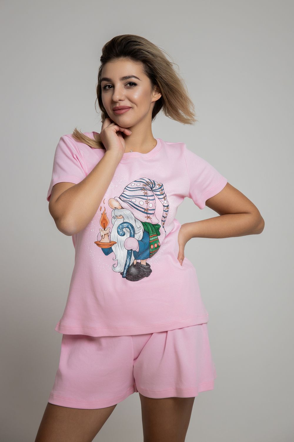 Пижама с футболкой и шортами. Футболка свободного силуэта, на полочке декоративная печать в стиле шелкографии. Шорты свободные на резинке без карманов.