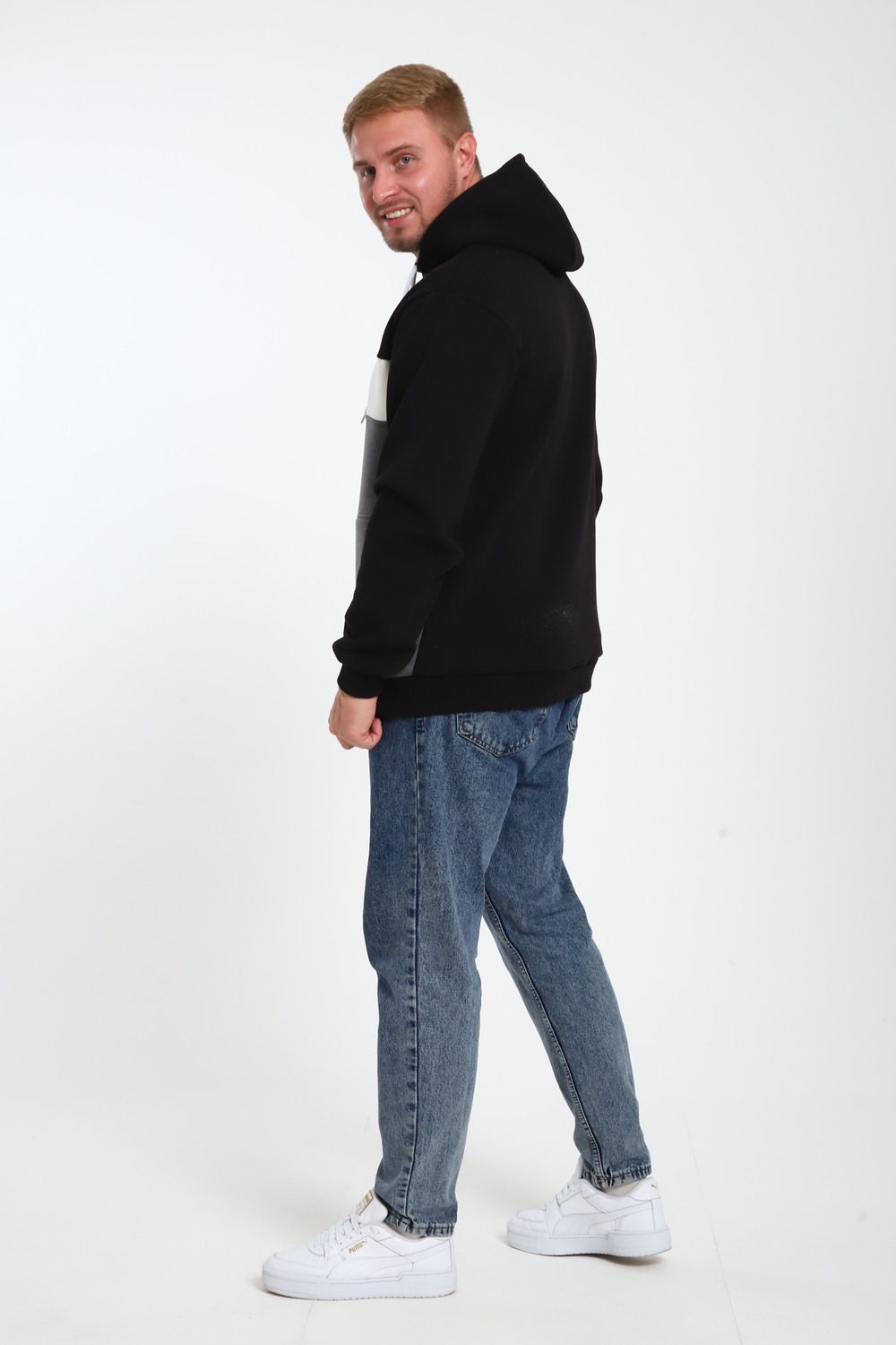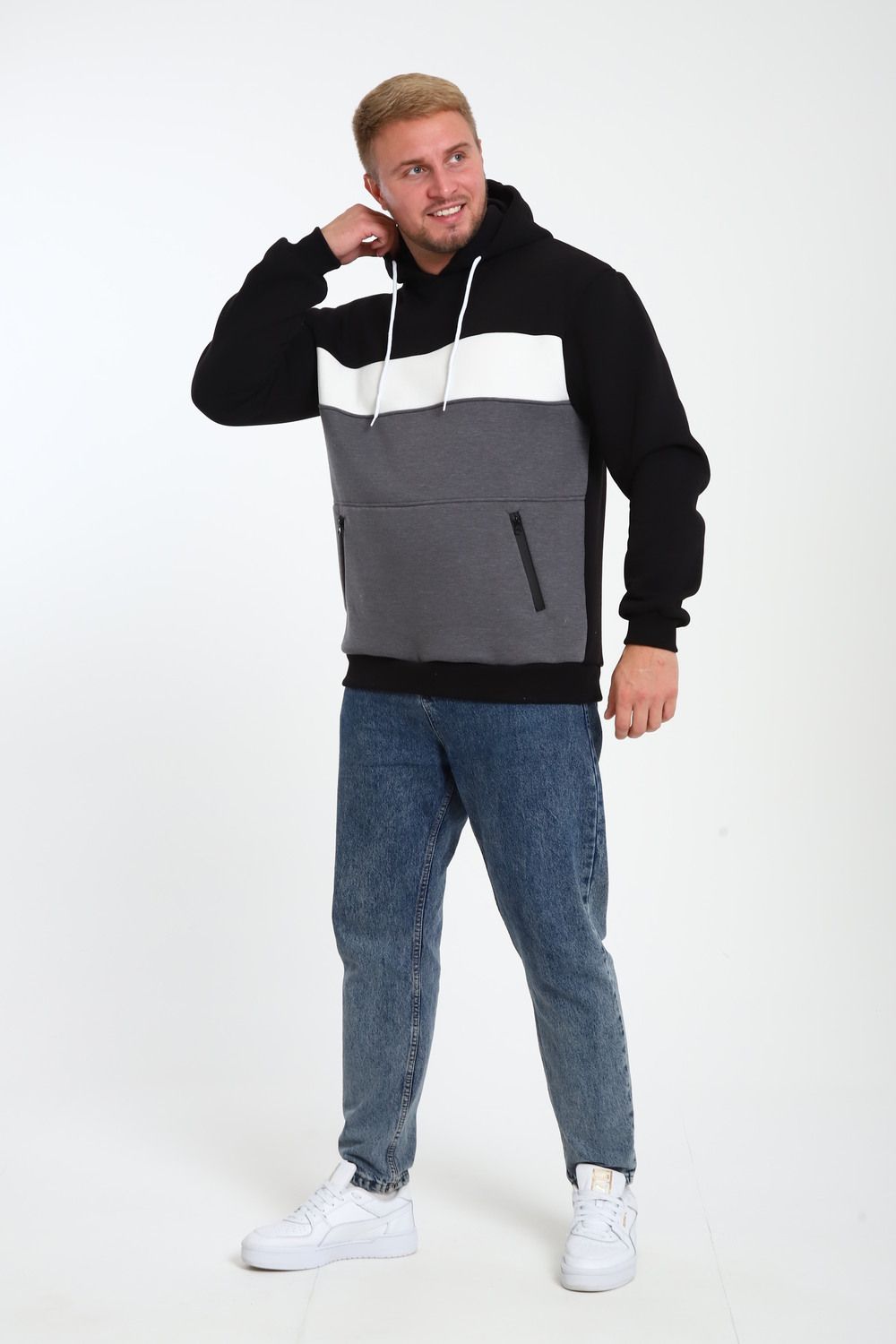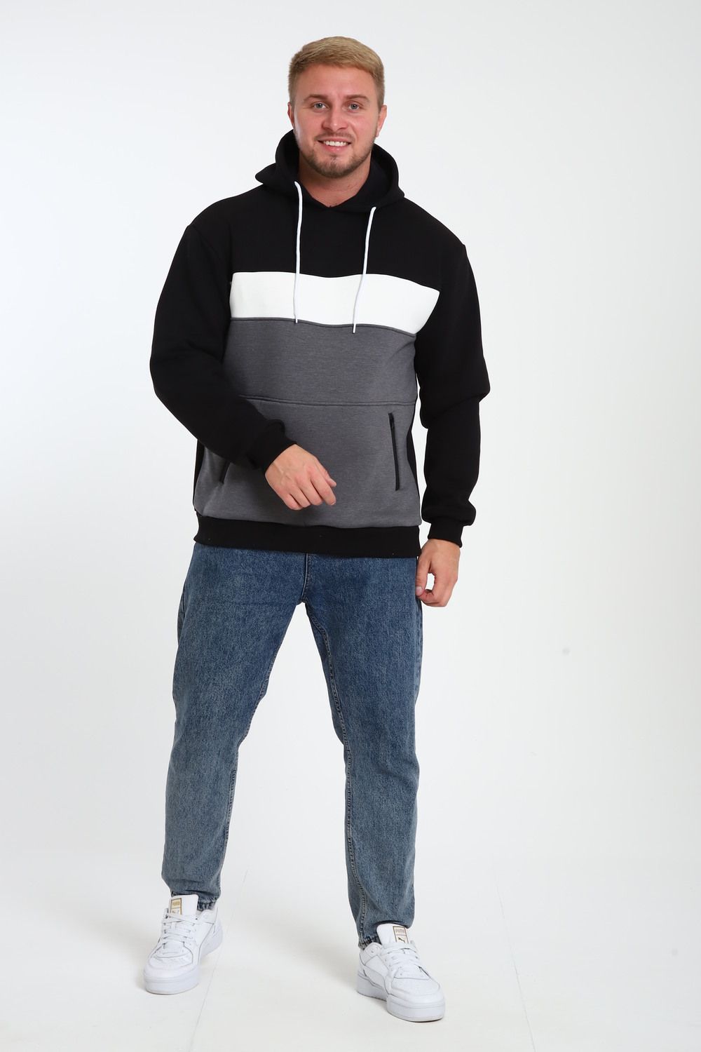 Стильная мужская толстовка с капюшоном выполнена из футера трёх нитки пенье компакт. Она имеет начес, что делает её идеальным выбором для прохладных дней. Капюшон регулируется шнурком. По бокам расположены вместительные карманы на молнии (кенгуру). Доступна в нескольких базовых расцветках с контрастными вставками по типу колор-блок. Первая стирка с изнаночной стороны при 30 градусах. При первой стирке ворс начеса полиняет. Это нормально.