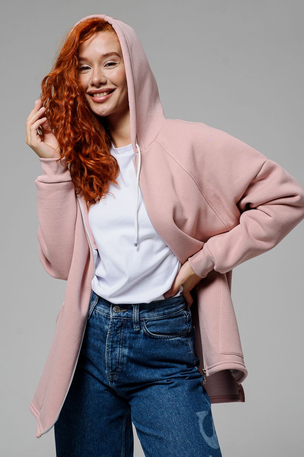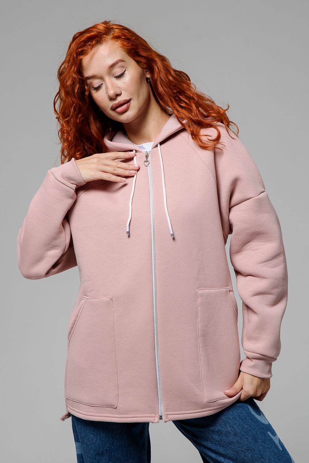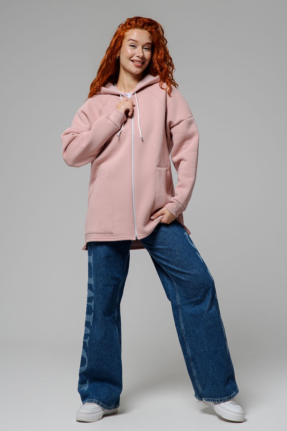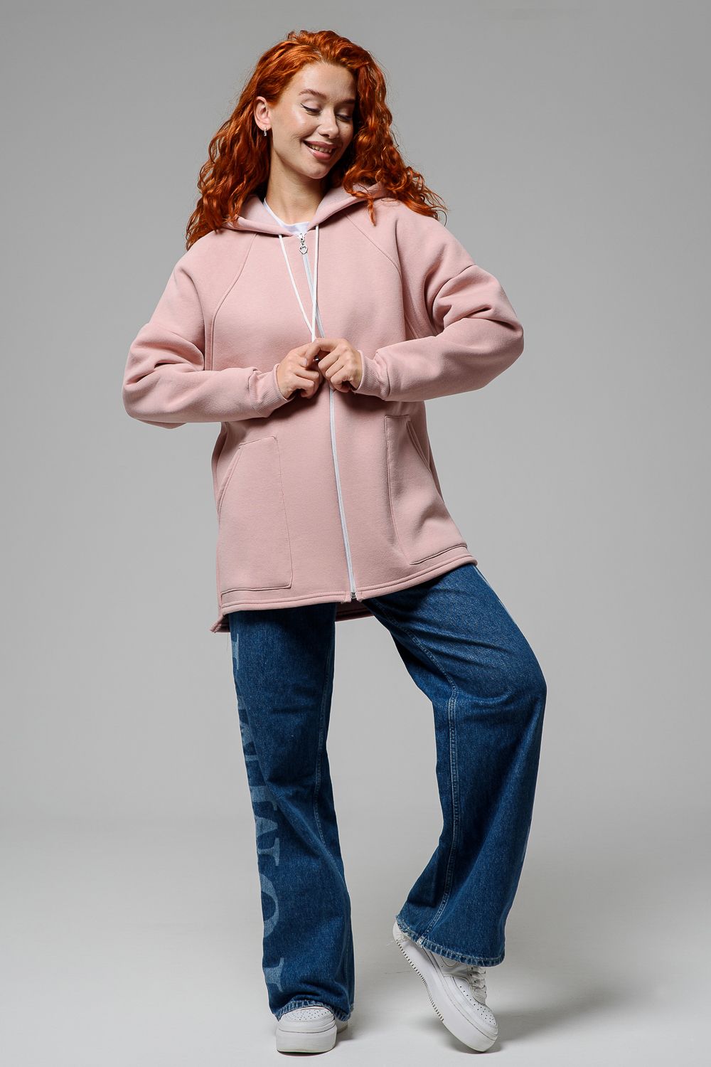 Толстовка утепленная, прямая, свободная, на молнии, с удлиненной спинкой, с капюшоном. Рукав длинный, на эластичном манжете. Полочка и спинка с фигурными кокетками. В нижней части полочки расположены удобные накладные карманы.