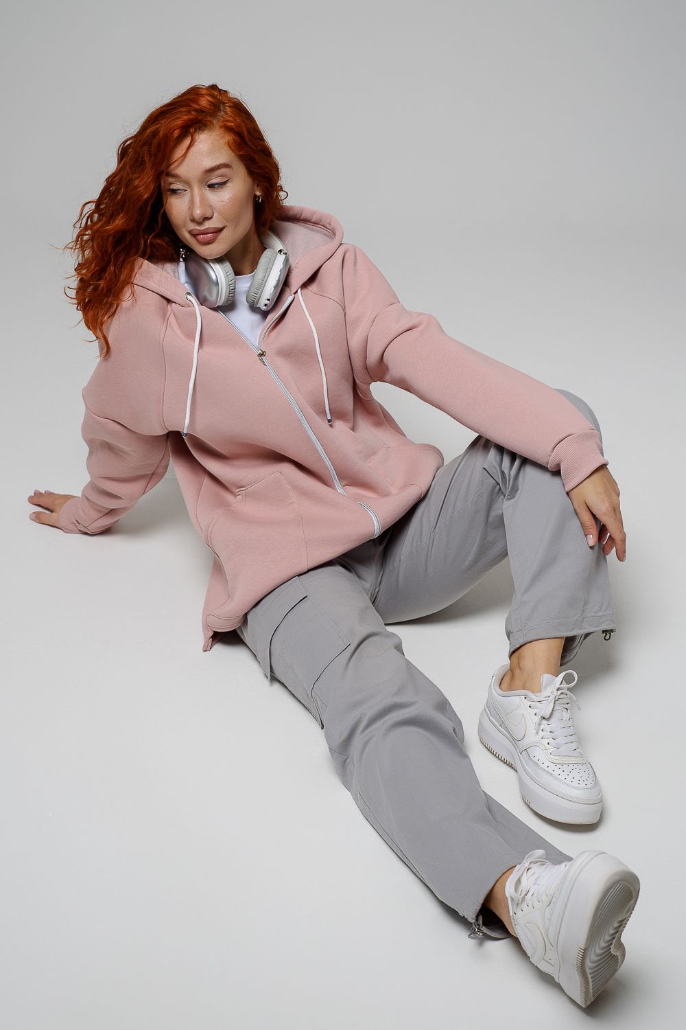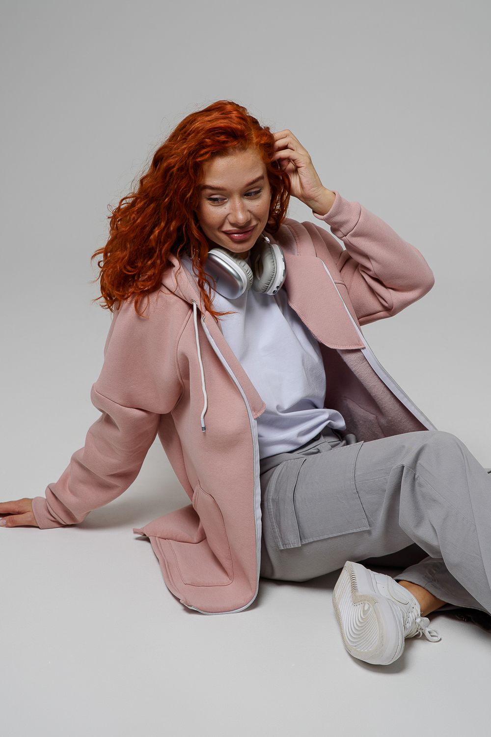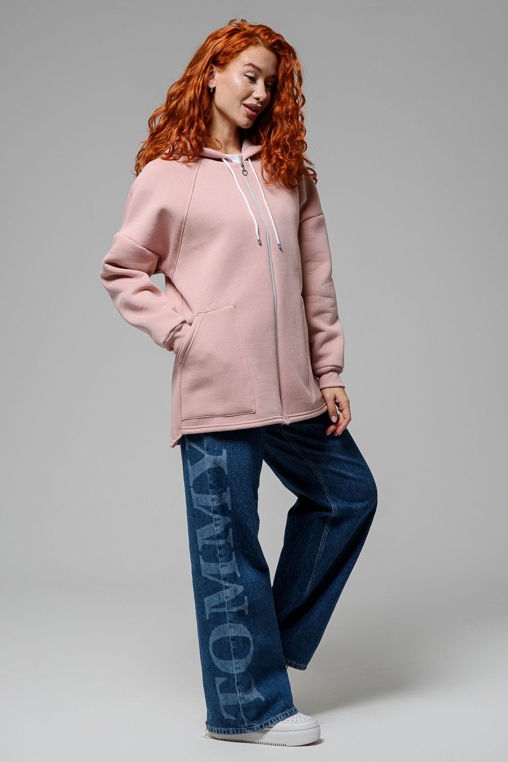 Толстовка утепленная, прямая, свободная, на молнии, с удлиненной спинкой, с капюшоном. Рукав длинный, на эластичном манжете. Полочка и спинка с фигурными кокетками. В нижней части полочки расположены удобные накладные карманы.