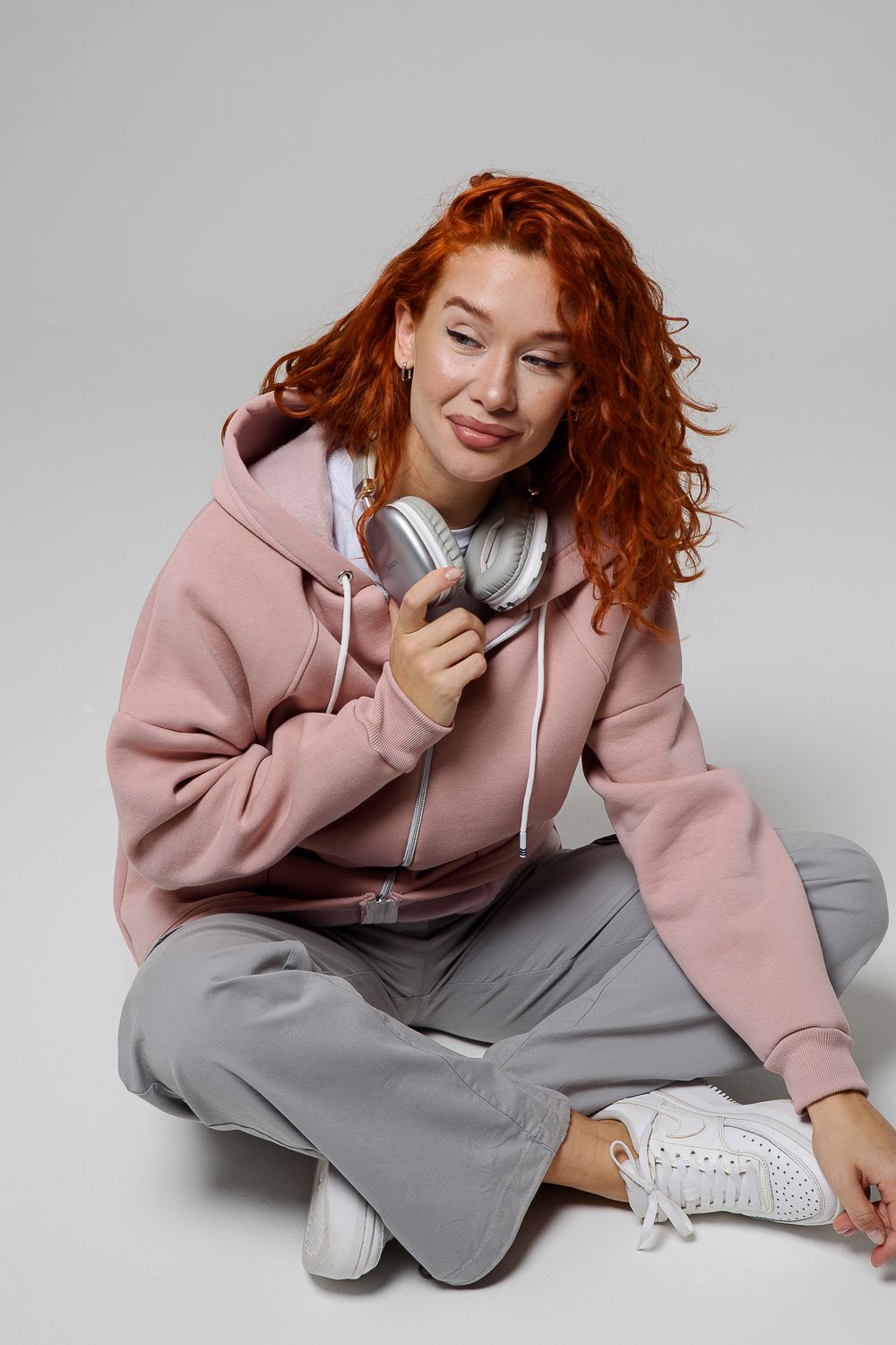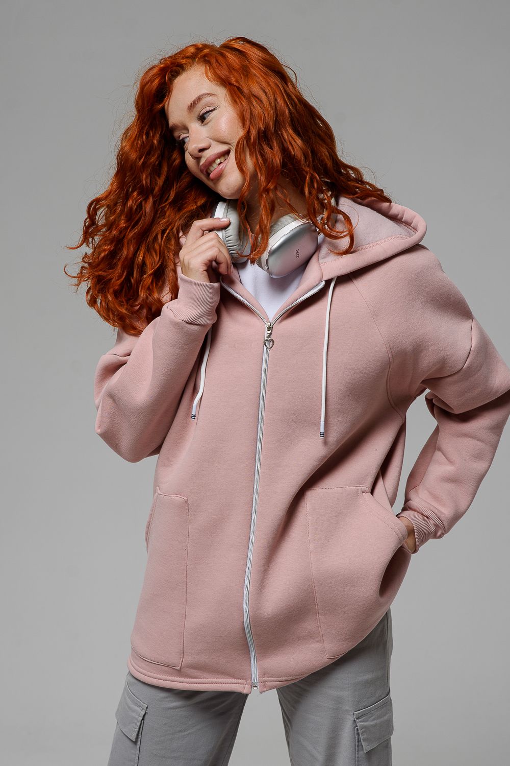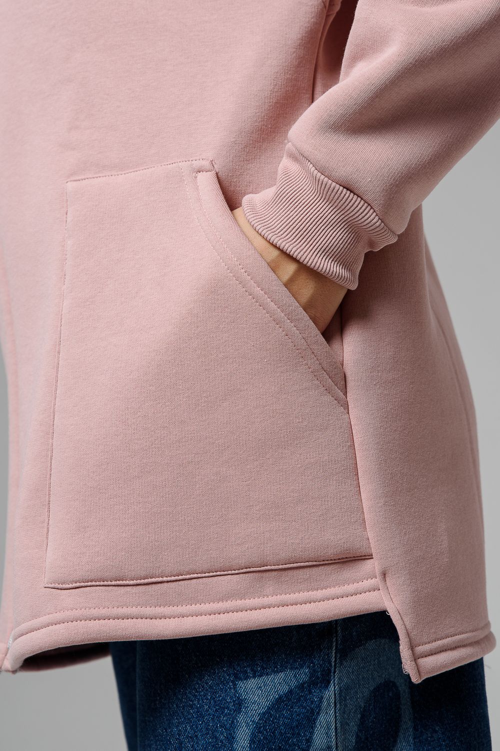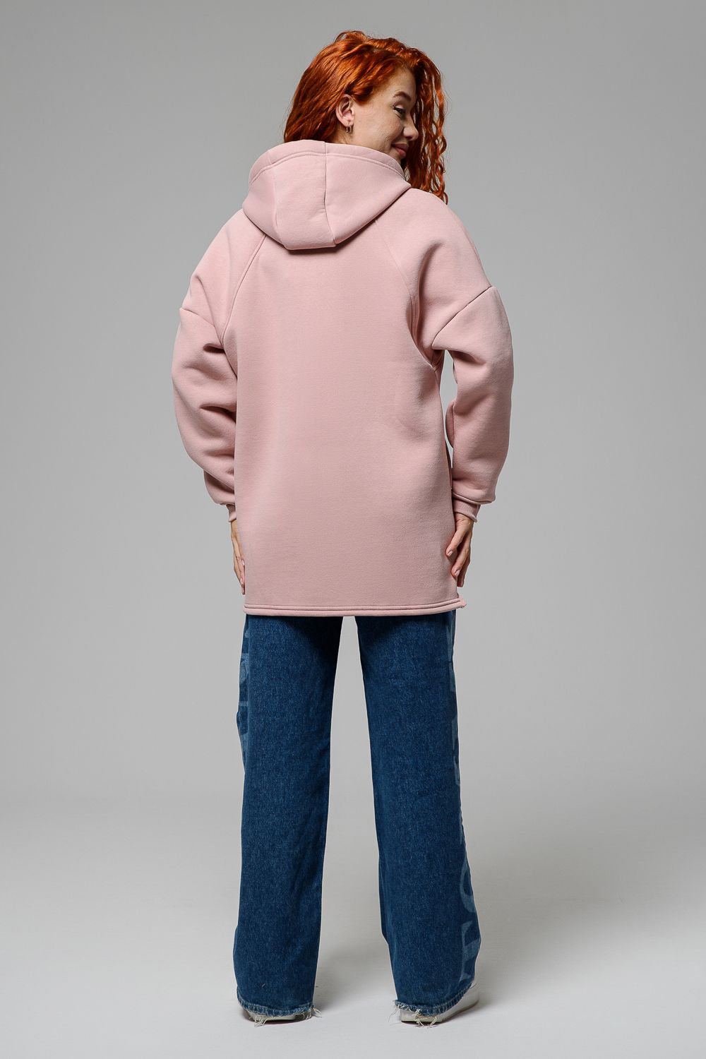 Толстовка утепленная, прямая, свободная, на молнии, с удлиненной спинкой, с капюшоном. Рукав длинный, на эластичном манжете. Полочка и спинка с фигурными кокетками. В нижней части полочки расположены удобные накладные карманы.
