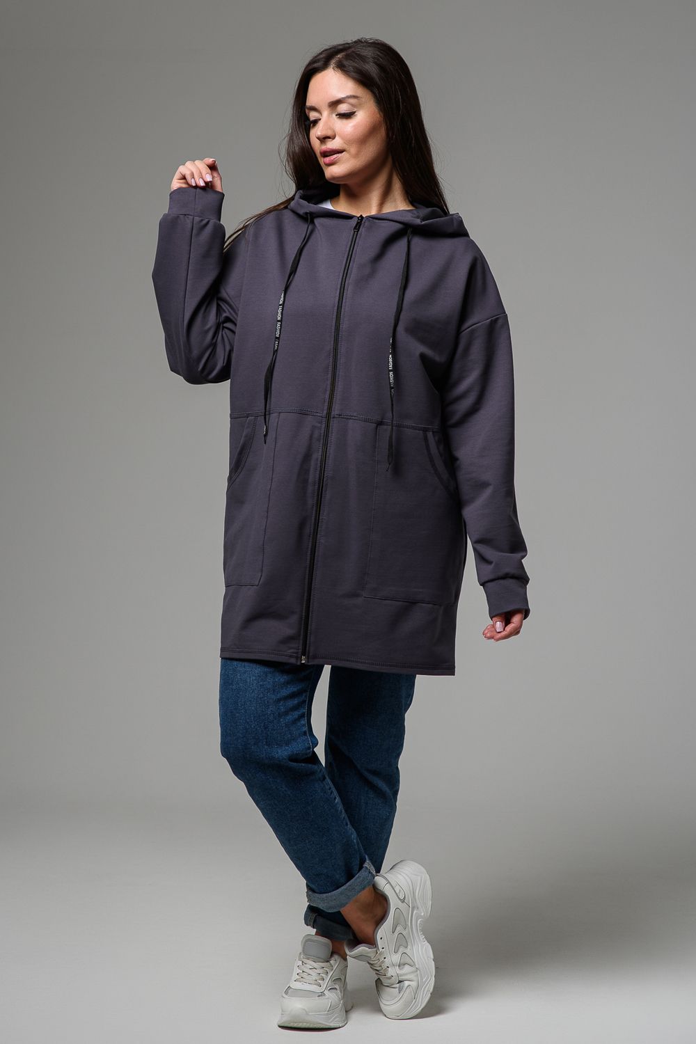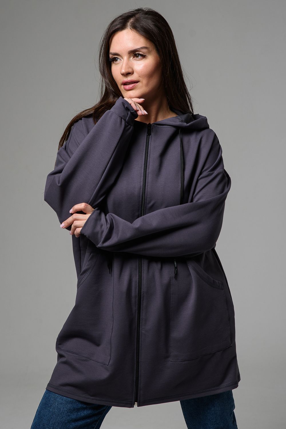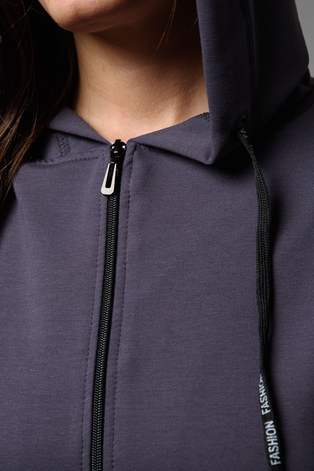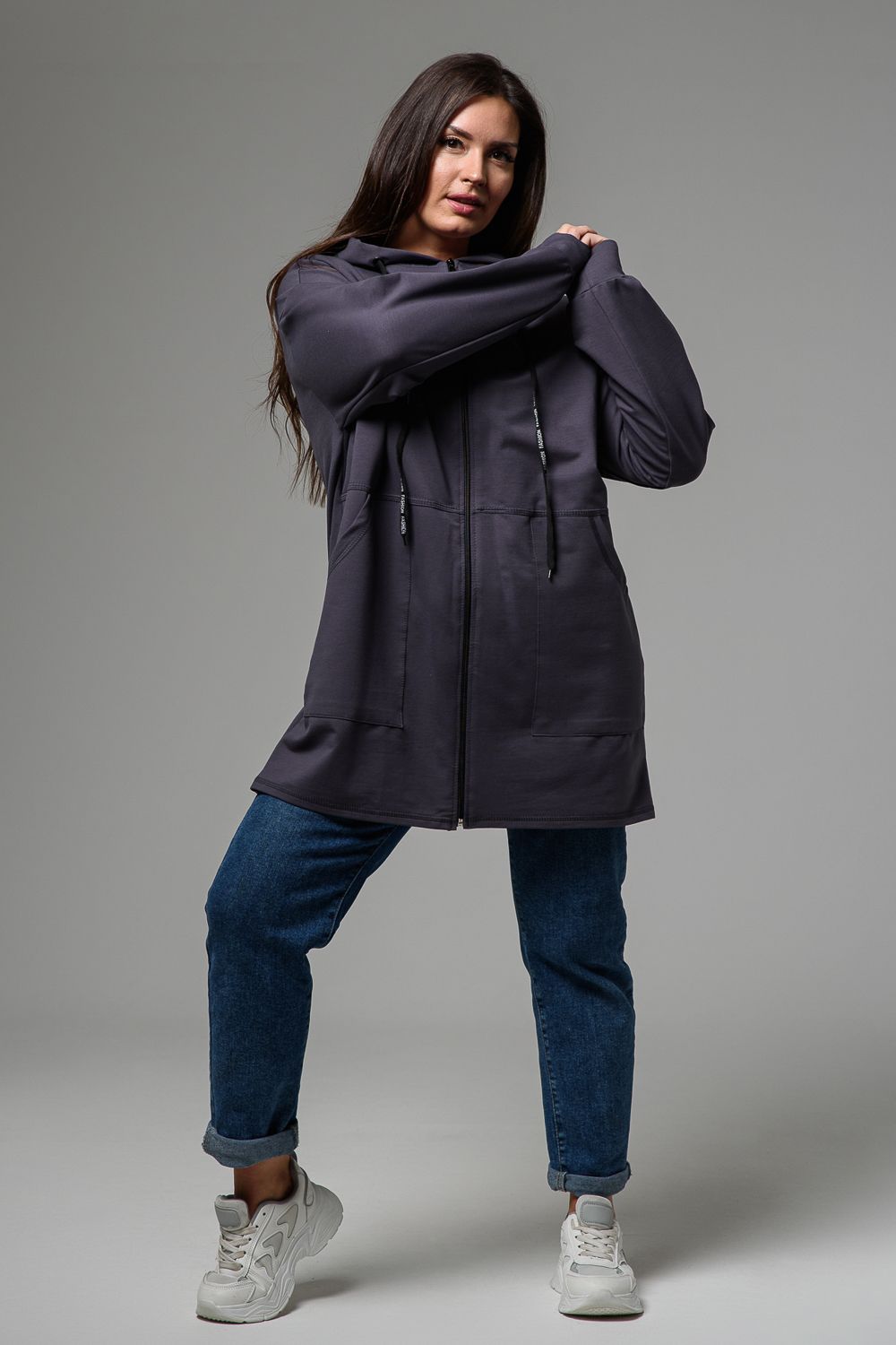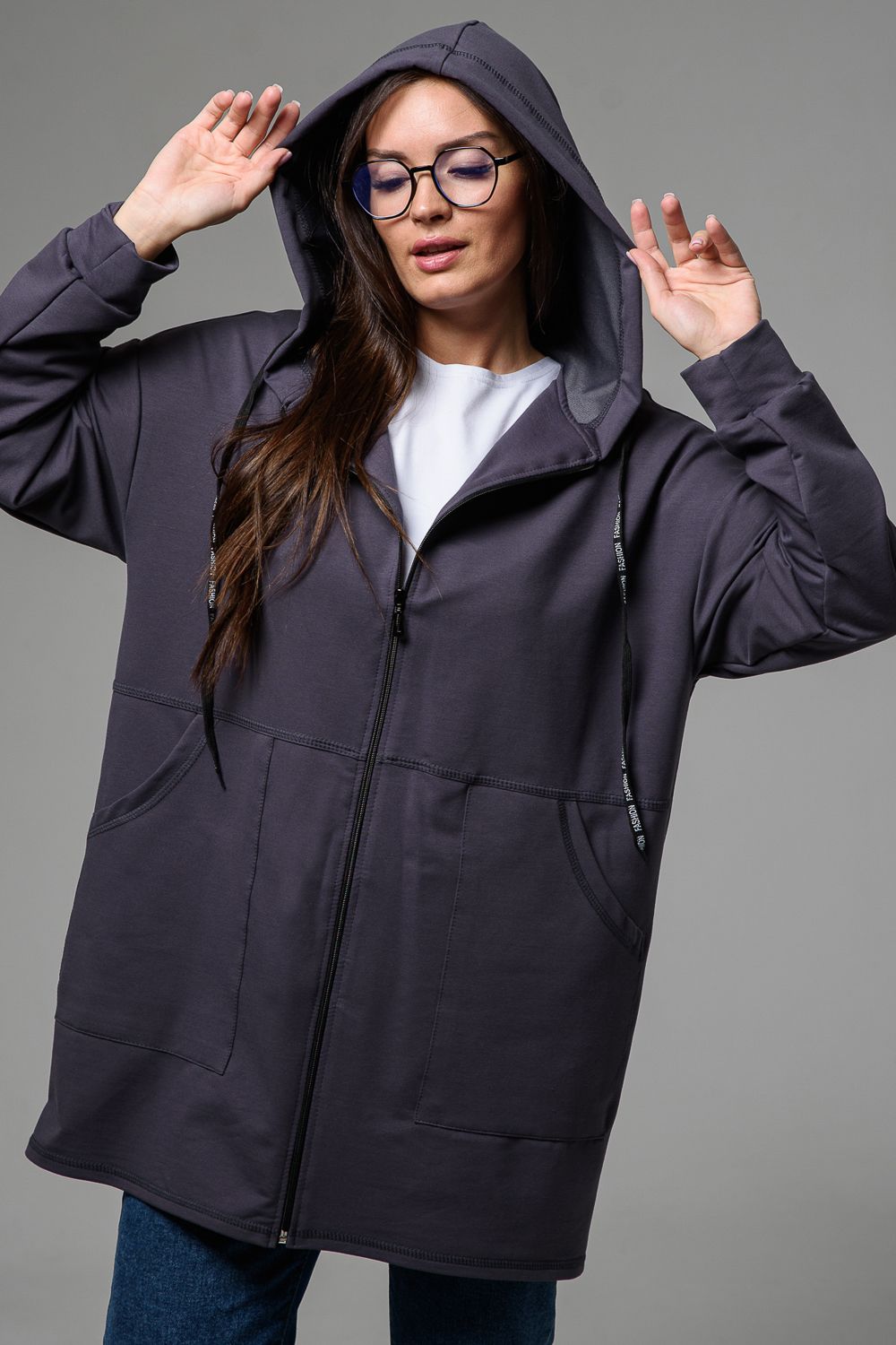 Толстовка женская прямого силуэта до линии бедер, в нижней части заужена по бокам. Рукав втачной с заниженной линией плеча, с манжетой. Капюшон с люверсами и декоративными шнурками. Застежка на тесьму-молнию. В нижней части полочки два накладных кармана. Цвет изумруд в разных оттенках.