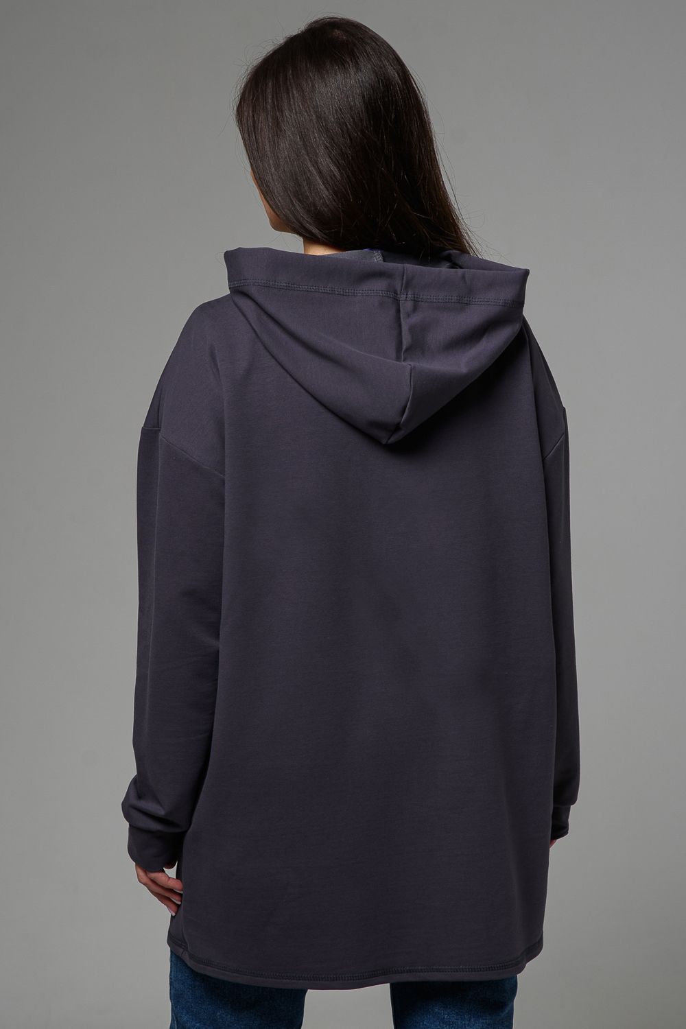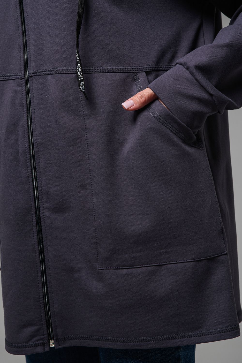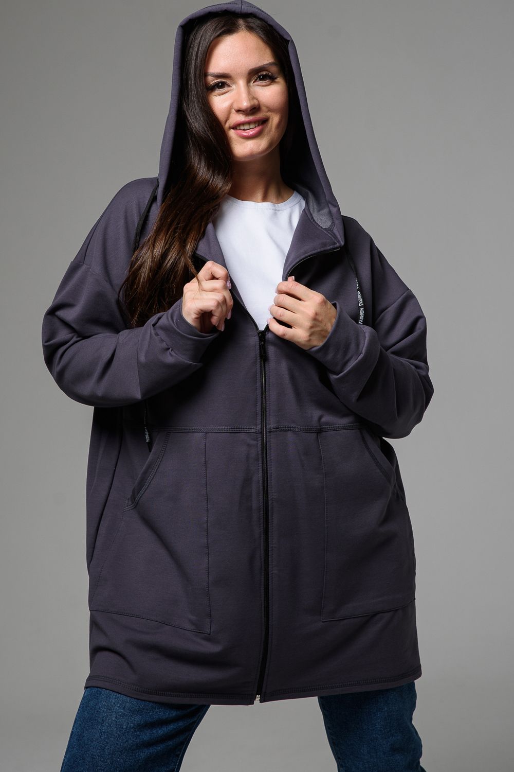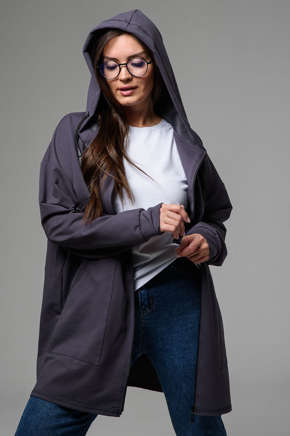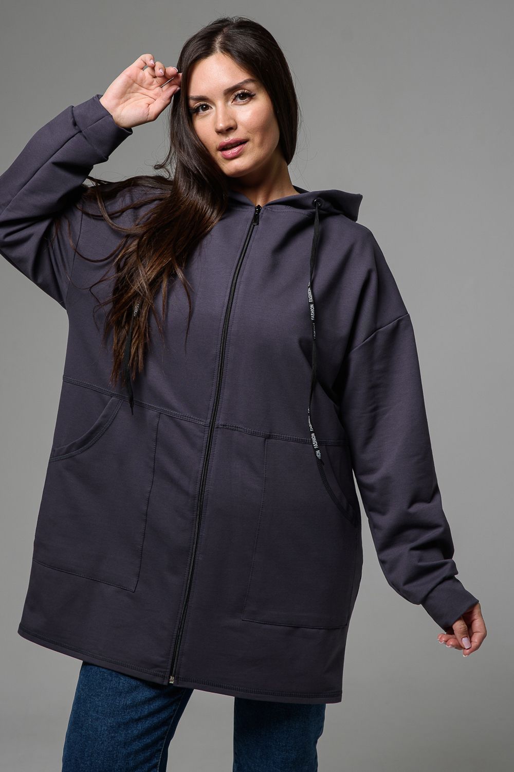 Толстовка женская прямого силуэта до линии бедер, в нижней части заужена по бокам. Рукав втачной с заниженной линией плеча, с манжетой. Капюшон с люверсами и декоративными шнурками. Застежка на тесьму-молнию. В нижней части полочки два накладных кармана. Цвет изумруд в разных оттенках.