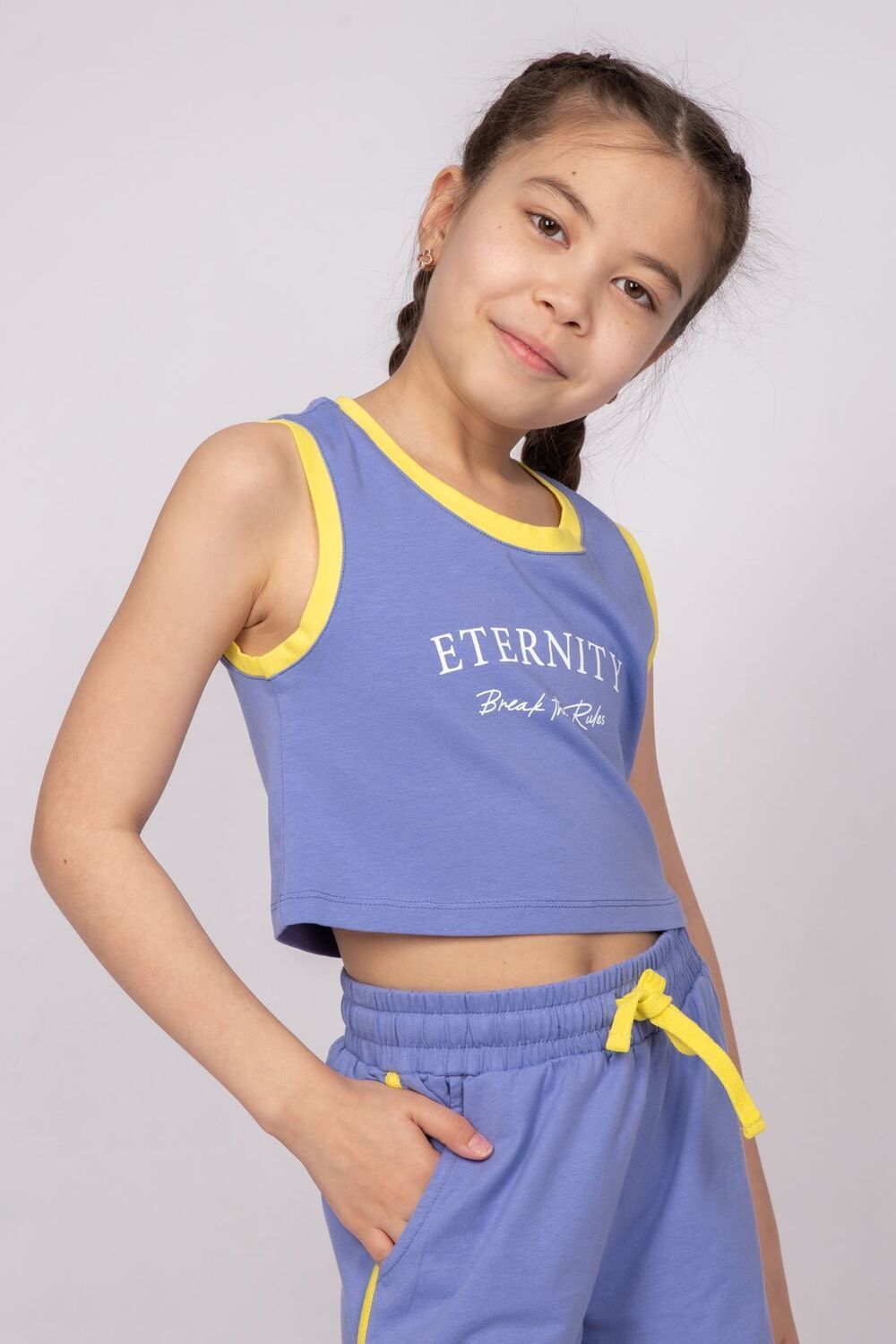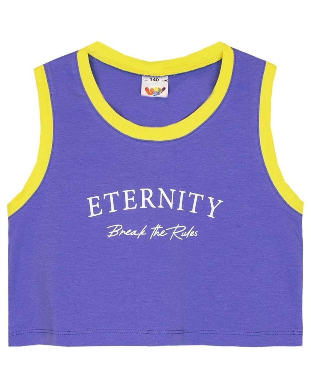 Топ для девочки приталенного силуэта из гладкокрашеного полотна. Линия горловины и проймы круглые, обработана воротником из кулирки контрастного цвета. По горловине и пройме отделочная строчка. На полочке принт Шелкография. Надпись переводится как "Вечность; Разрушай правила".