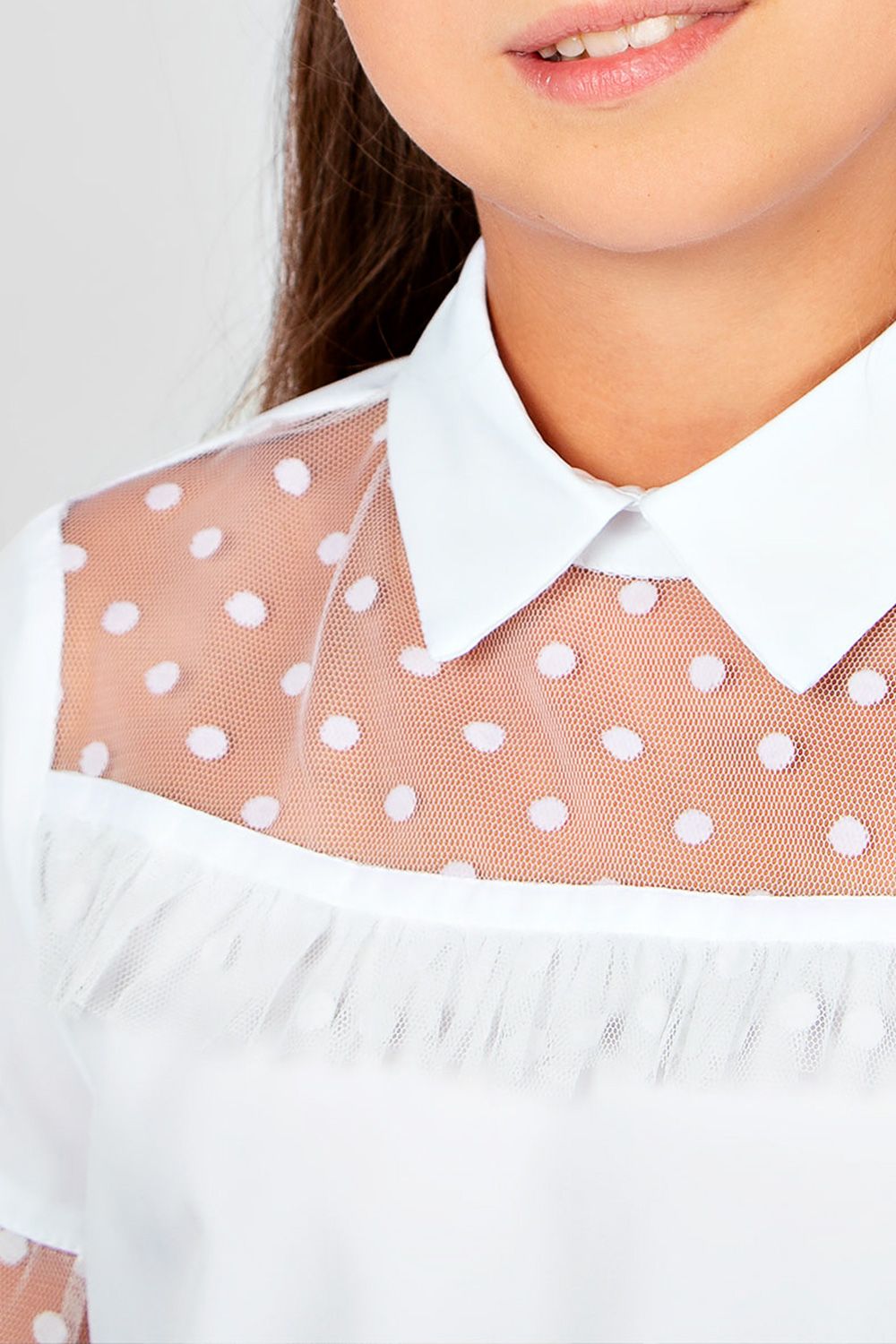Подростковая блузка белого цвета с отложным воротником. Рукава и передняя полочка выполнены из фатина. Состав материала: 70% - вискоза, 25% нейлон, 5% спандекс.