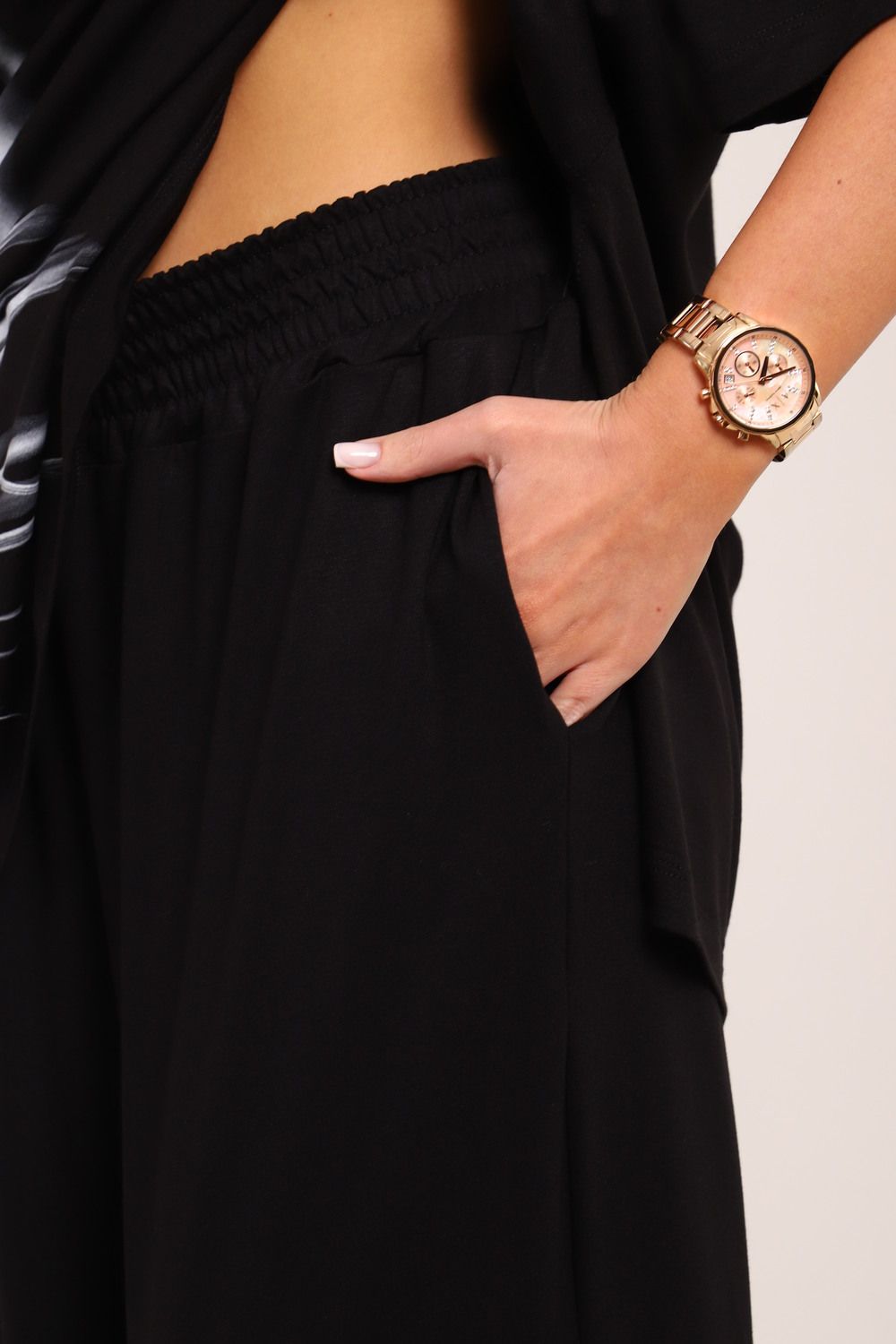 Трикотажный комплект из вискозы с удлиненной футболкой и боковыми разрезами по бокам и широкими брюками.
