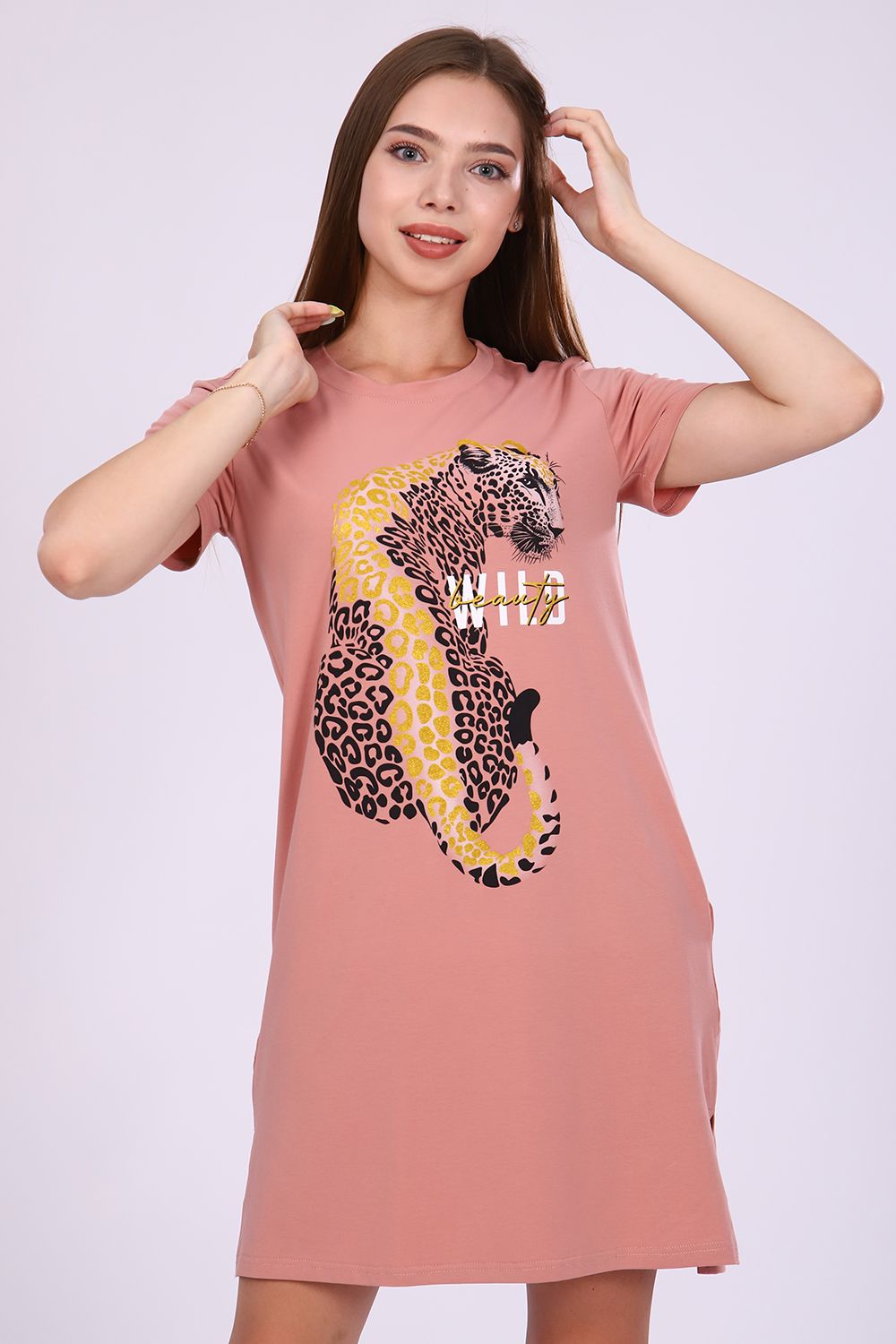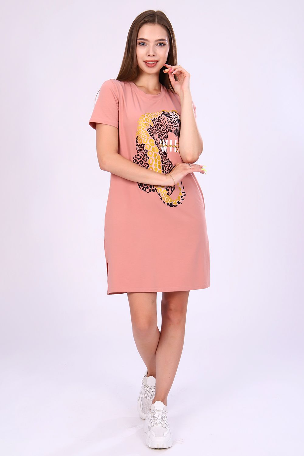 Женское платье-туника длиной чуть выше колена с коротким втачным рукавом, боковыми карманами в шве и небольшими разрезами по бокам внизу. Спереди на полочке расположен принт с глиттером в виде леопарда с надписью "WILD beauty". Округлая горловина обработана обтачкой из основного материала с декоративной отсрочкой по линии втачиваемого воротника. Низ рукавов и низ туники обработан подгибкой. Выполнена из однотонного высококачественного трикотажного полотна - кулирки с лайкрой пенье. Стойкие цвета ткани, яркий принт. Для дома, для дачи, на прогулку, для отдыха, в отпуск, на море. Отличный подарок девушкам к любому поводу!