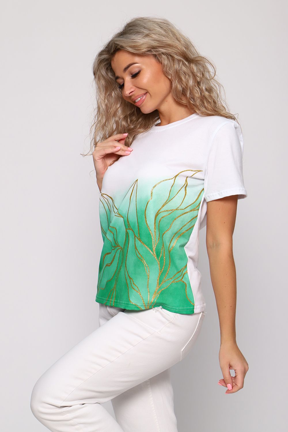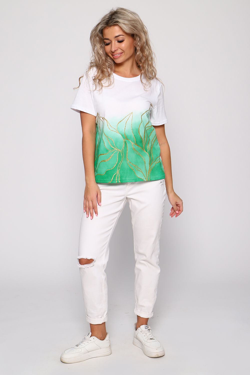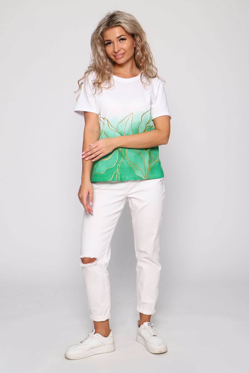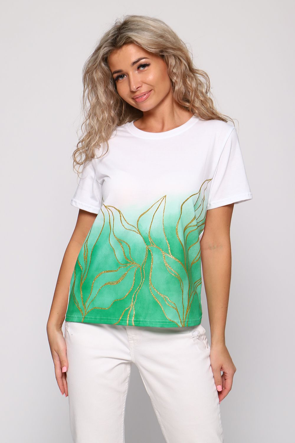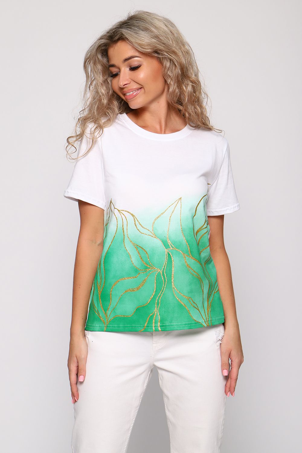 Футболка классического фасона, прямого кроя, с коротким рукавом и округлым вырезом. Декорирована принтом. Универсальная модель футболки отлично подойдет для любого образа и станет необходимой вещью в вашем гардеробе