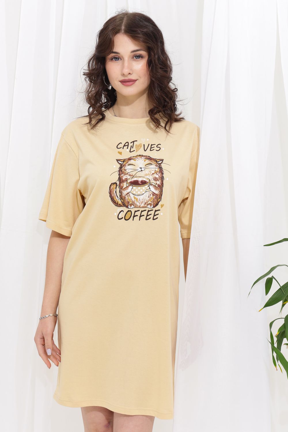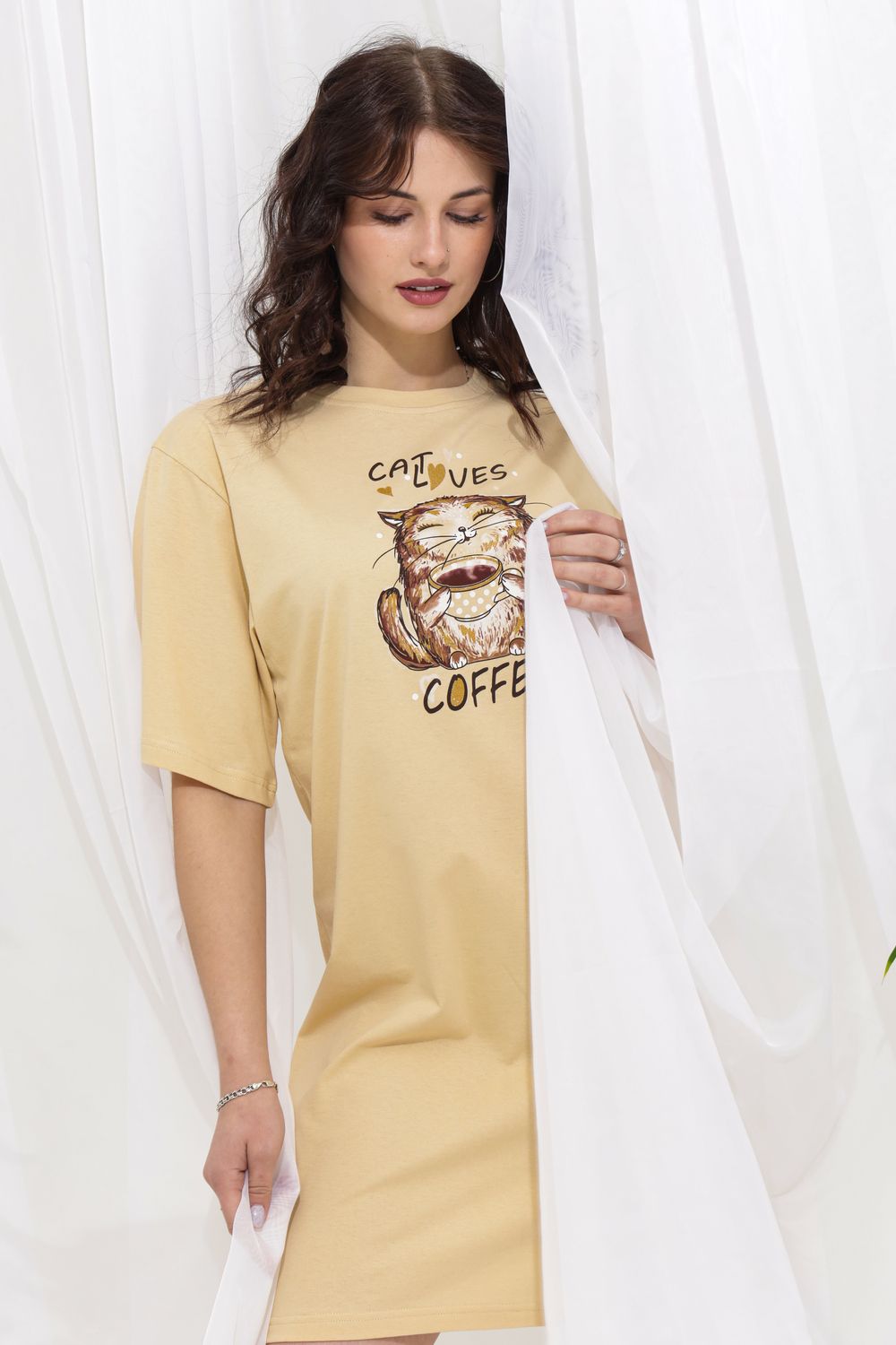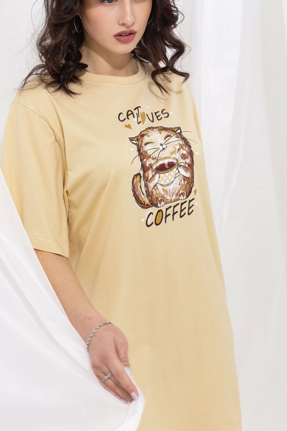 Туника свободного кроя с широкими рукавами. Фасон подходит для всех типов фигуры. Горловина округлой формы обработана втачной планкой. Длина рукава указана от основания шеи. Эта туника может использоваться в качестве ночной сорочки. Оригинальный принт-весёлый добрый кот.