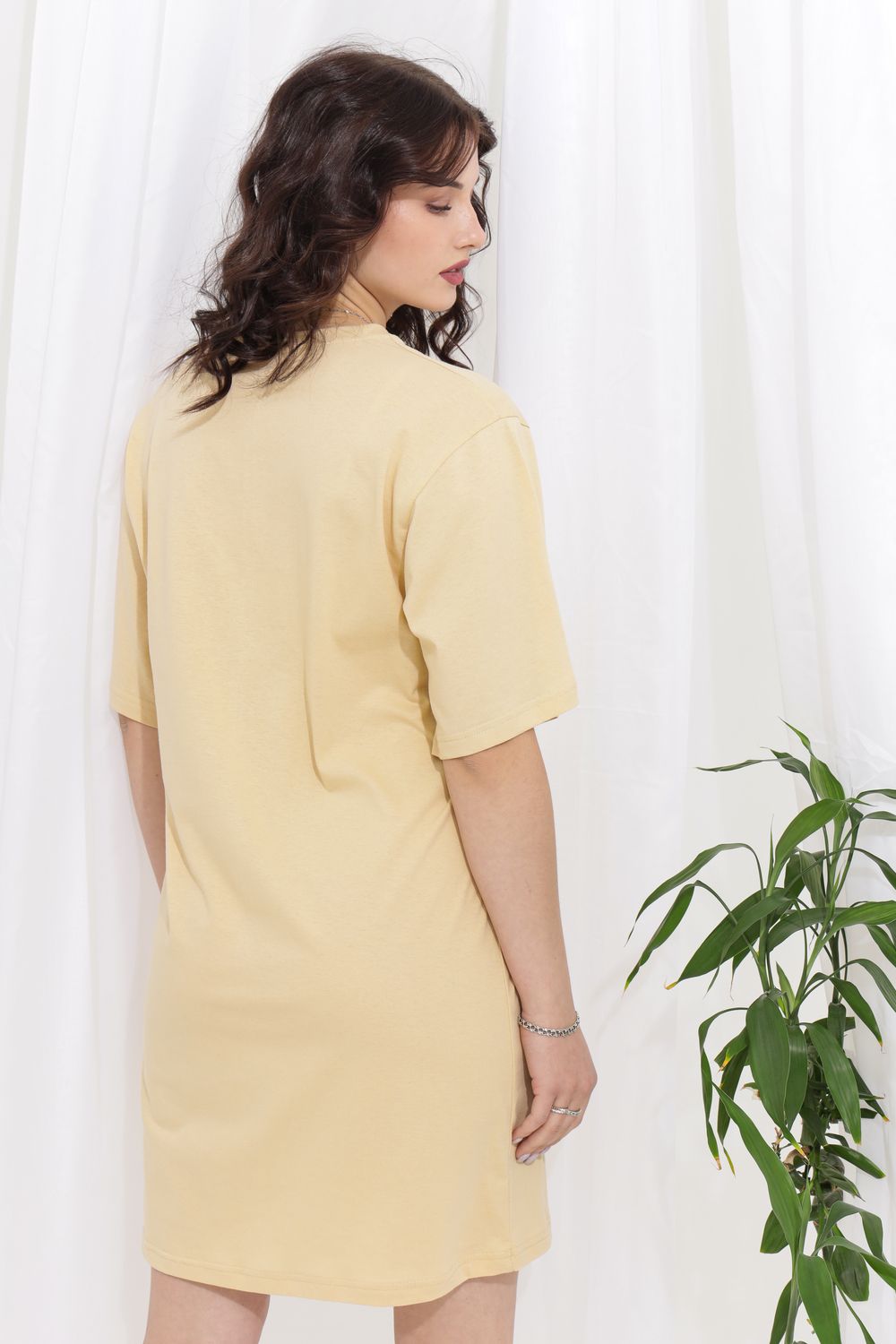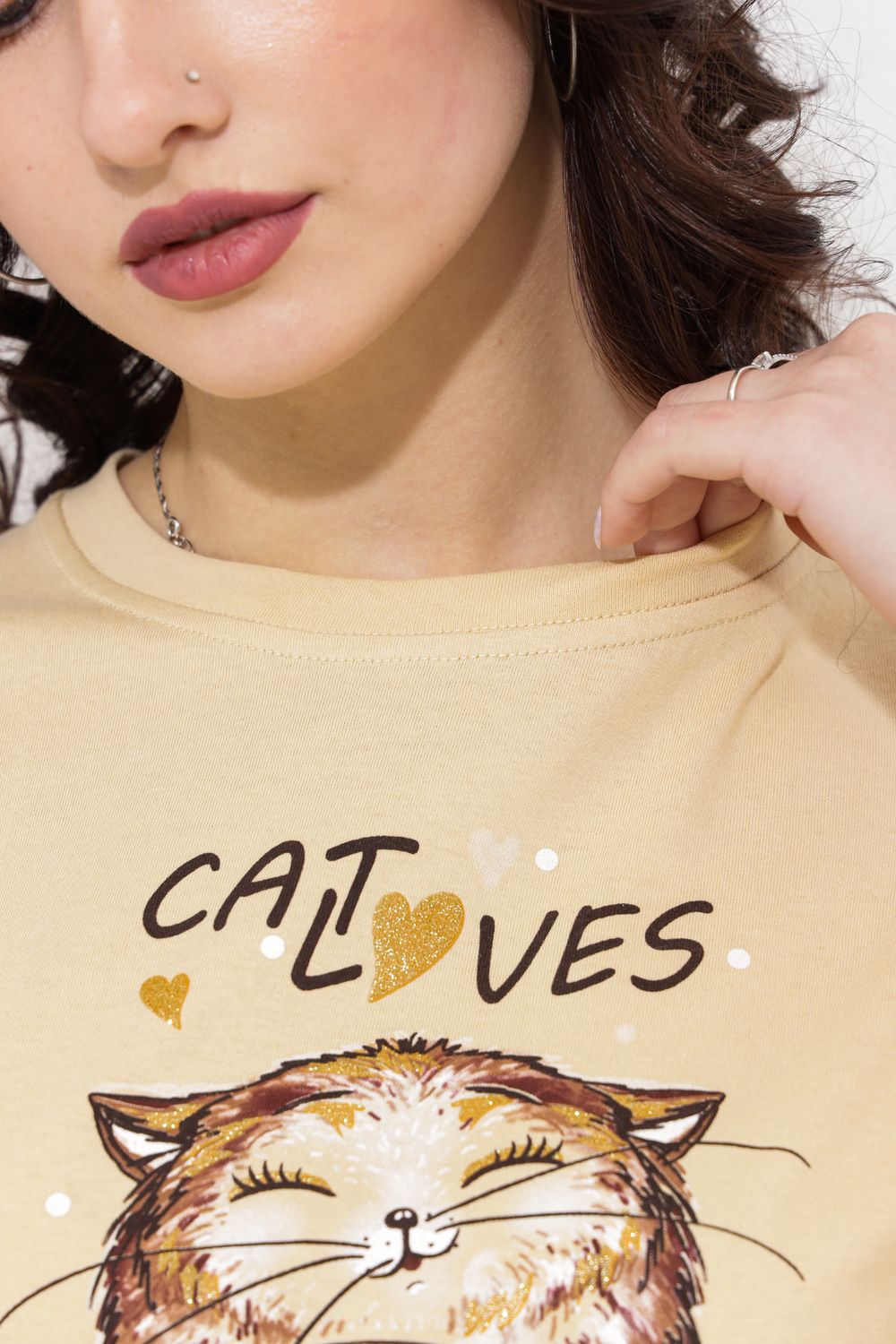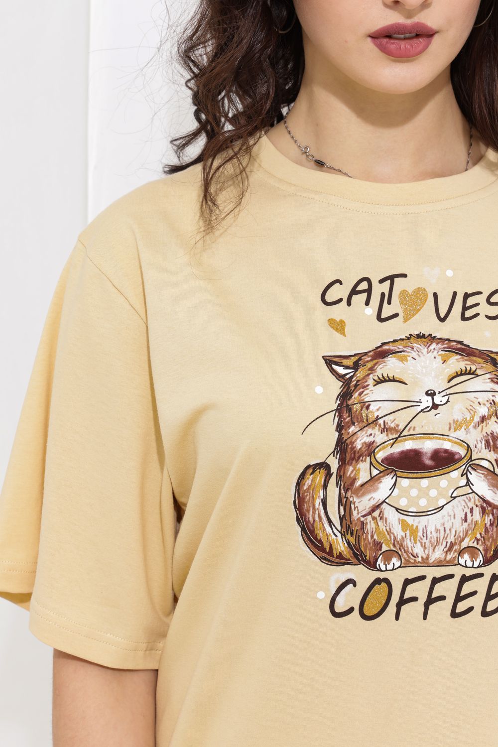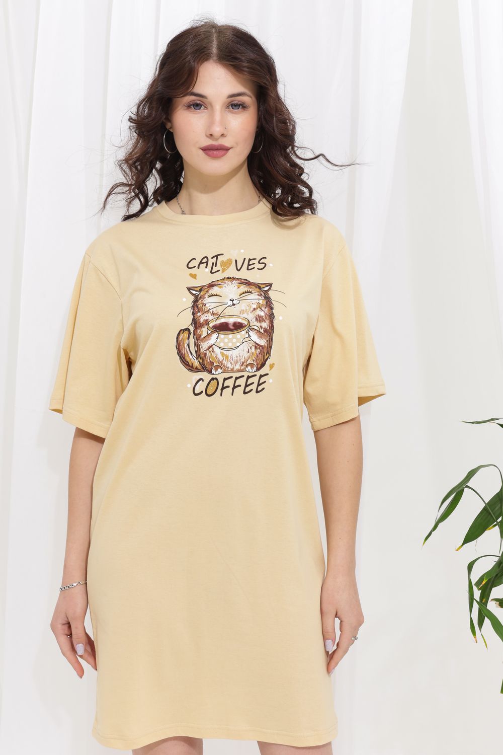 Туника свободного кроя с широкими рукавами. Фасон подходит для всех типов фигуры. Горловина округлой формы обработана втачной планкой. Длина рукава указана от основания шеи. Эта туника может использоваться в качестве ночной сорочки. Оригинальный принт-весёлый добрый кот.