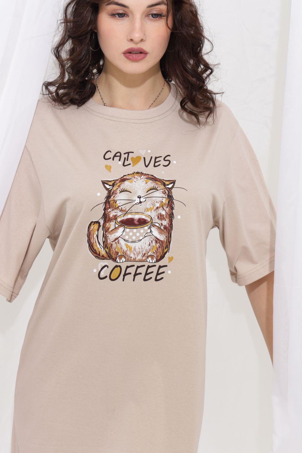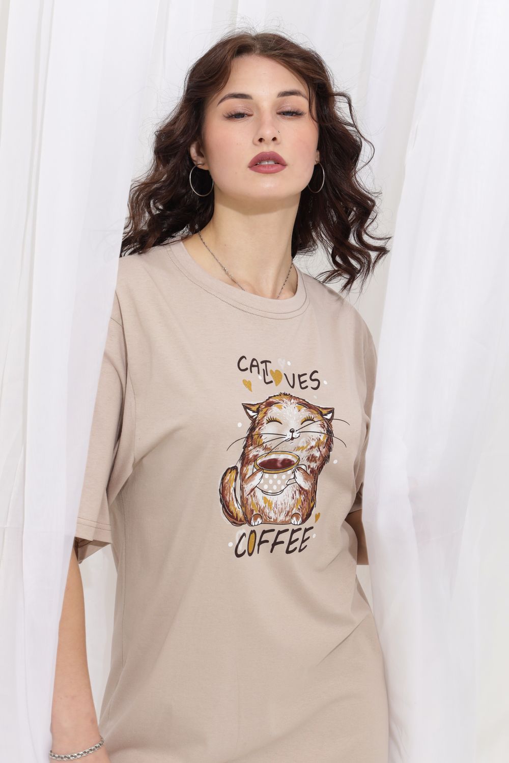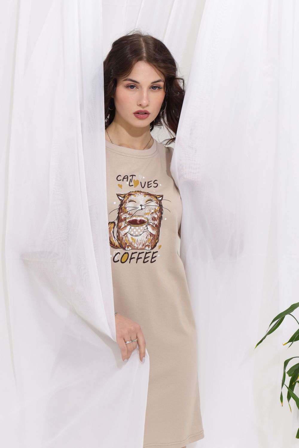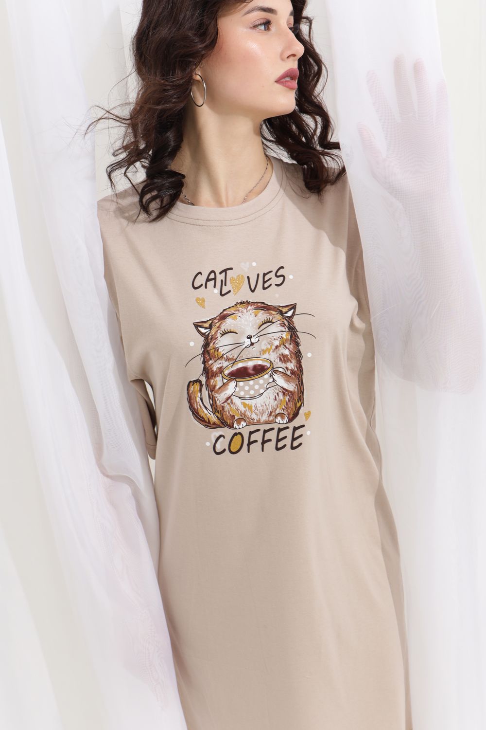 Туника свободного кроя с широкими рукавами. Фасон подходит для всех типов фигуры. Горловина округлой формы обработана втачной планкой. Длина рукава указана от основания шеи. Эта туника может использоваться в качестве ночной сорочки. Оригинальный принт-весёлый добрый кот.