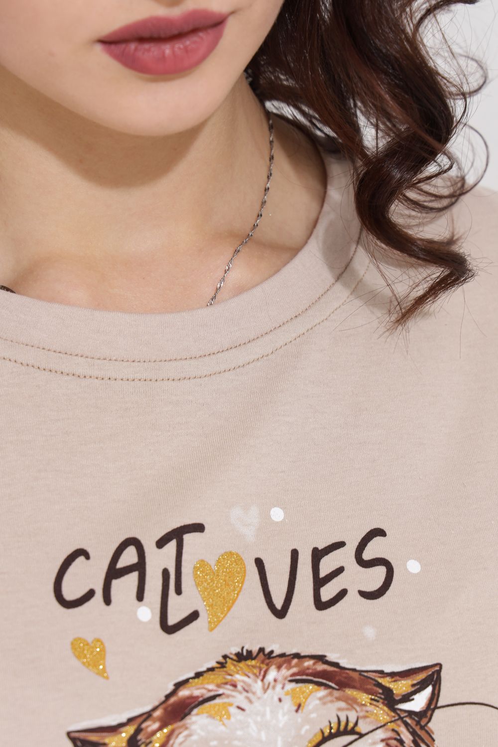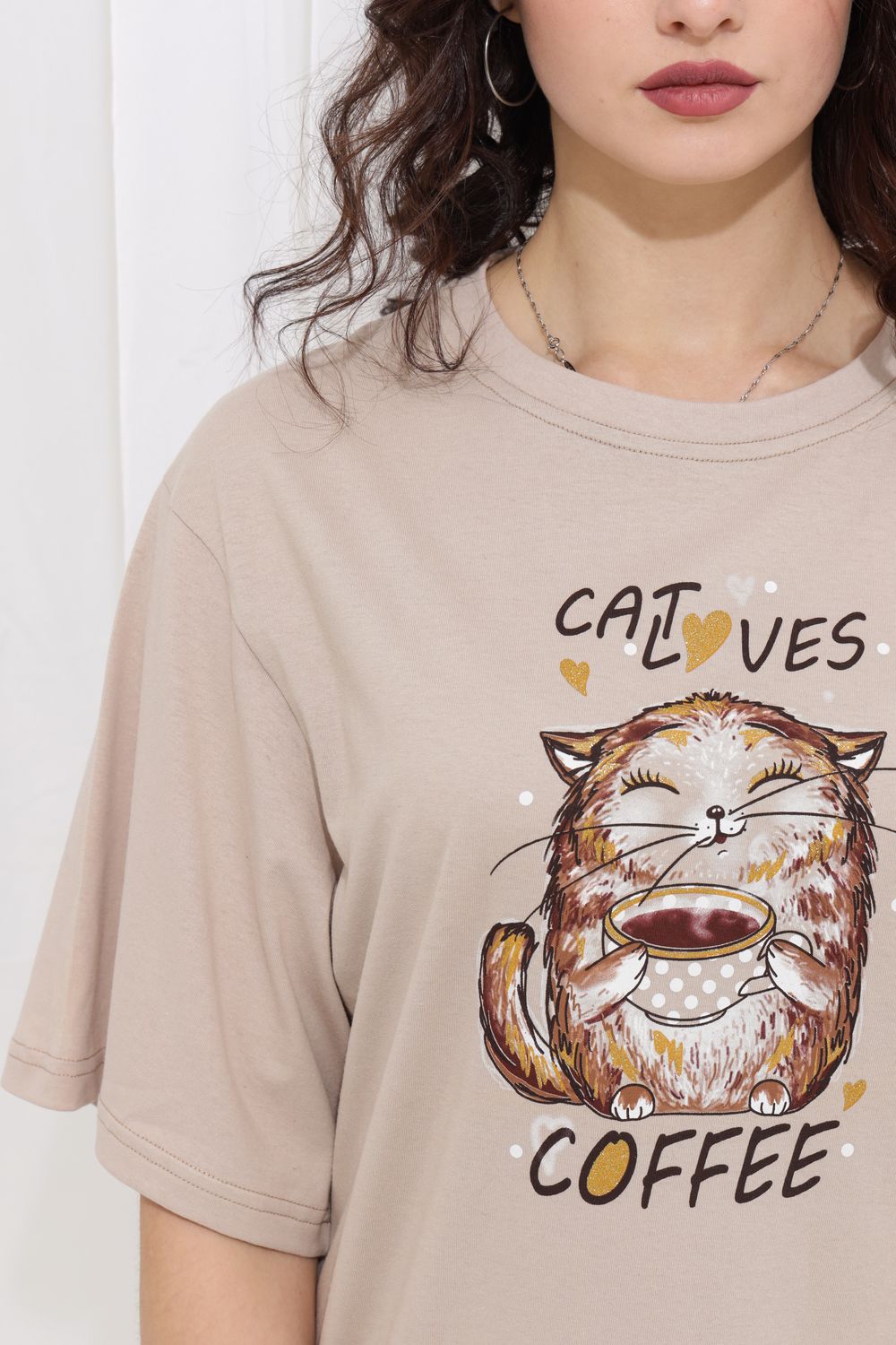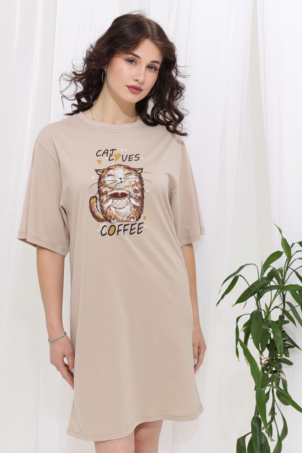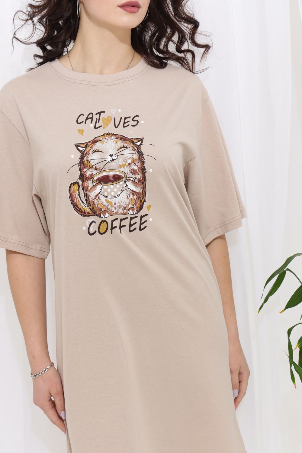 Туника свободного кроя с широкими рукавами. Фасон подходит для всех типов фигуры. Горловина округлой формы обработана втачной планкой. Длина рукава указана от основания шеи. Эта туника может использоваться в качестве ночной сорочки. Оригинальный принт-весёлый добрый кот.