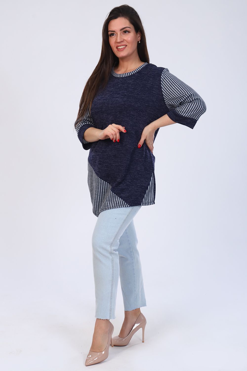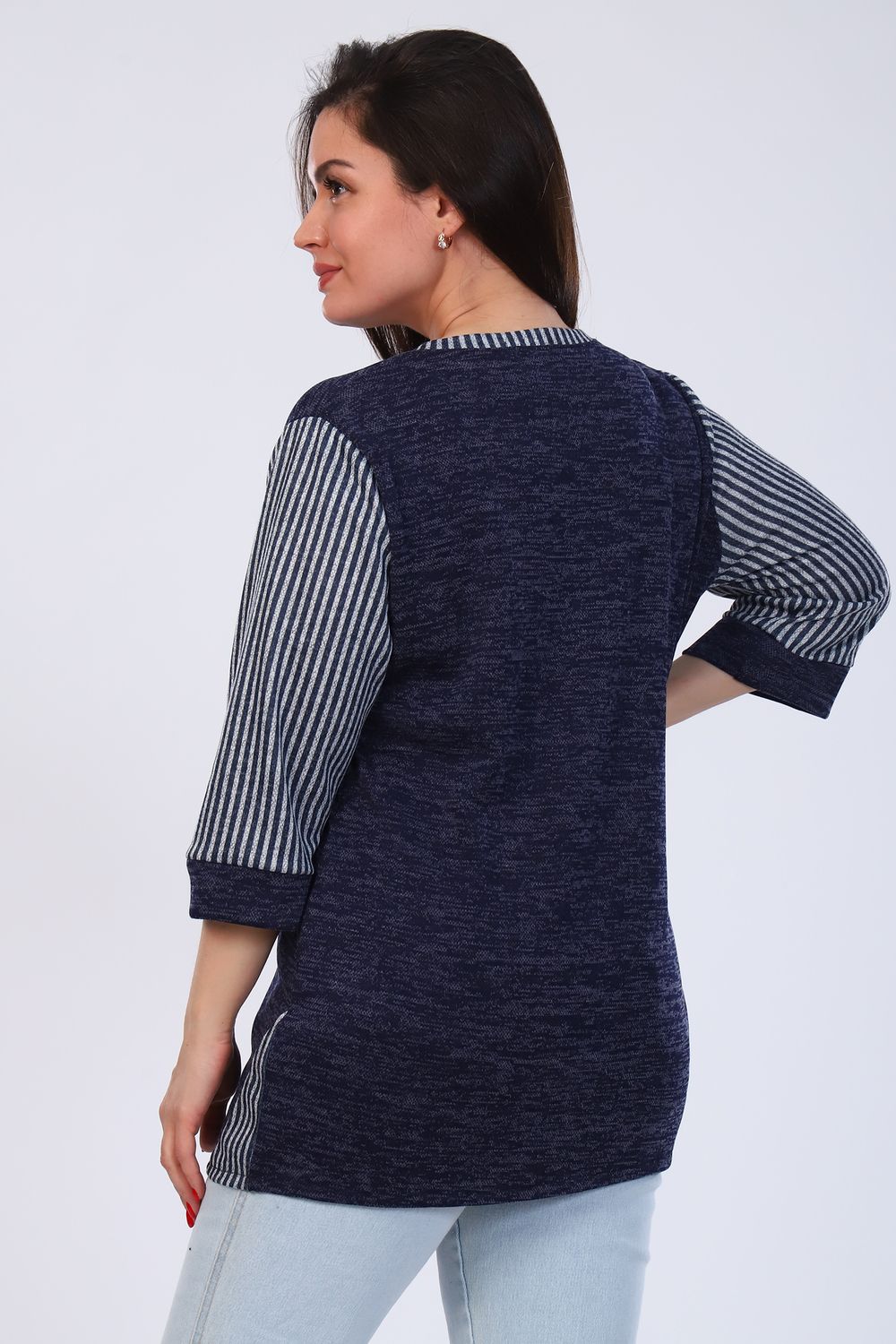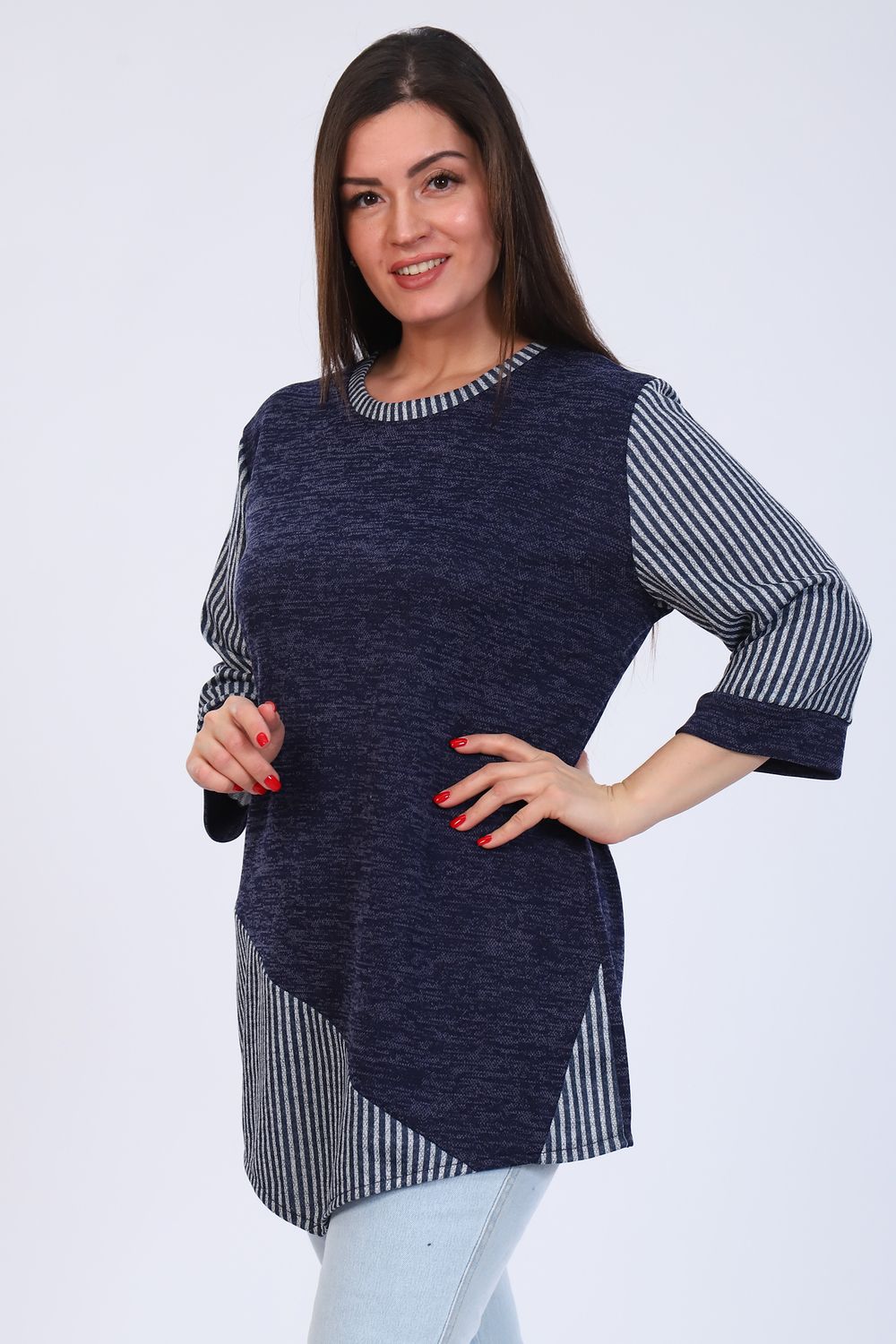 Туника прямого покроя. Округлая горловина отделана кантиком, рукав 3/4 на манжете, передняя полочка удлиненная.